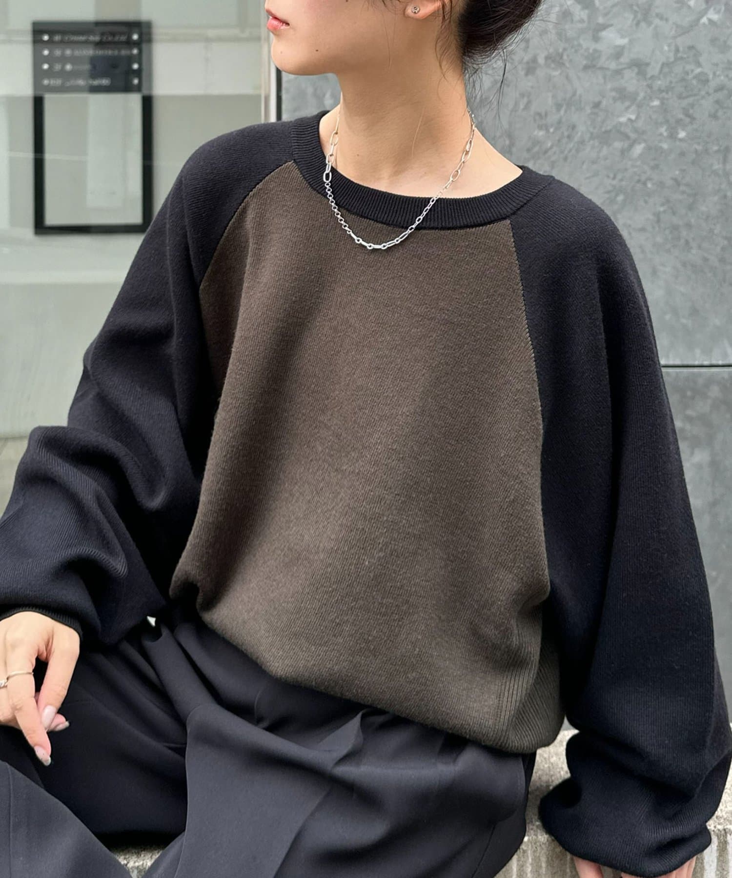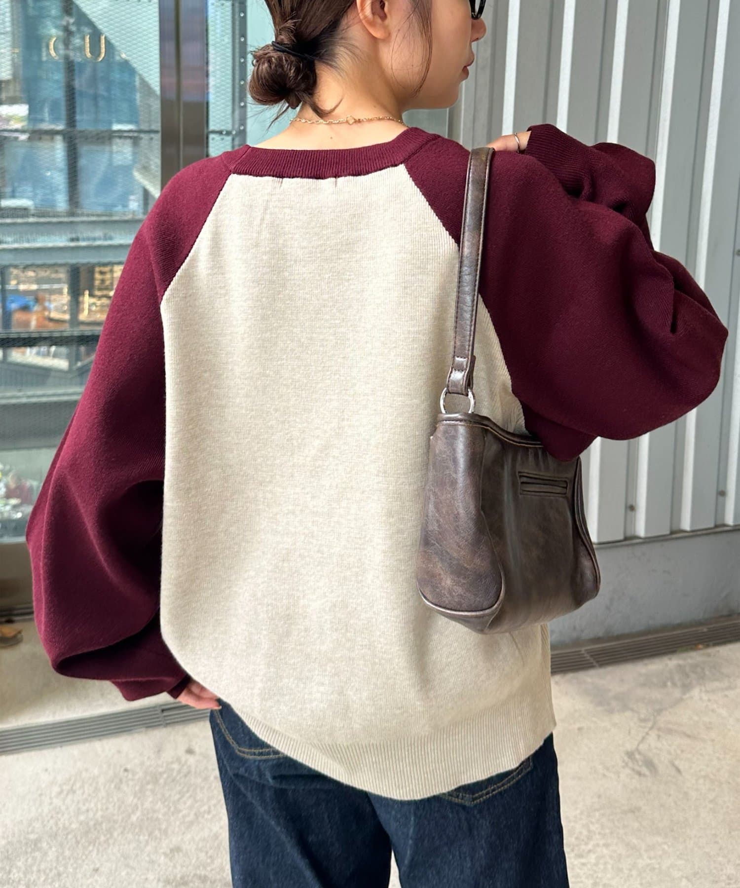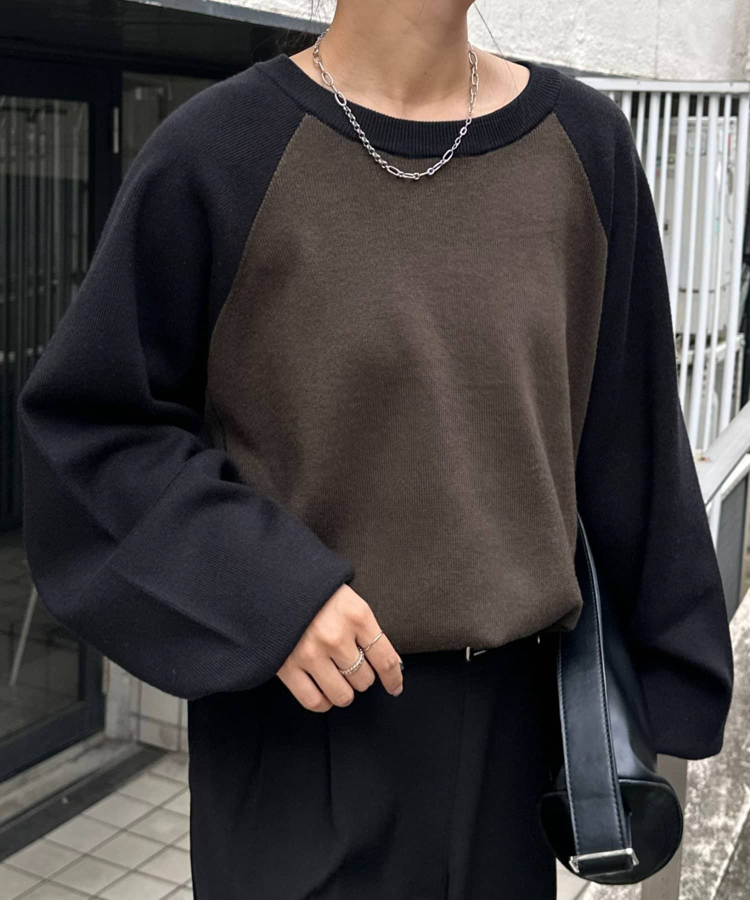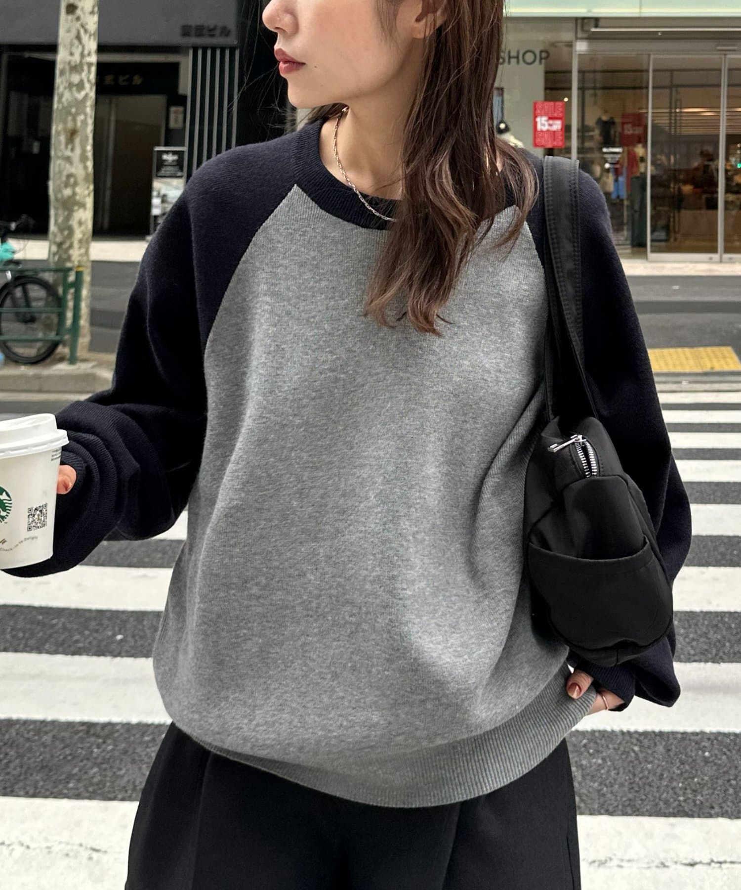 配色の切り替えが目を引く、ラグランスリーブデザインのニットプルオーバー。