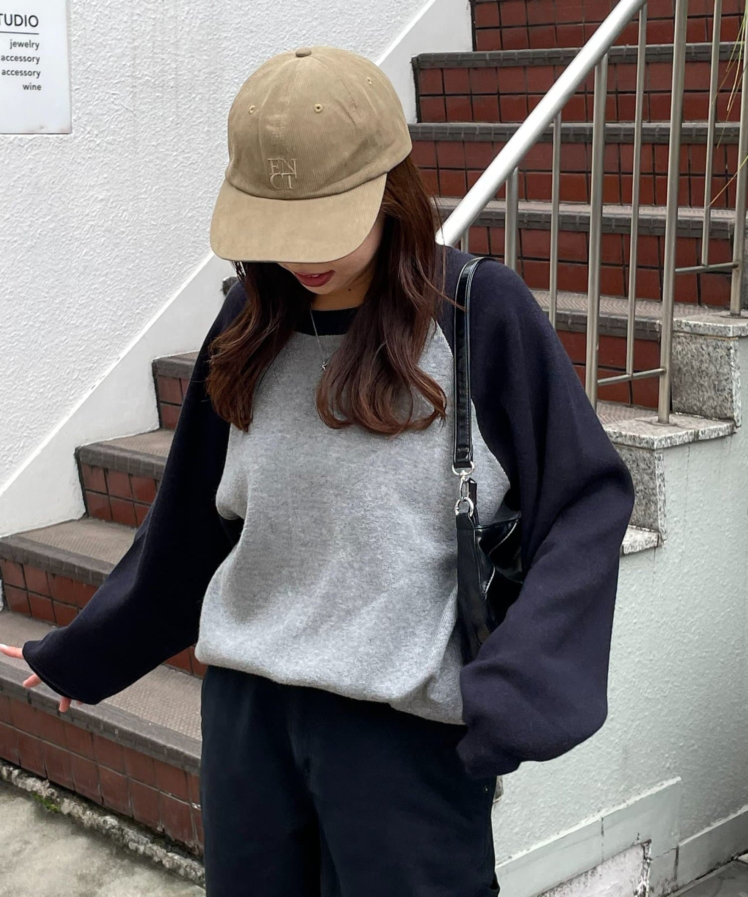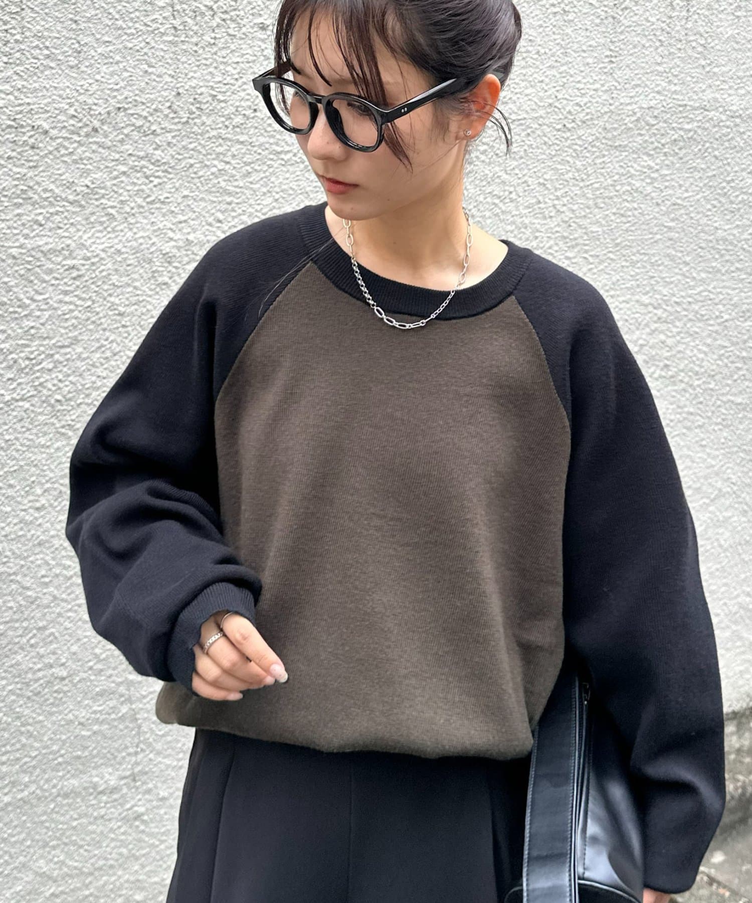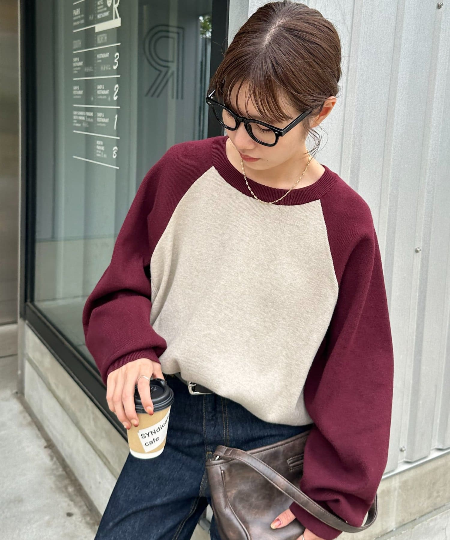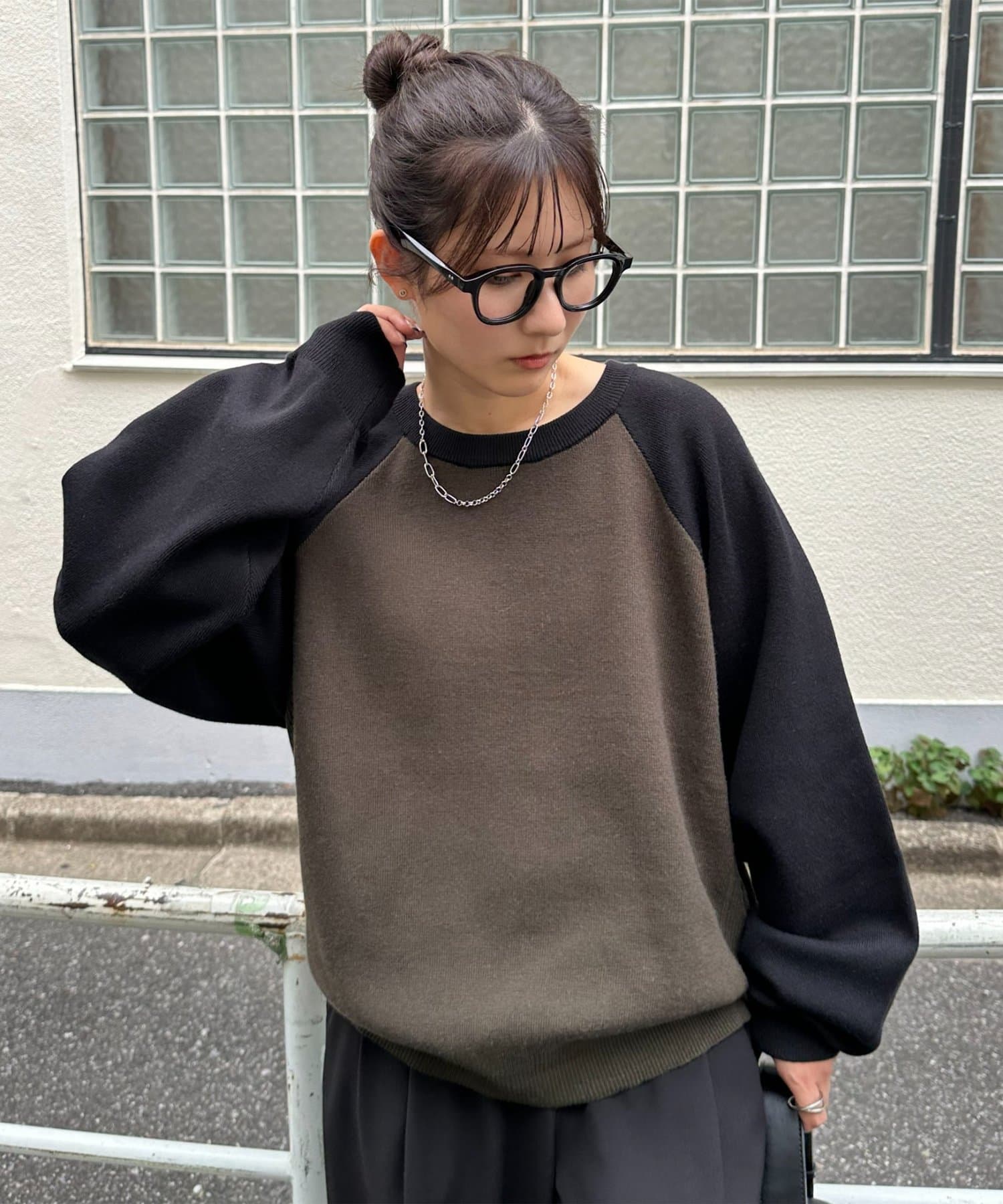 配色の切り替えが目を引く、ラグランスリーブデザインのニットプルオーバー。