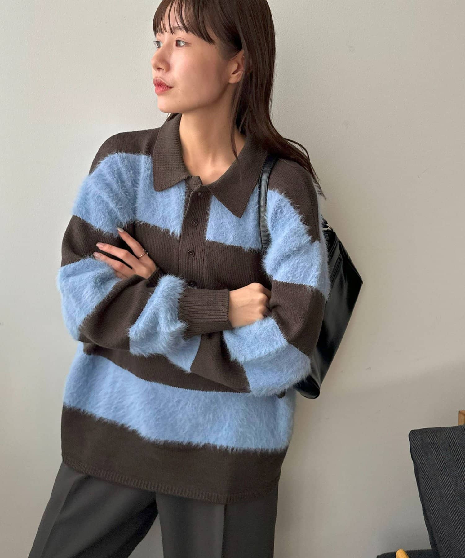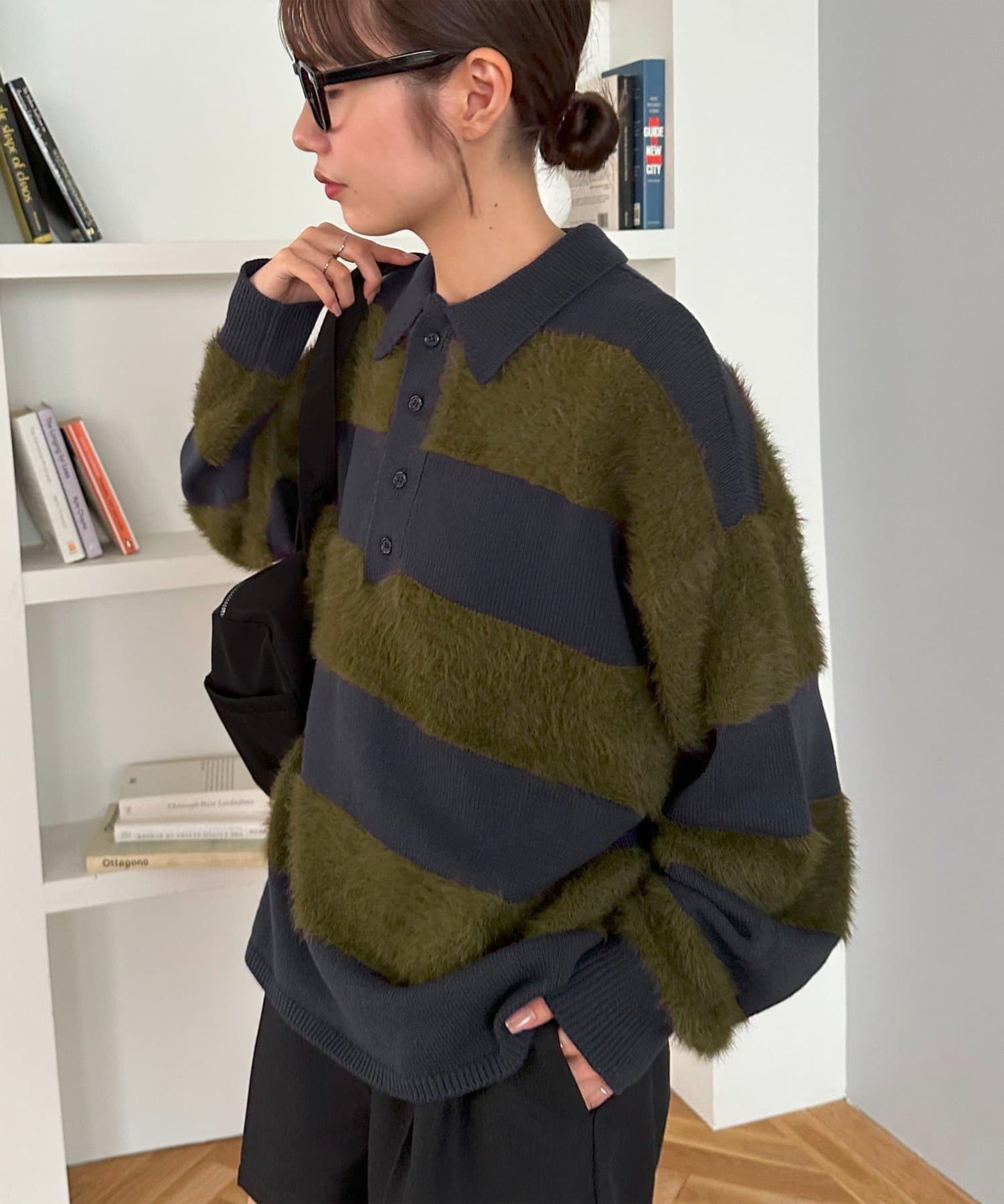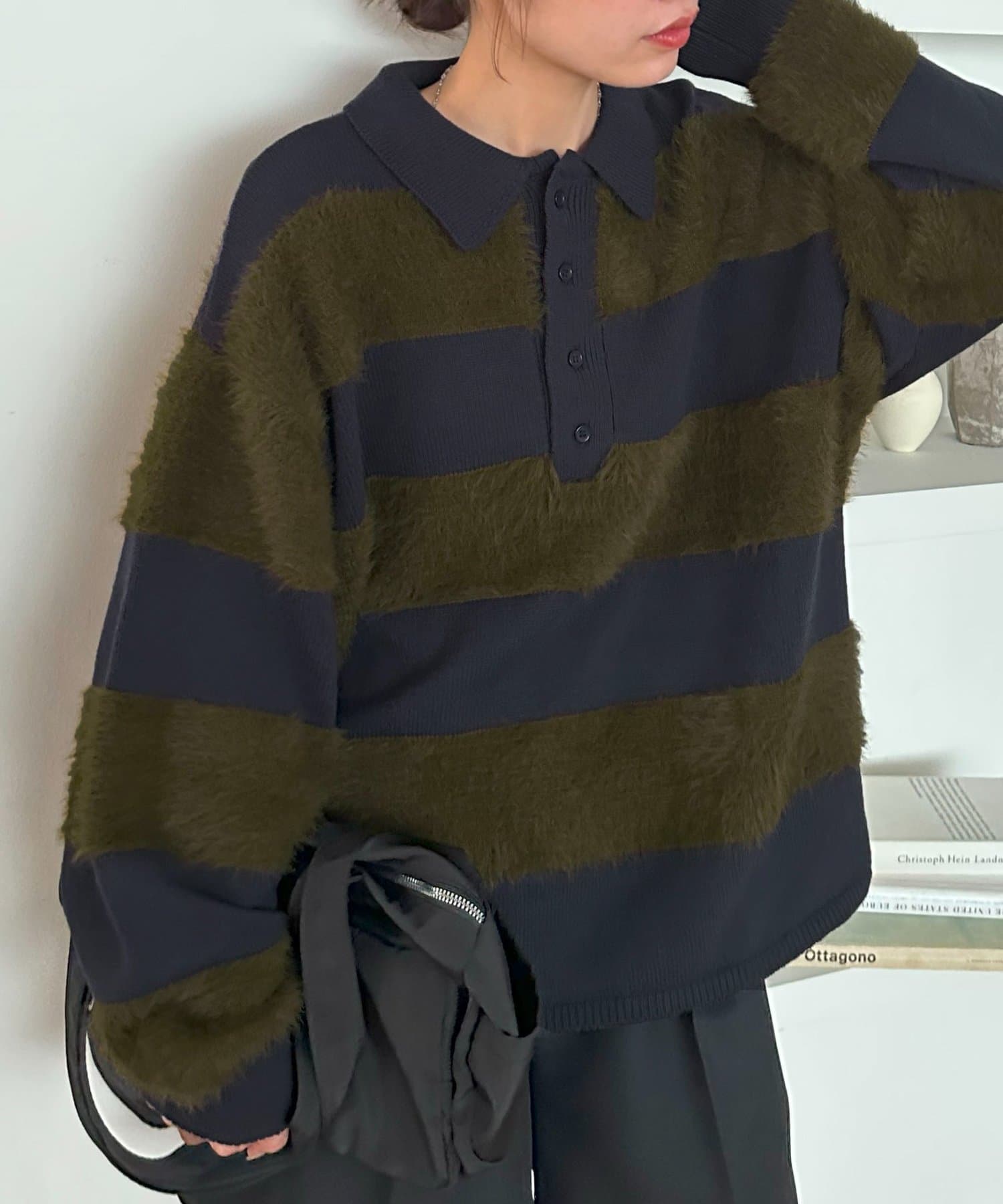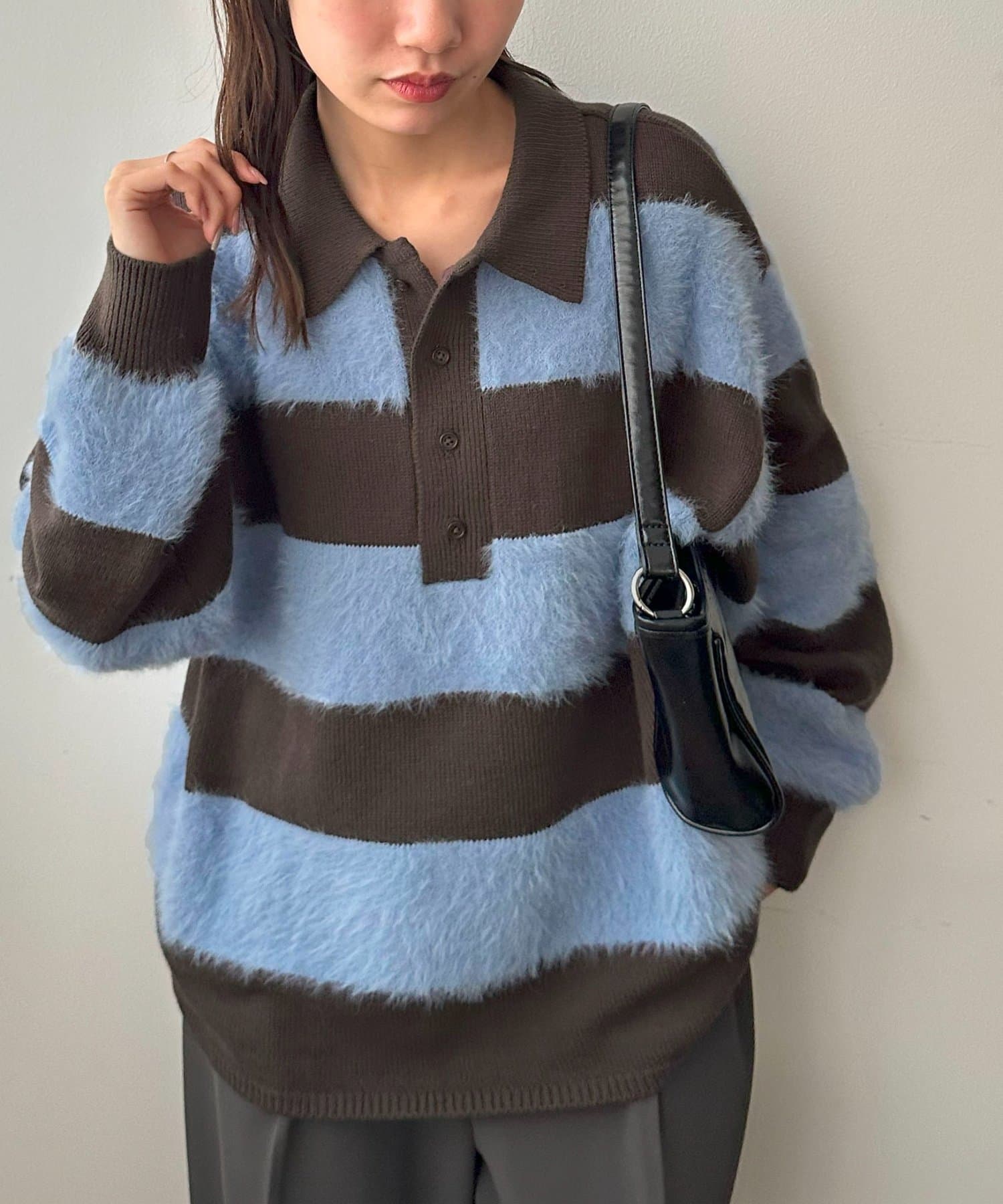 ふわっと柔らか、存在感のあるシャギーワイドボーダーニットポロ