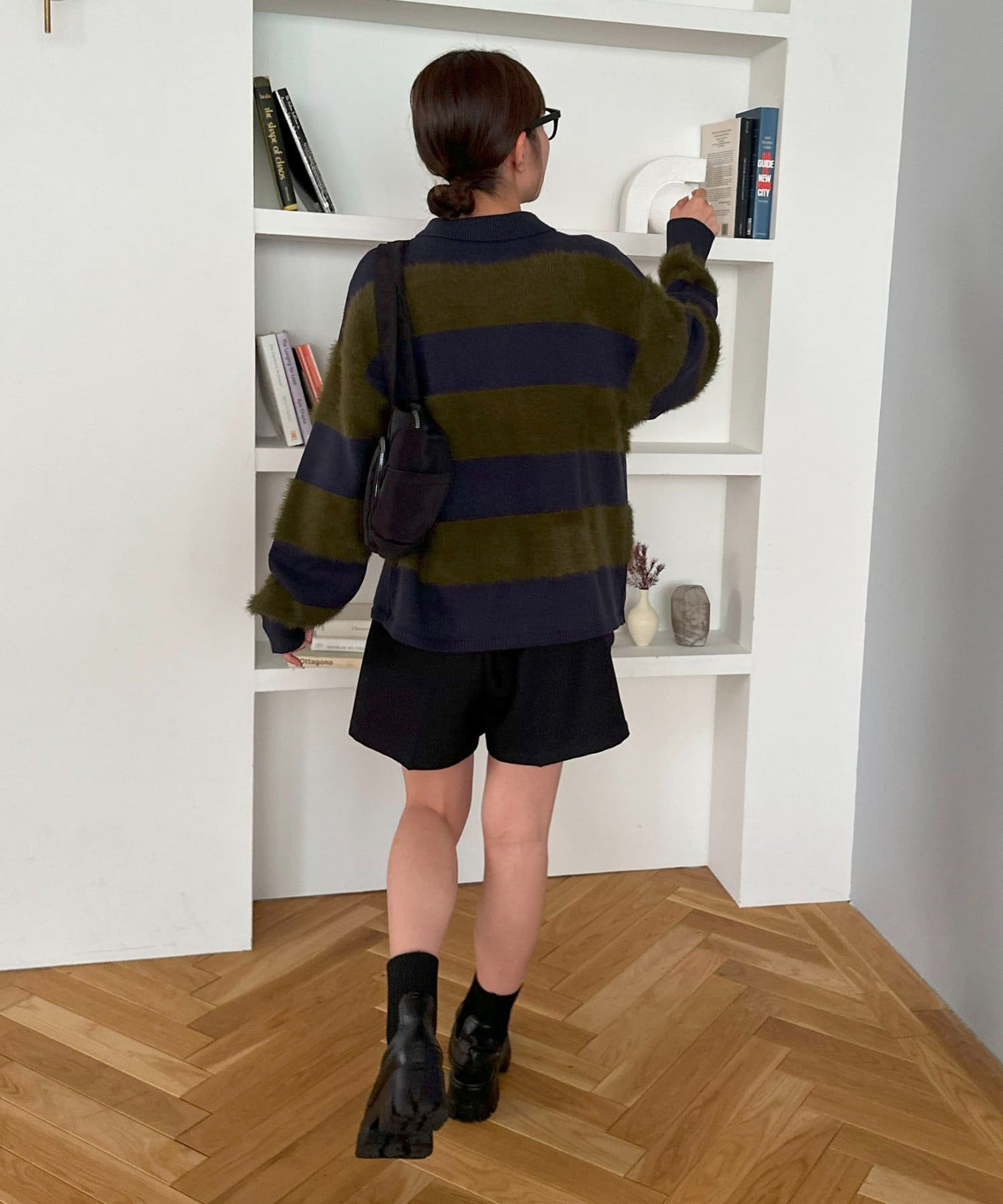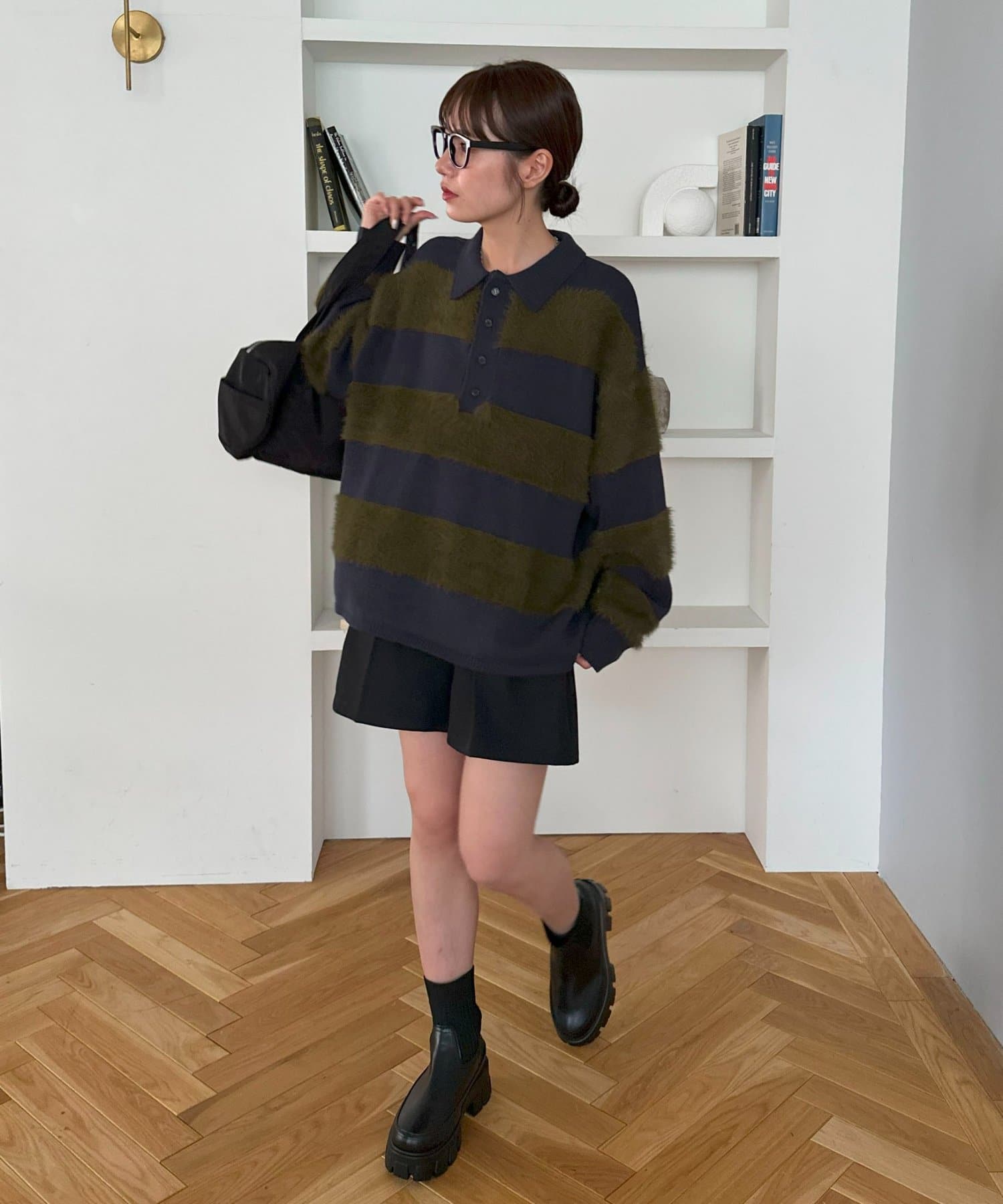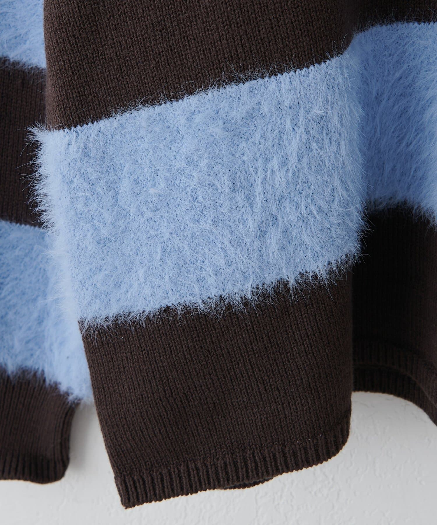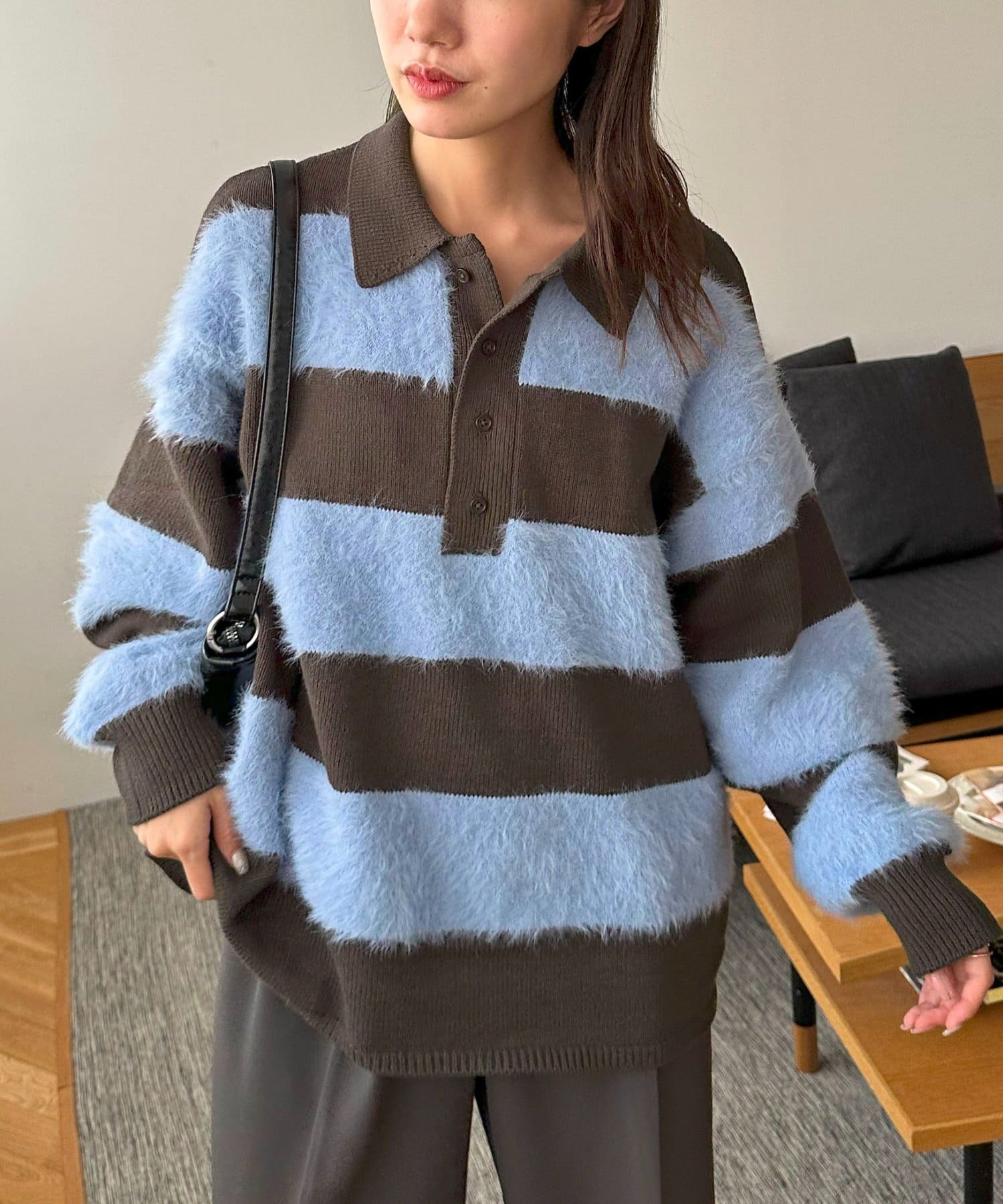 ふわっと柔らか、存在感のあるシャギーワイドボーダーニットポロ