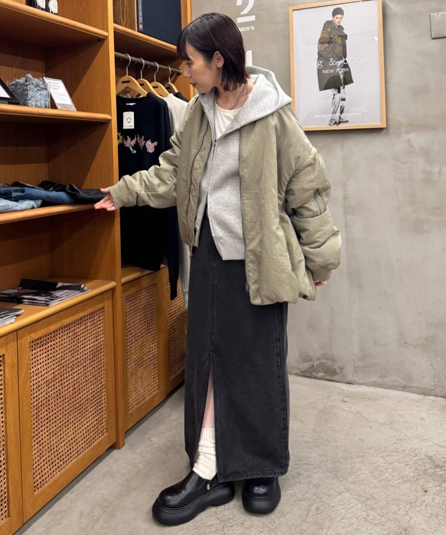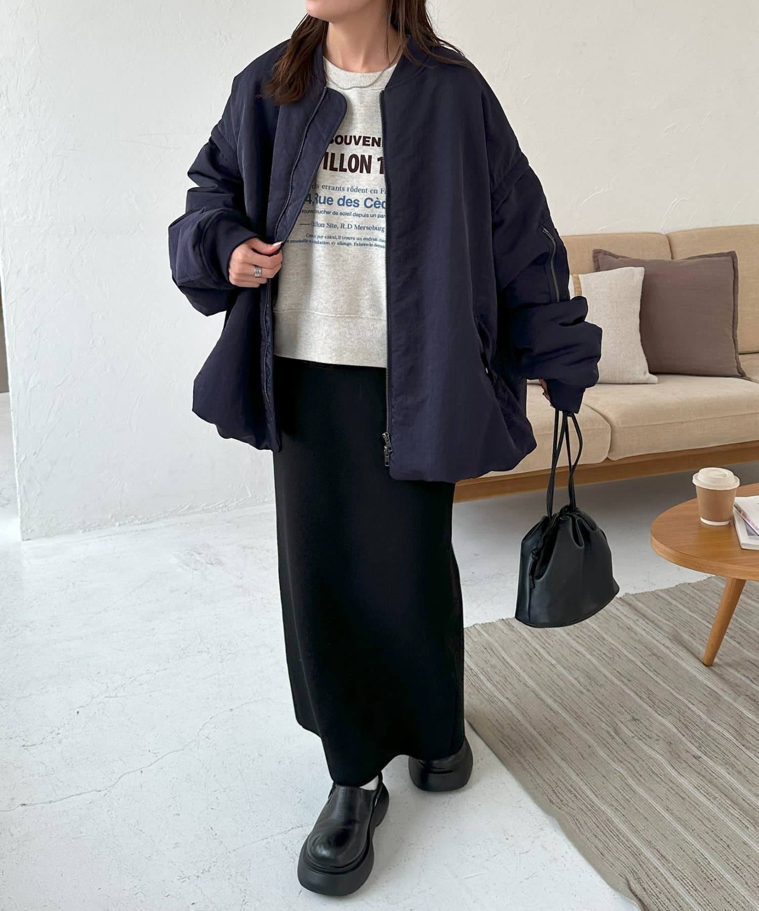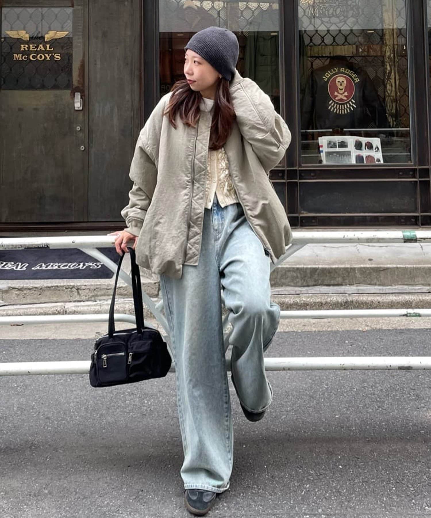 ゆったるとしたサイズなので、ボリューム感のあるニットやスウェットとの相性抜群!