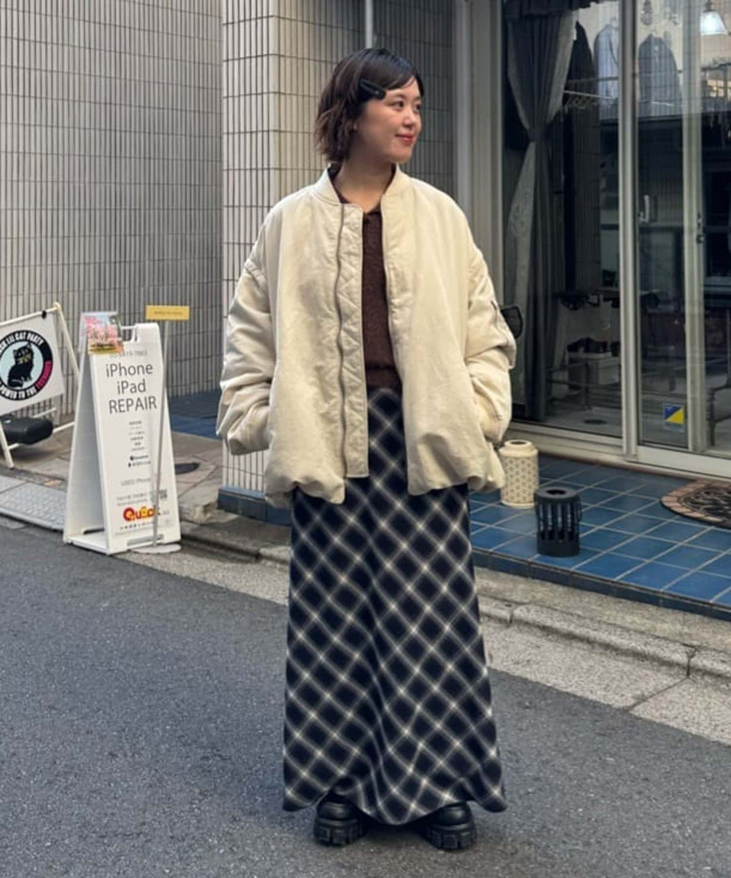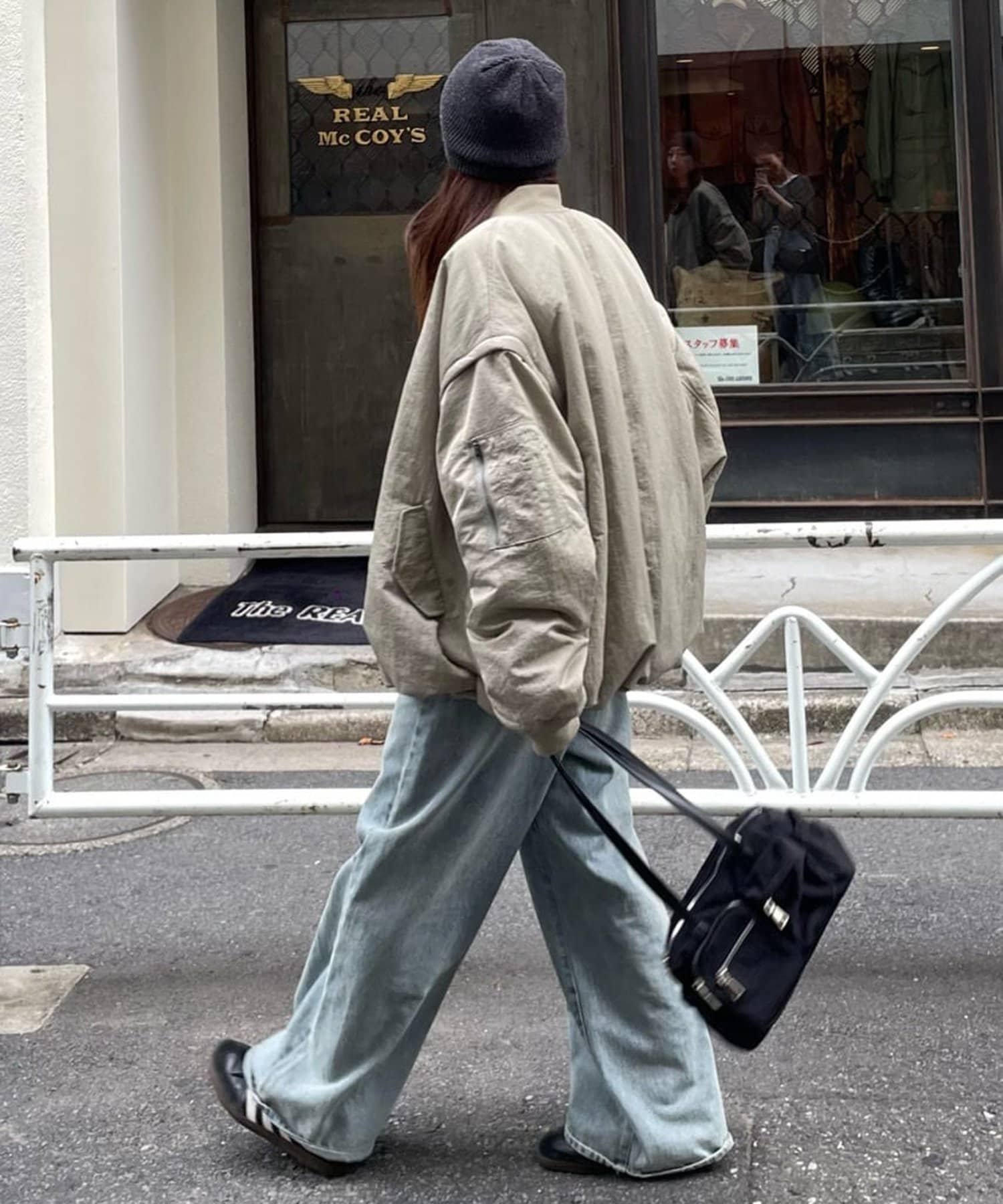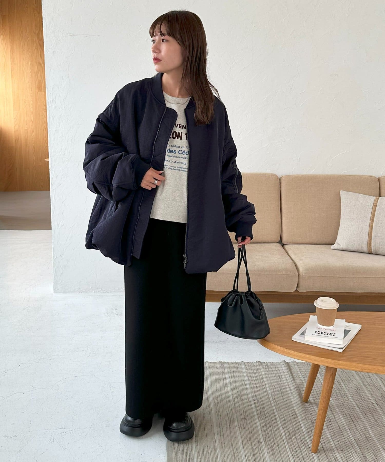 ゆったるとしたサイズなので、ボリューム感のあるニットやスウェットとの相性抜群!