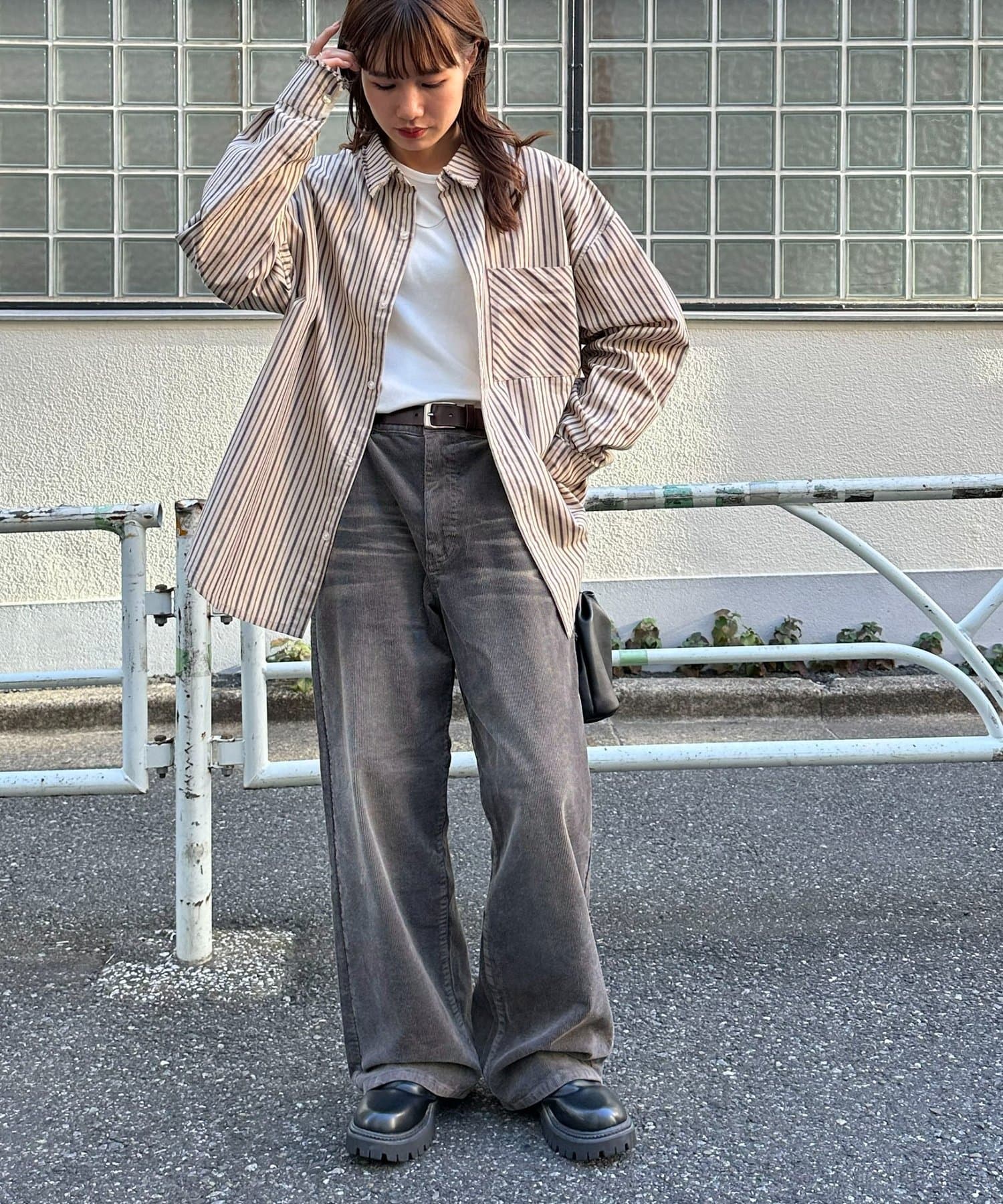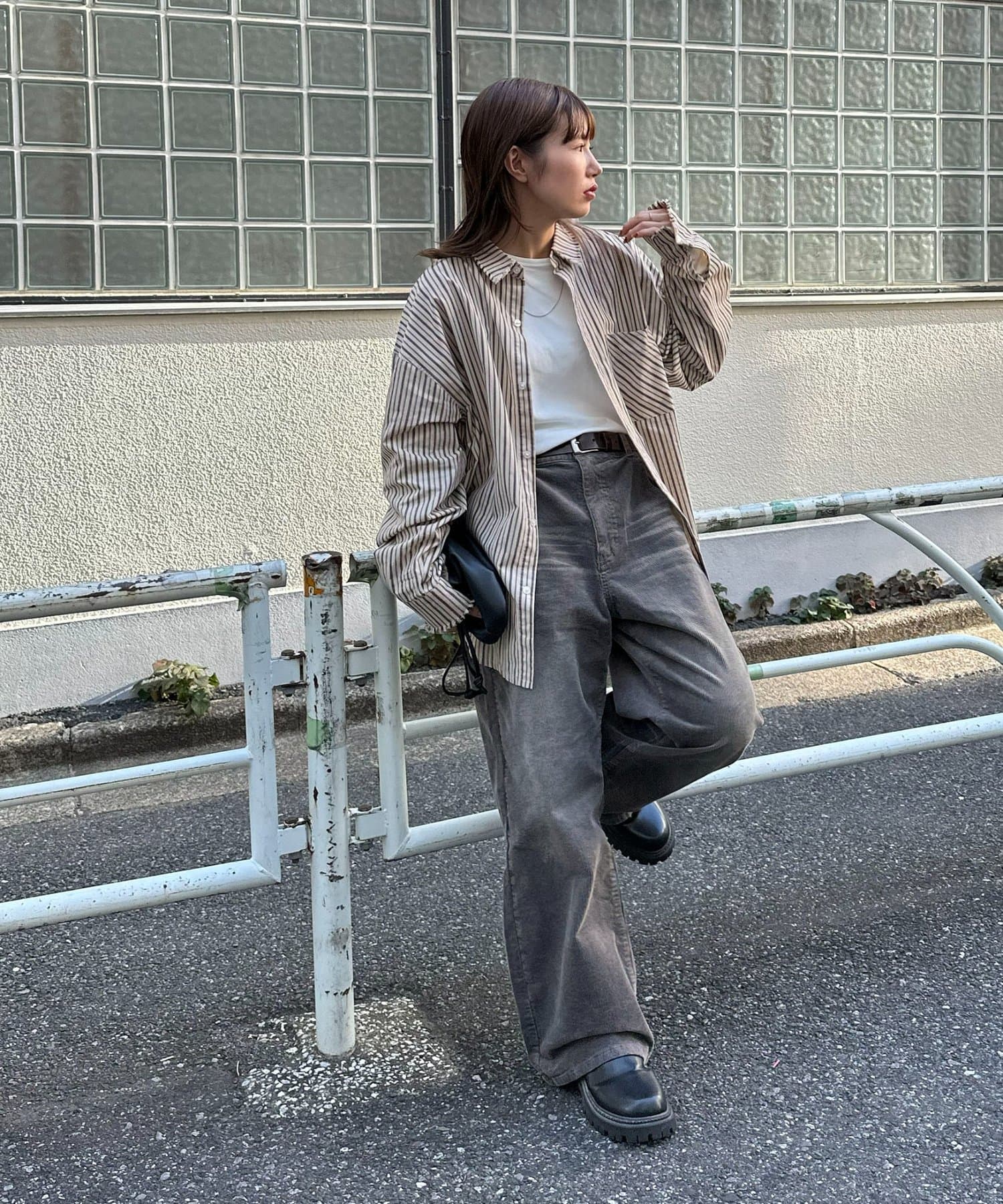 コンパクトなカーディガンやシャツと合わせたキレイメコーデに合わせてもモードな雰囲気をプラスします◎
