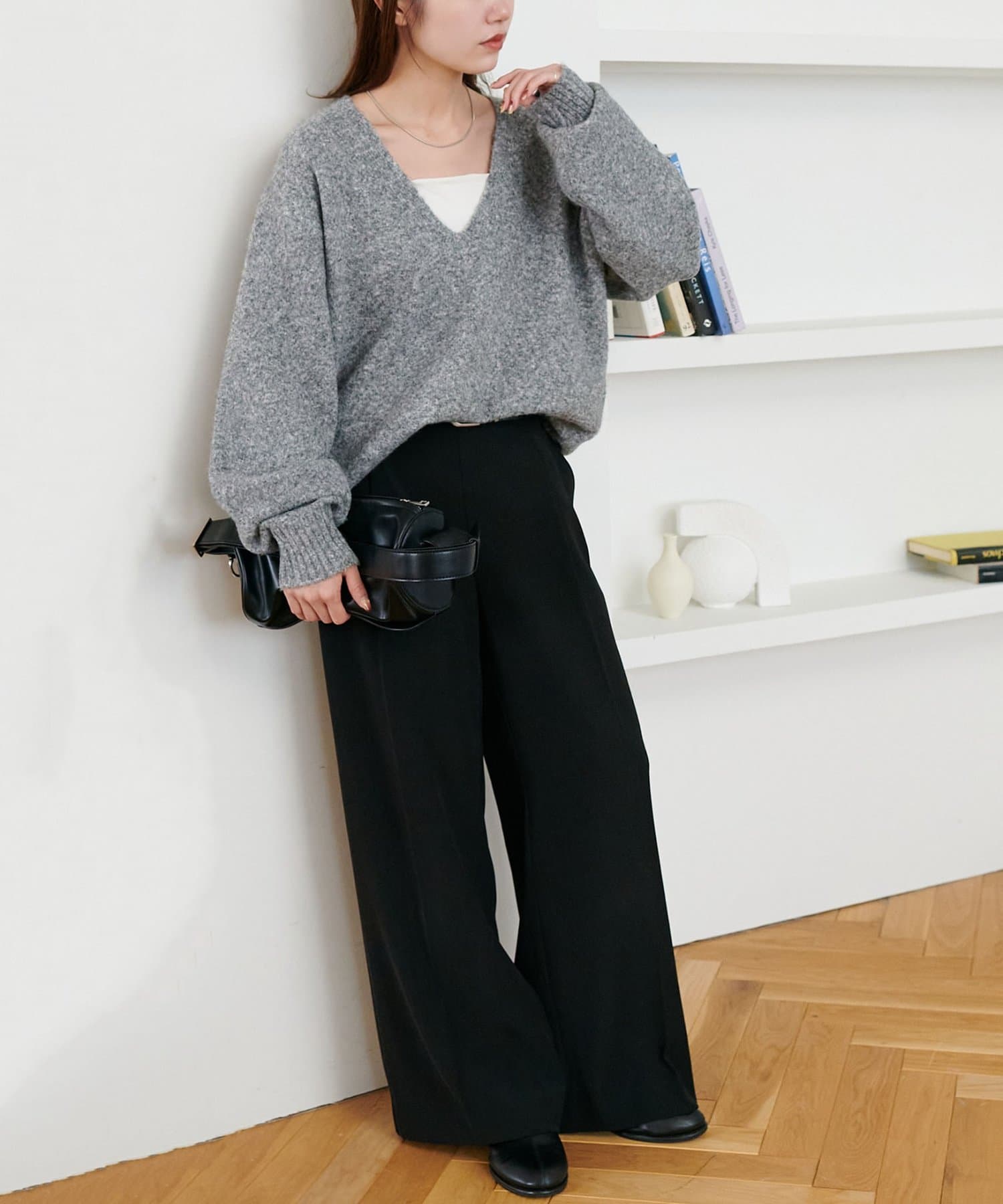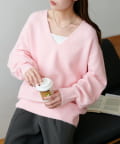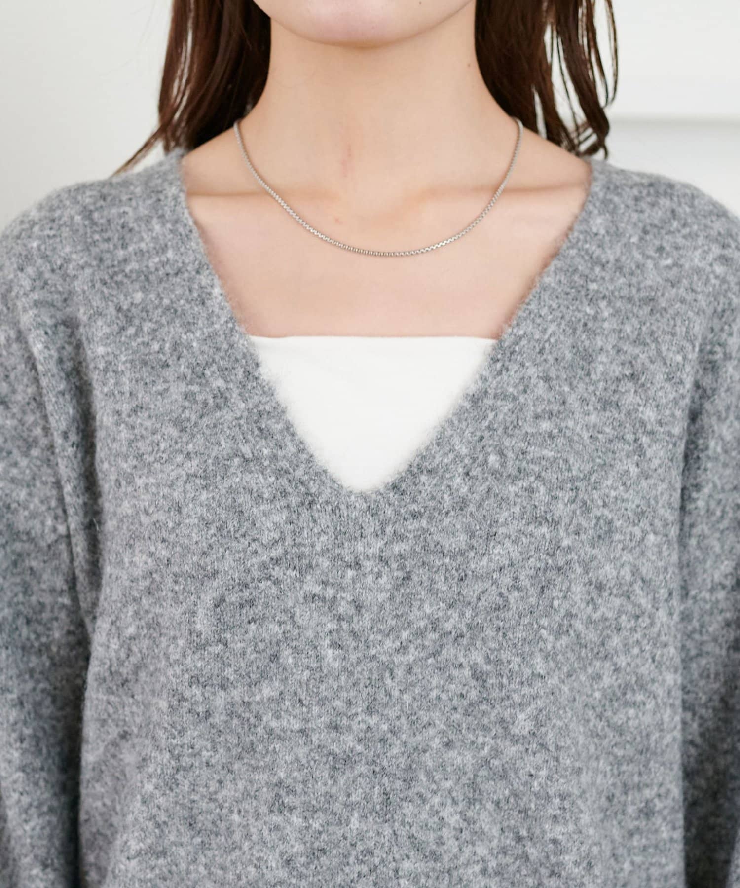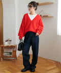 深めのVネックラインが顔まわりをすっきりと見せ、抜け感のあるスタイルに仕上げます。