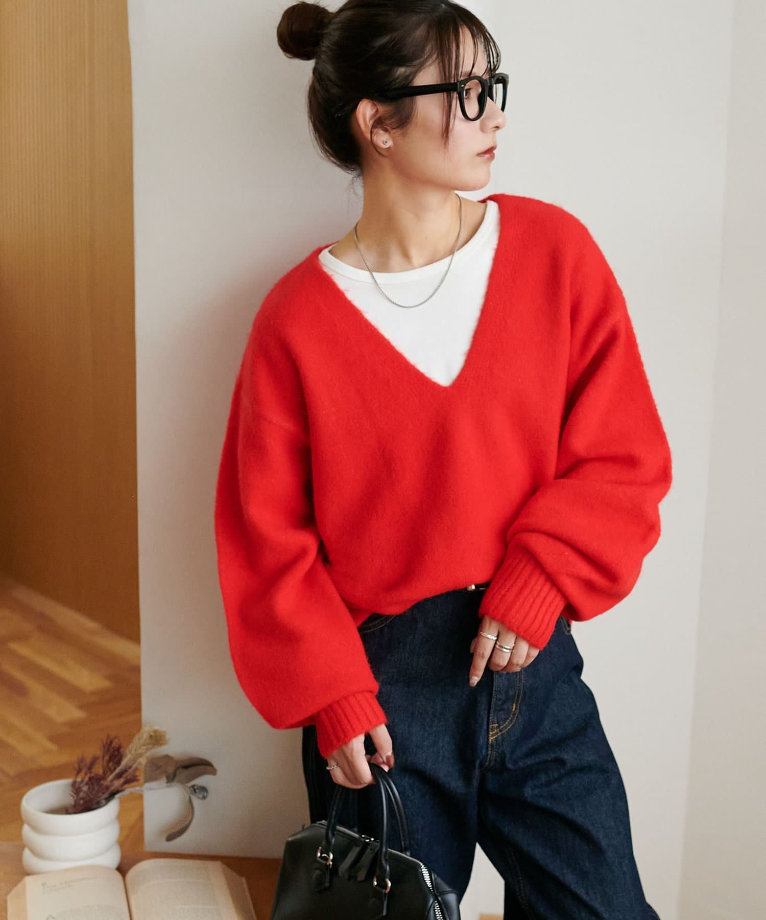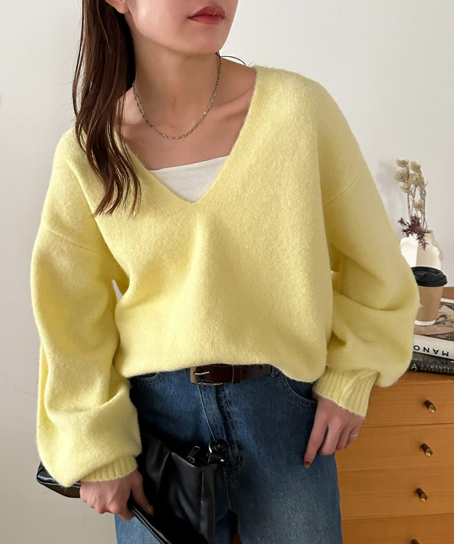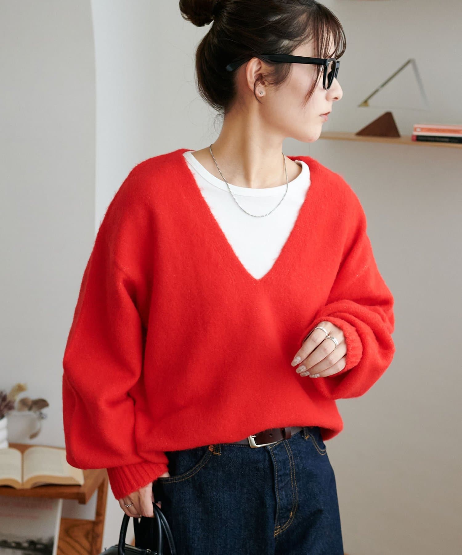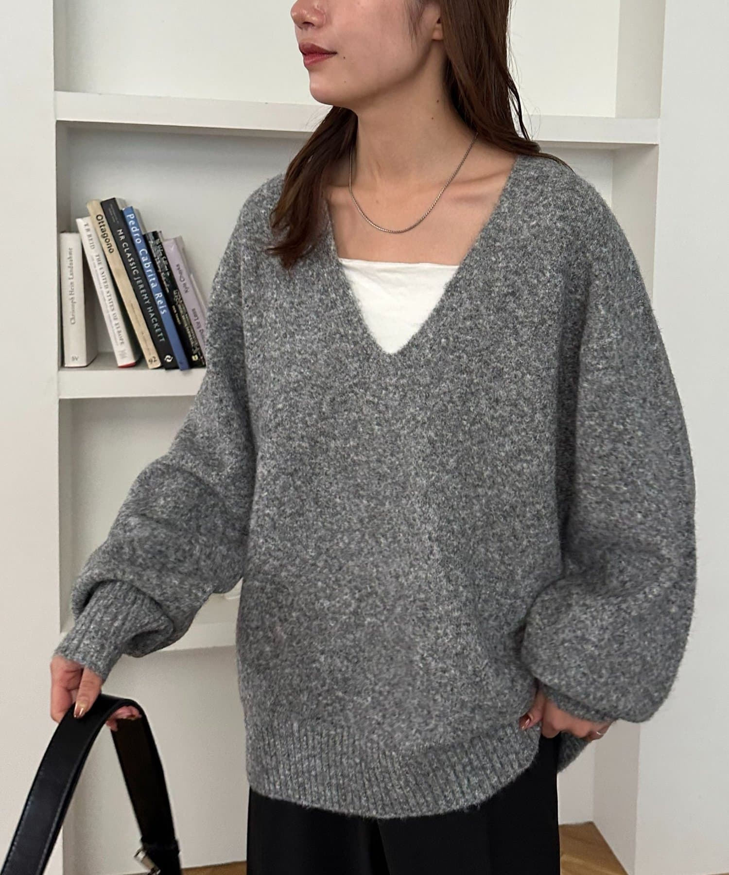 ふんわりシャギーが包み込む、抜け感たっぷりの深Vシャギーニット