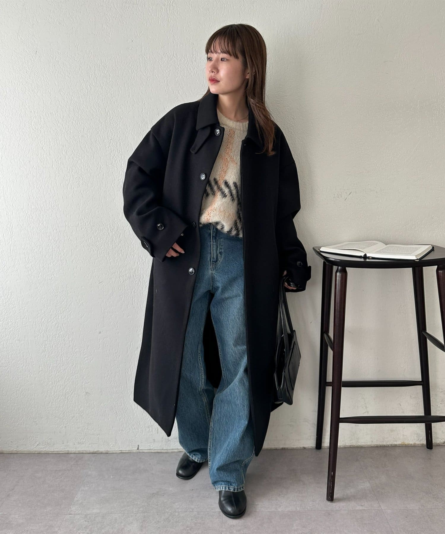 オーバーサイズですが、毛足のある素材とチェック柄が柔らかいイメージになるので、女性も着やすい〇