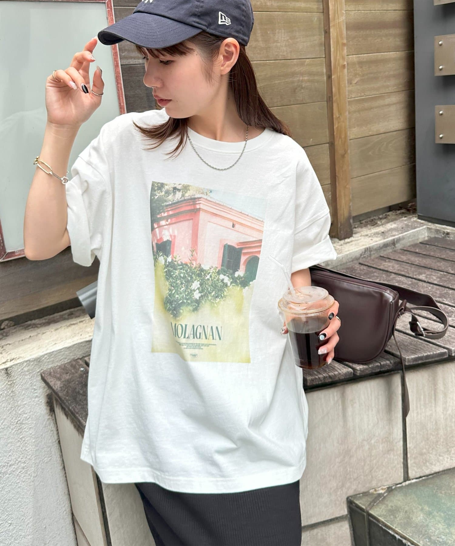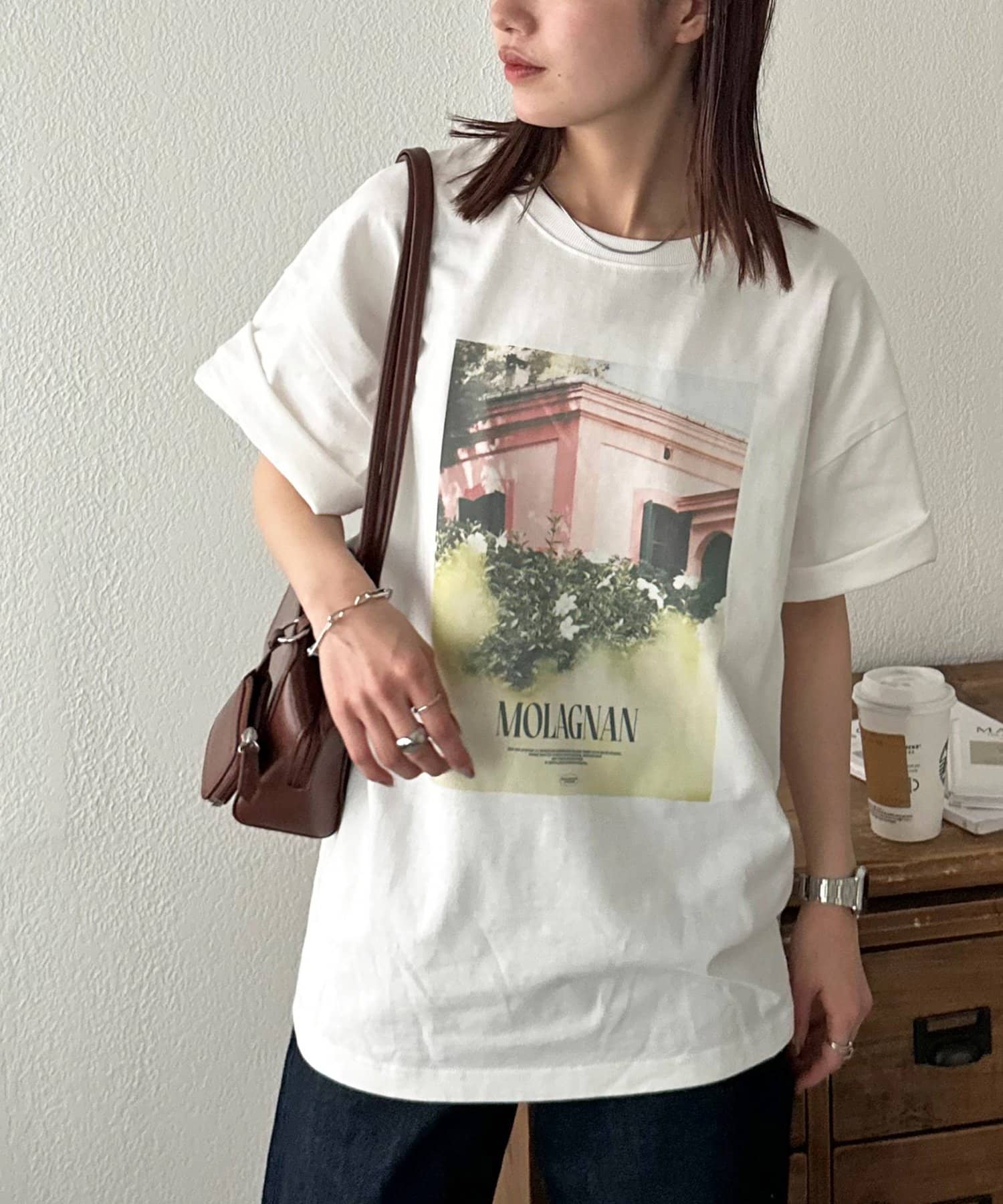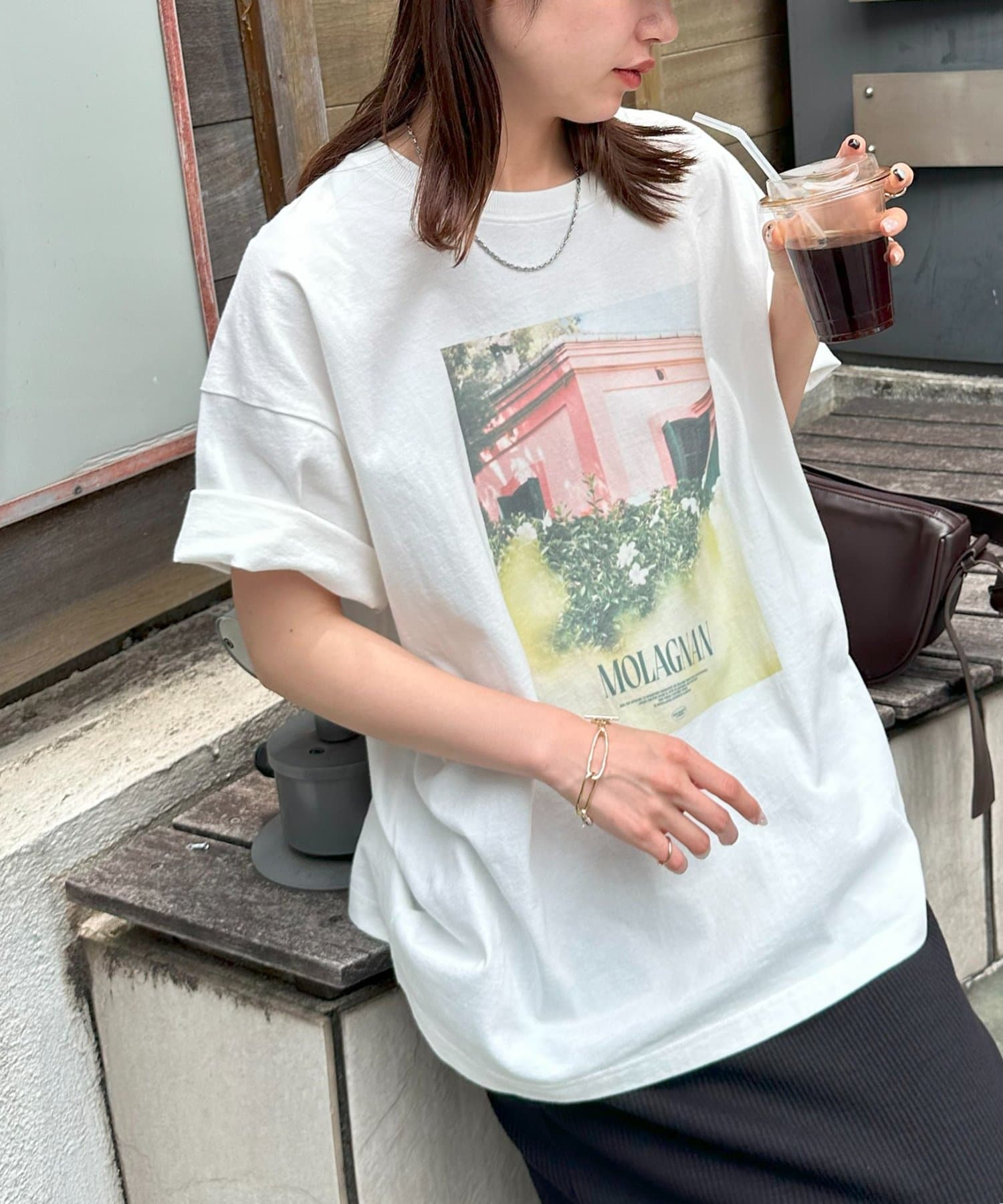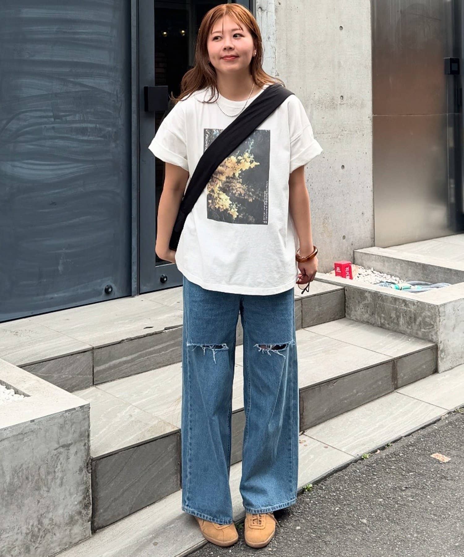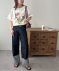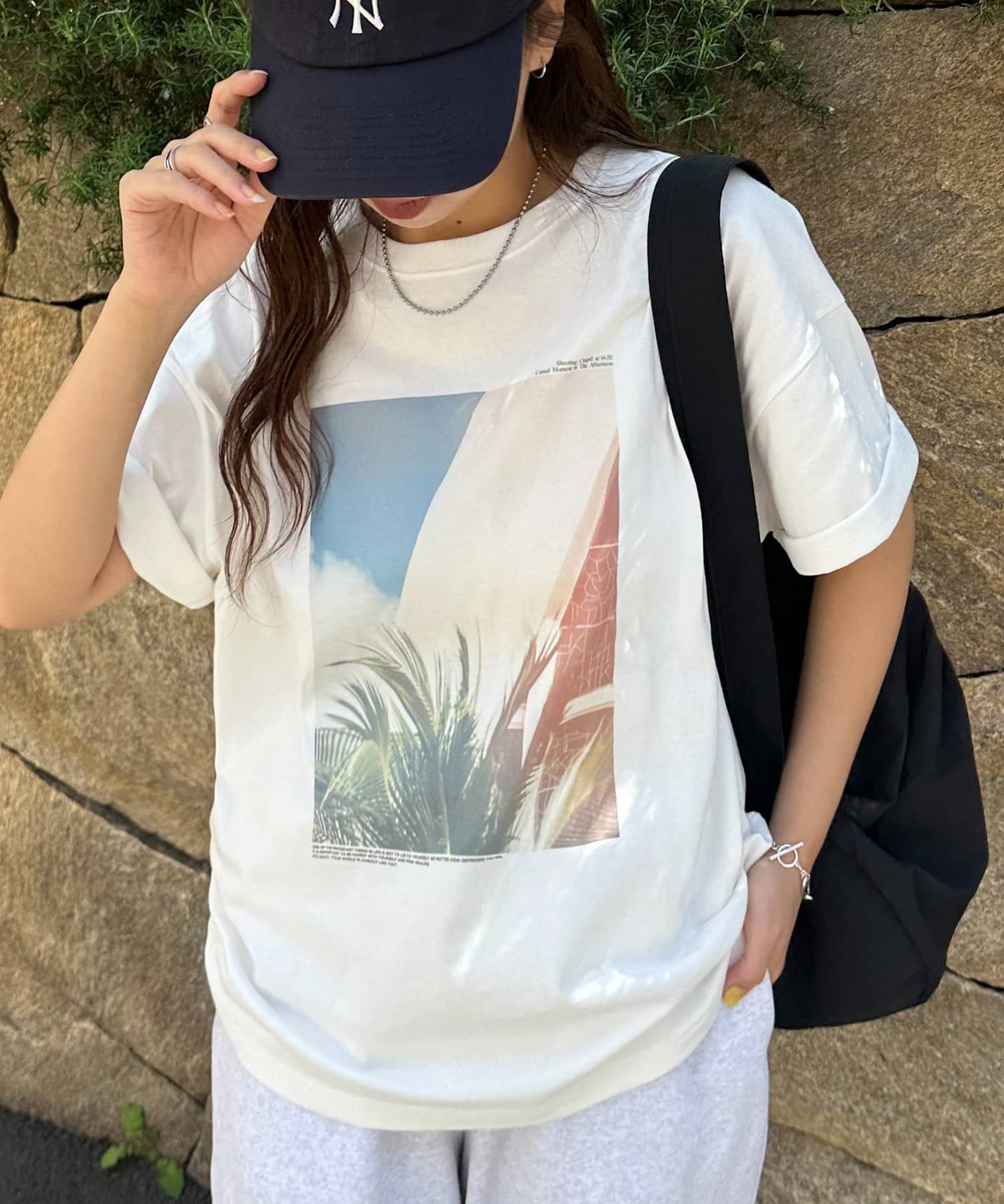 158cmレディーススタッフ:ゆったりとしたシルエットでリラックス感がありながら、フォトプリントで大人っぽさも演出できます!合わせるボトムスを選ばないのも嬉しいポイントです♩