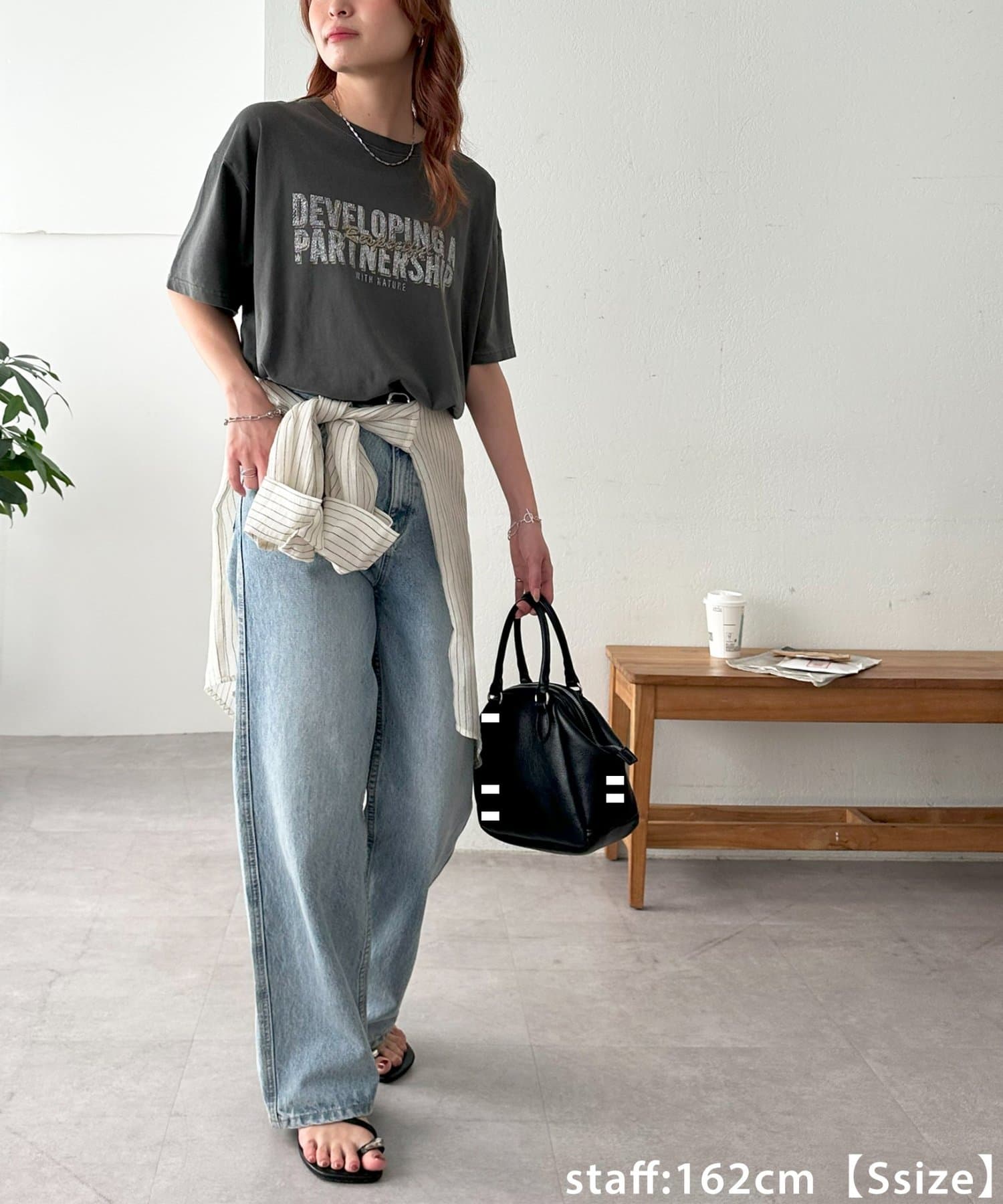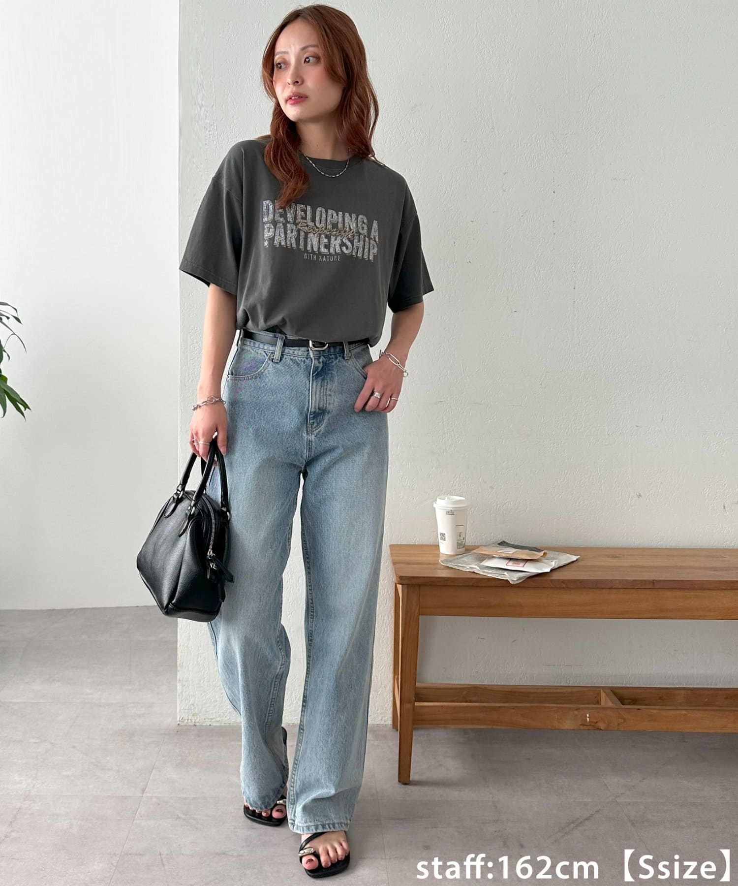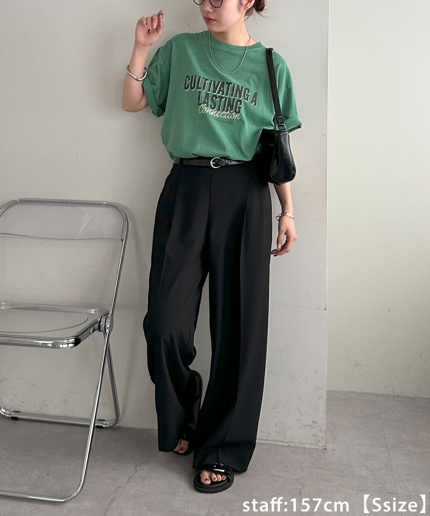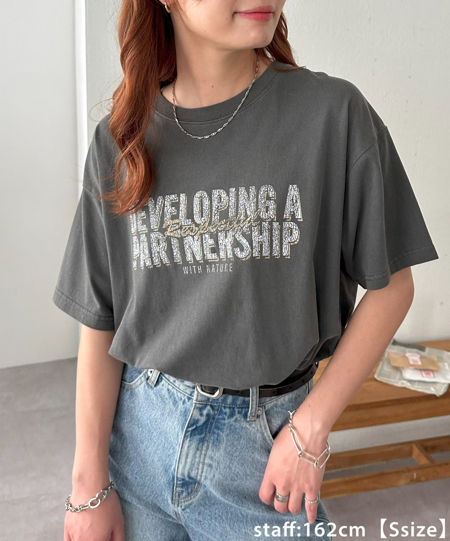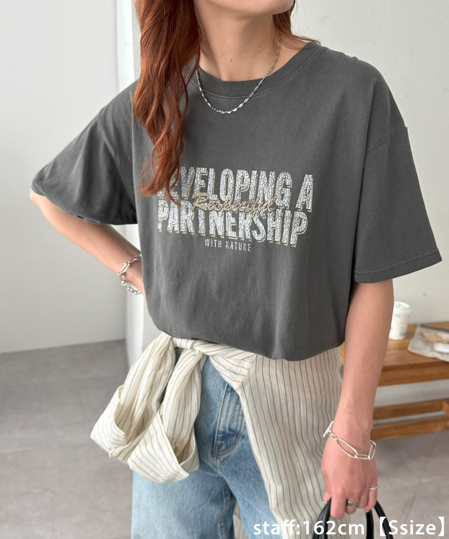 149cmレーディススタッフ(Sサイズ着用):カジュアルなTシャツですが、コンパクトめなSサイズは低身長が着ても着られている感が出ません!