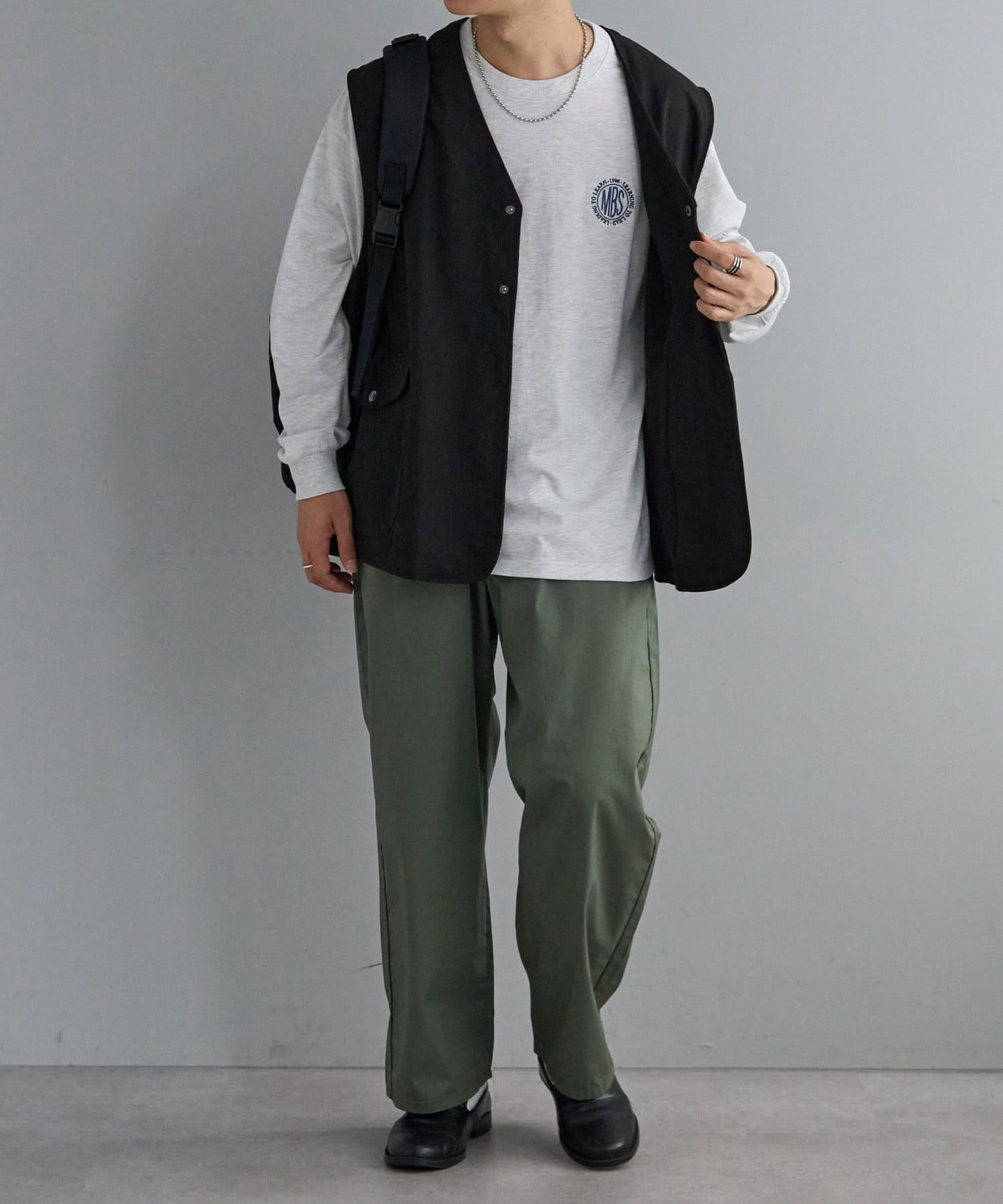 今年らしいビッグシルエットなので、メンズがワイドパンツやカーゴなどゆったりしたパンツを合わせてストリート、ミリタリーに、スウェットを合わせてよりカジュアルダウンさせるのもおすすめ。