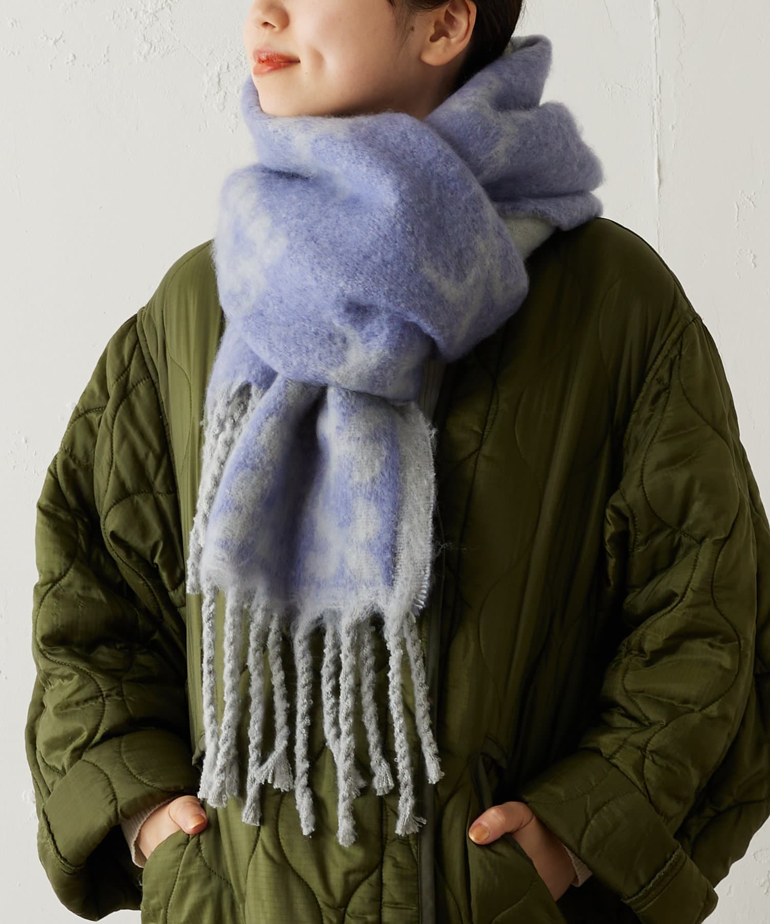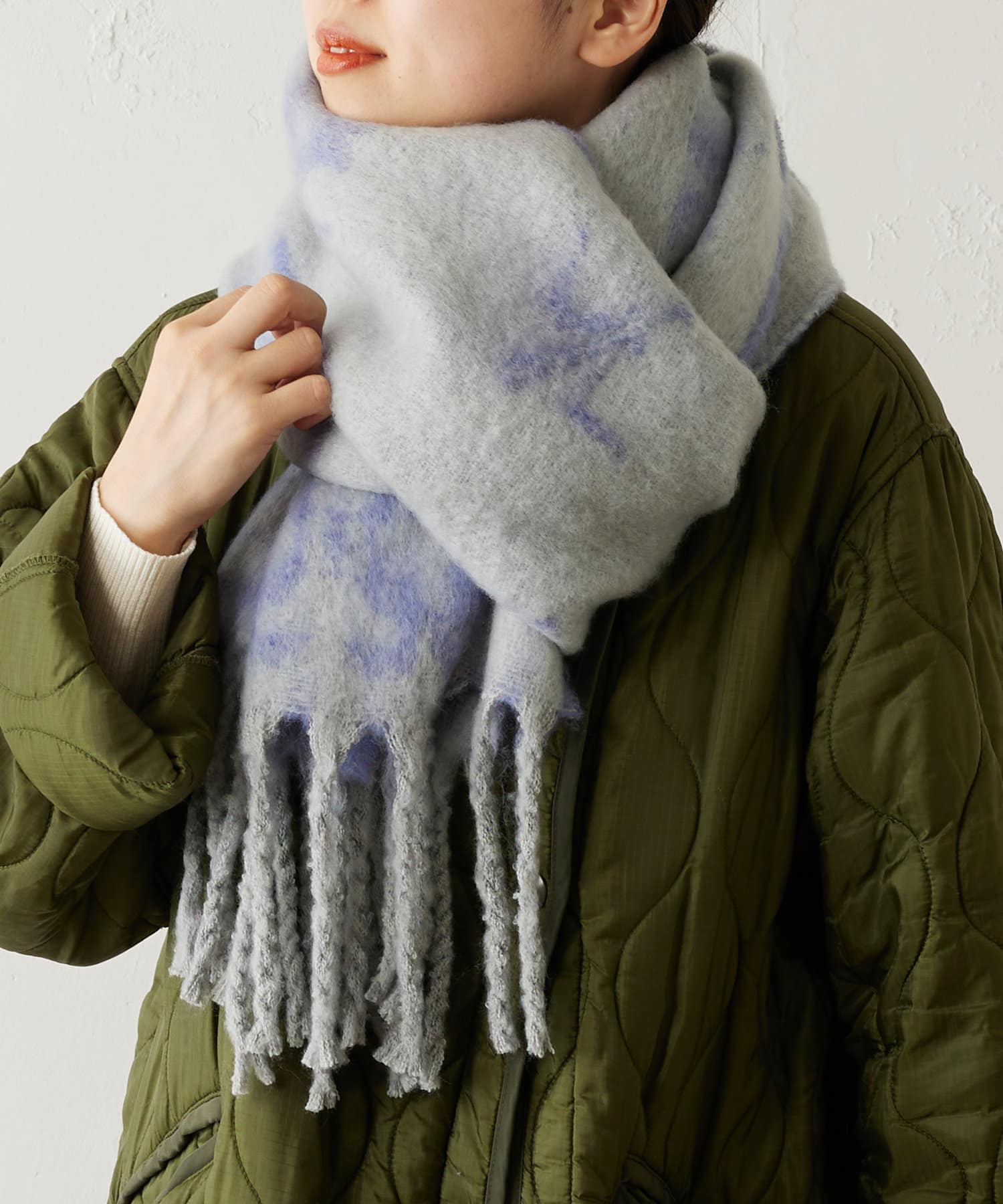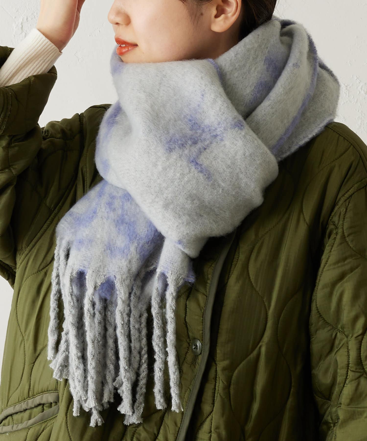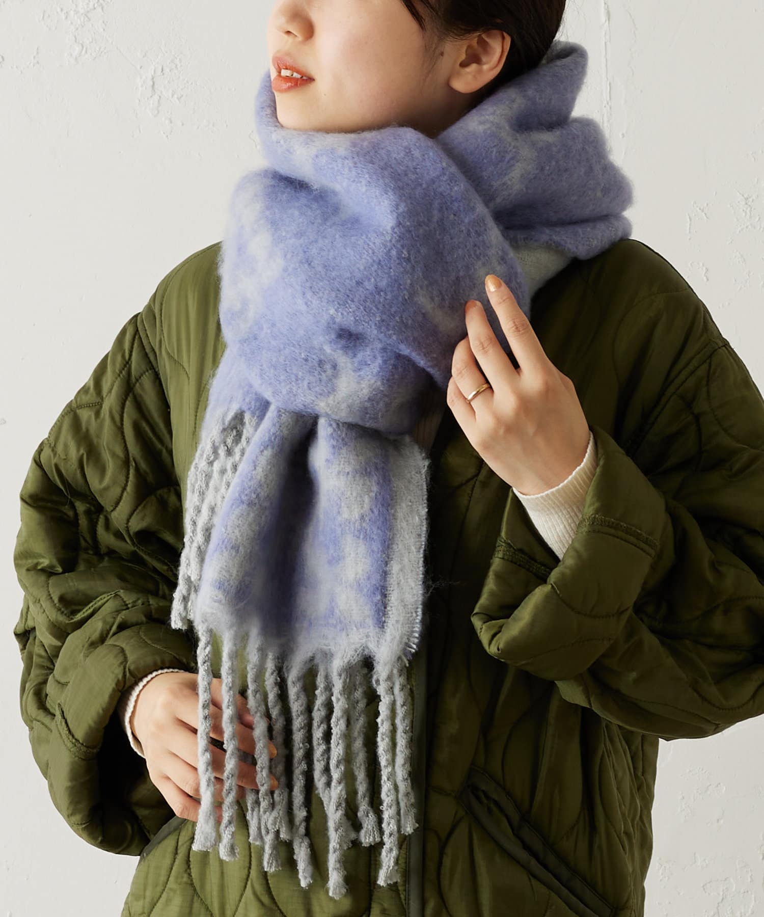 顔を少し覆うようにぐるっと巻くと保温性も高く、小顔効果もあります◎