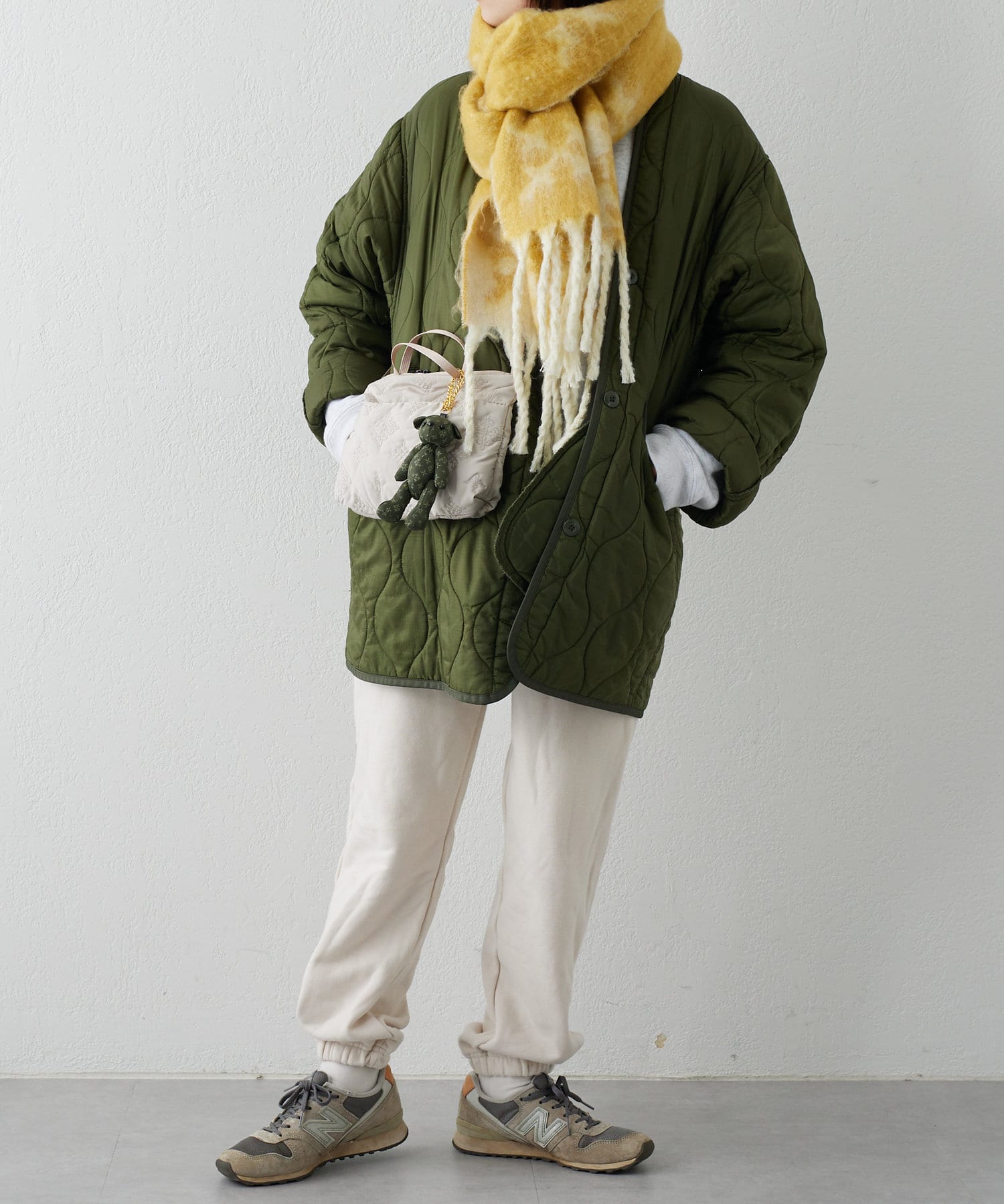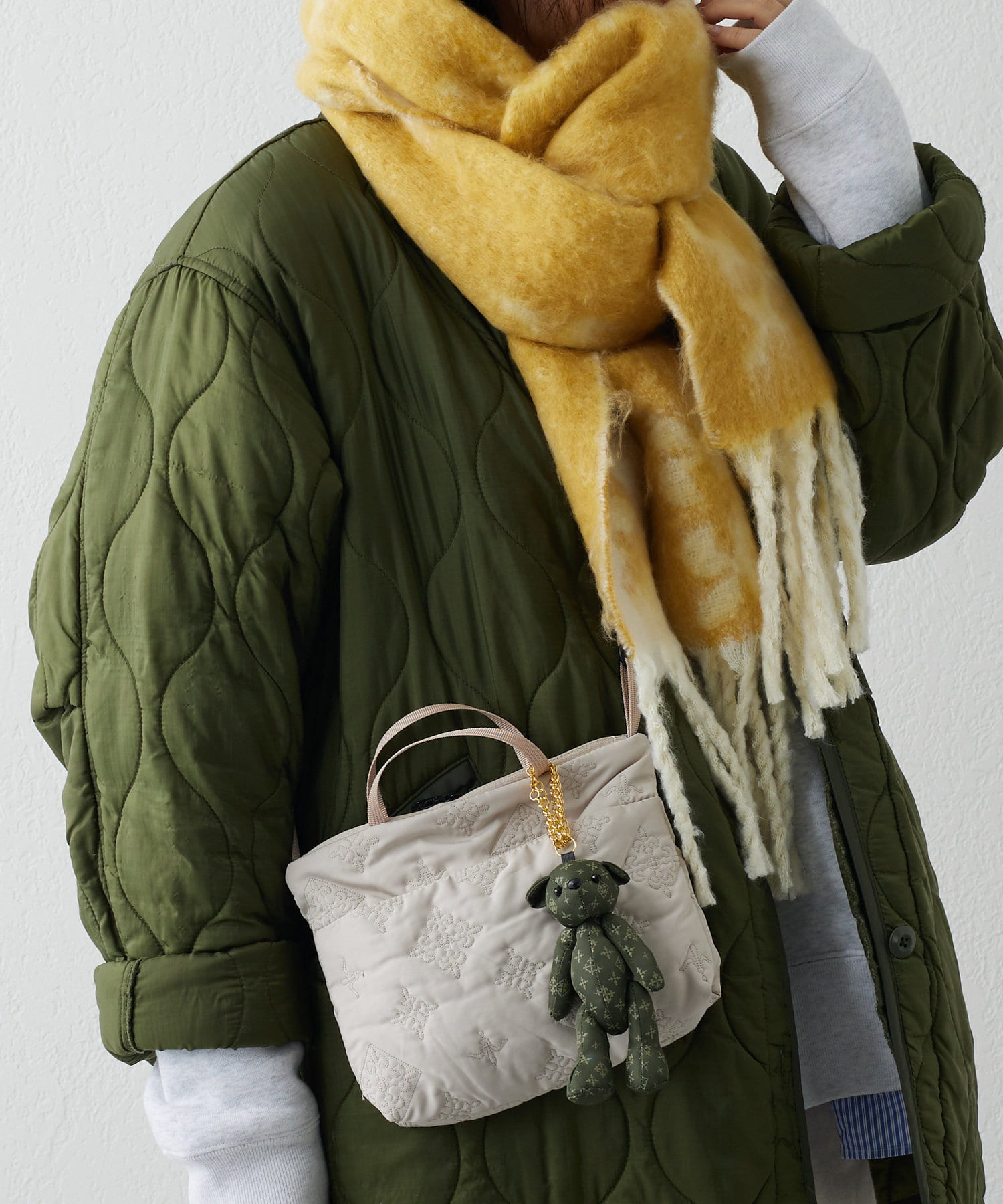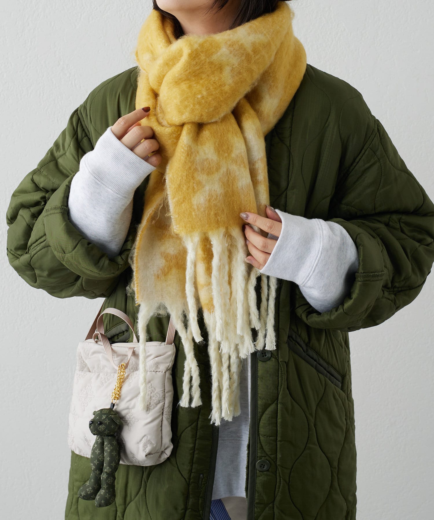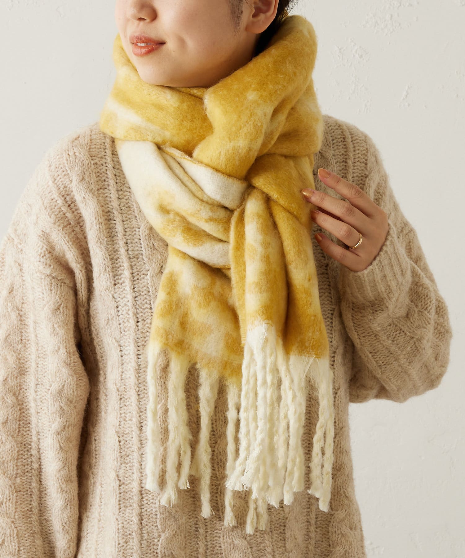 顔を少し覆うようにぐるっと巻くと保温性も高く、小顔効果もあります◎