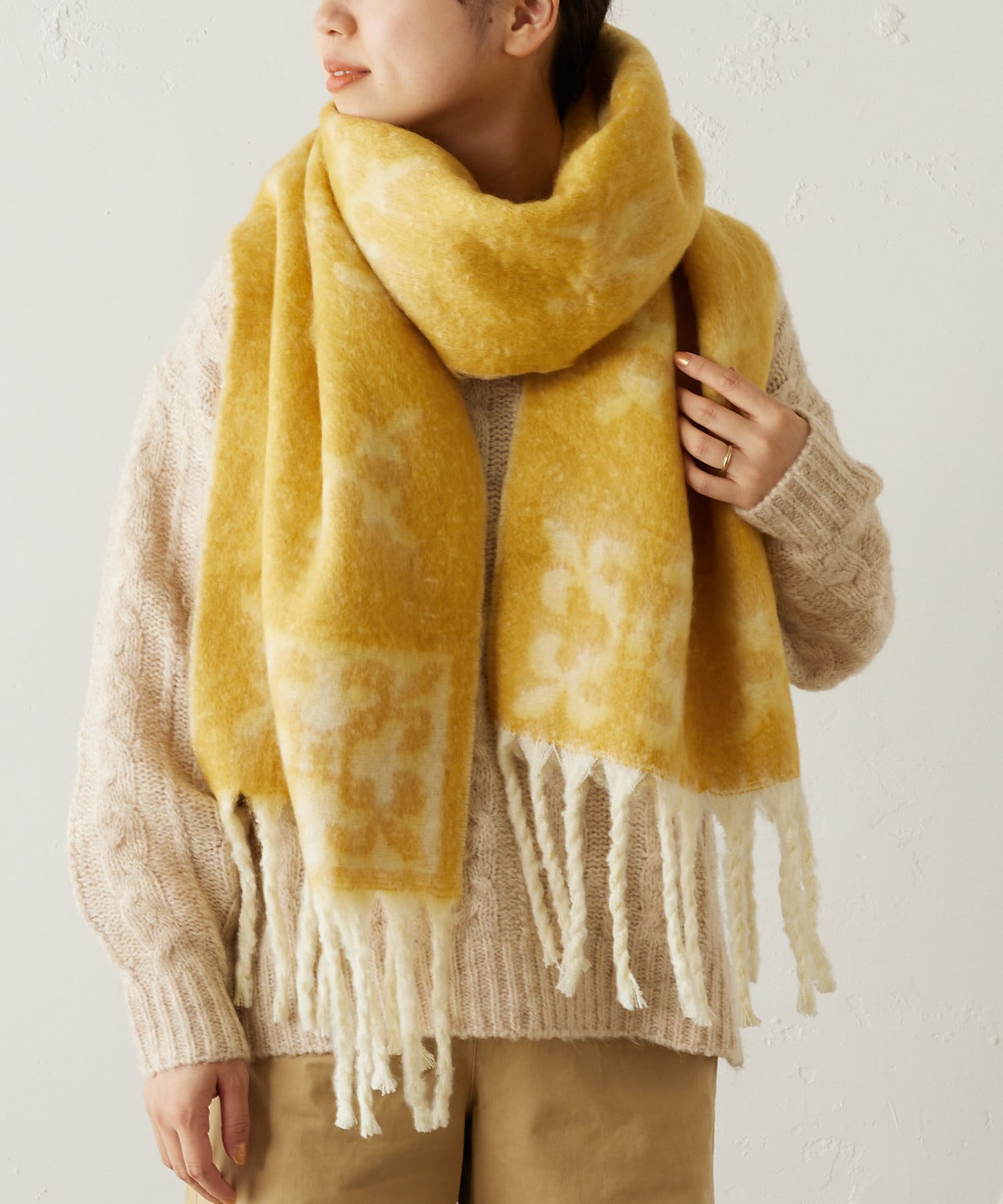 ボリュームのあるデザインが特徴の太フリンジマフラー。