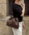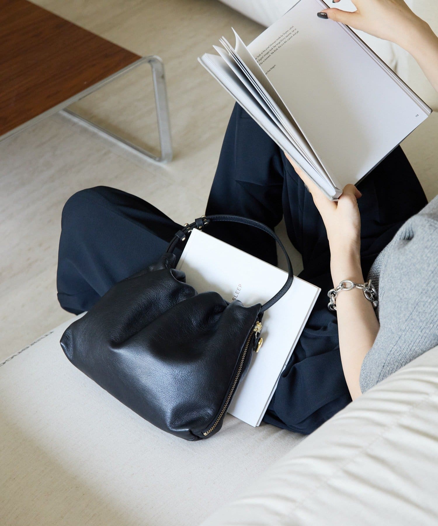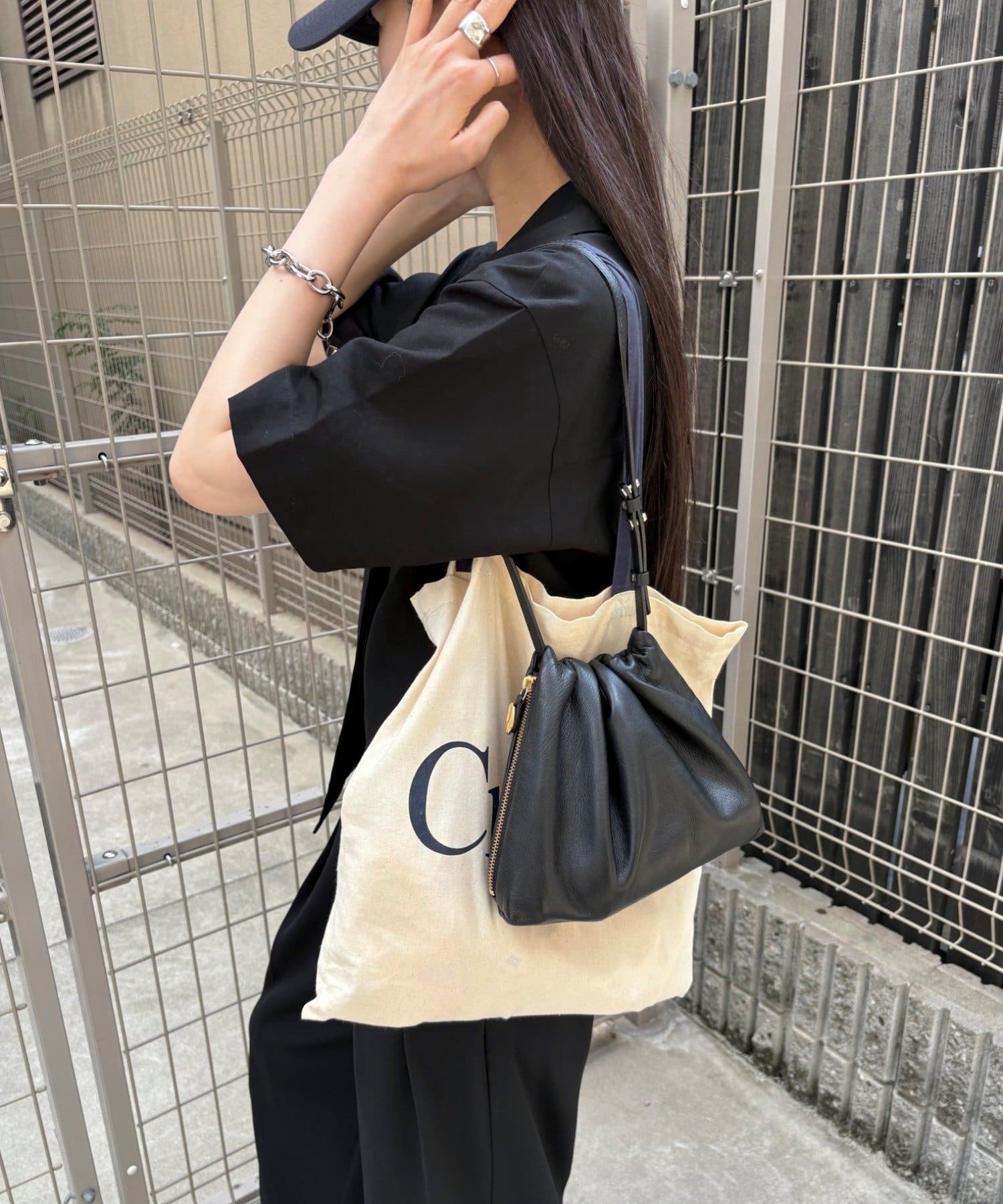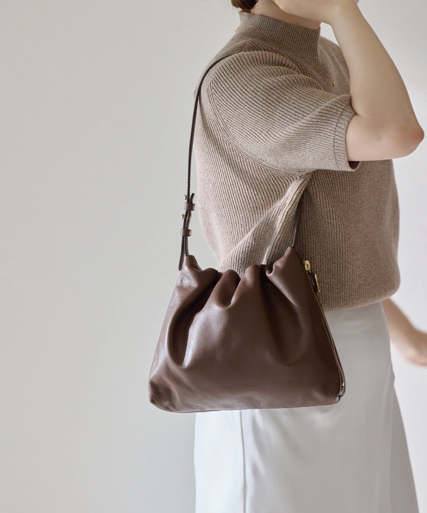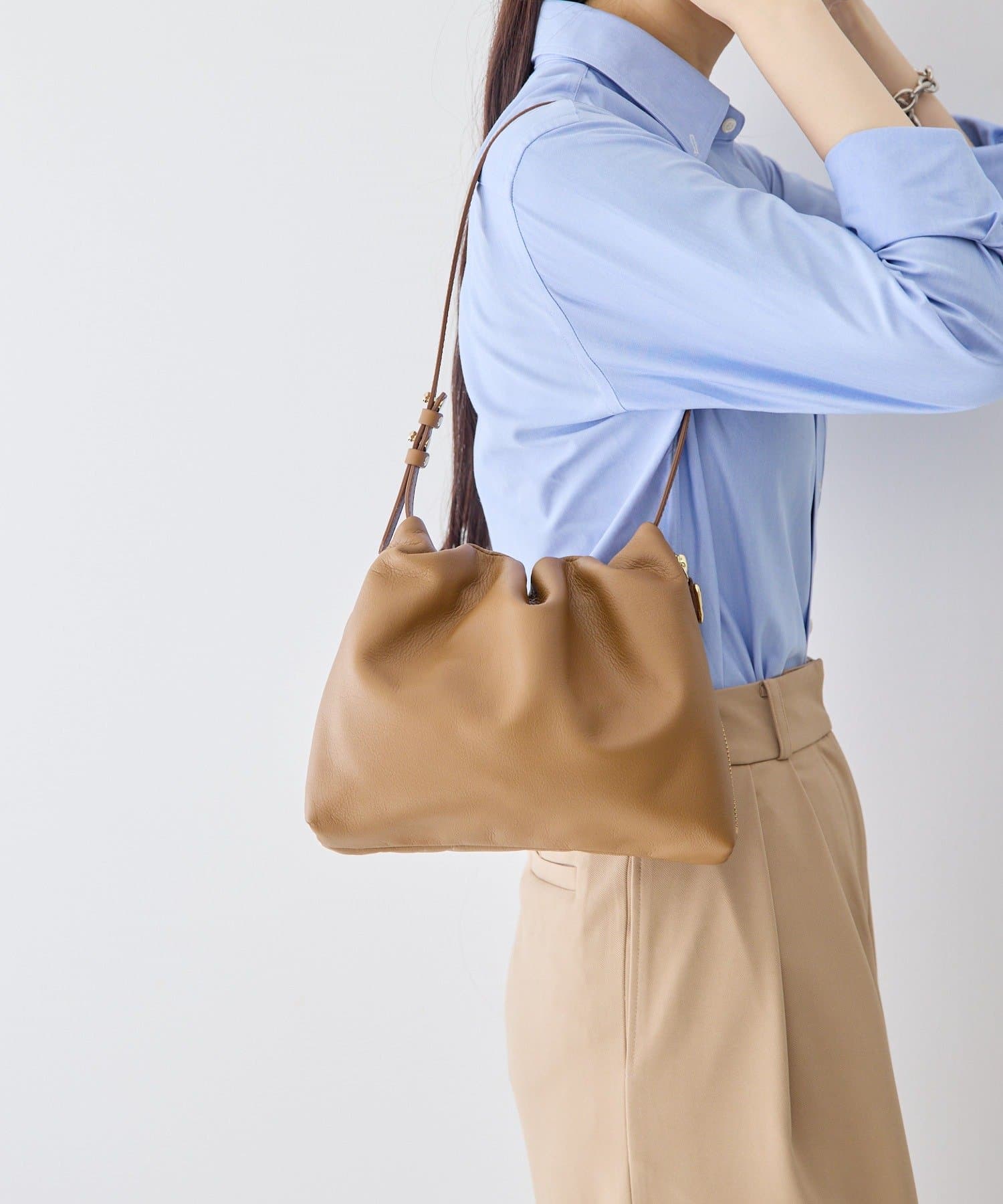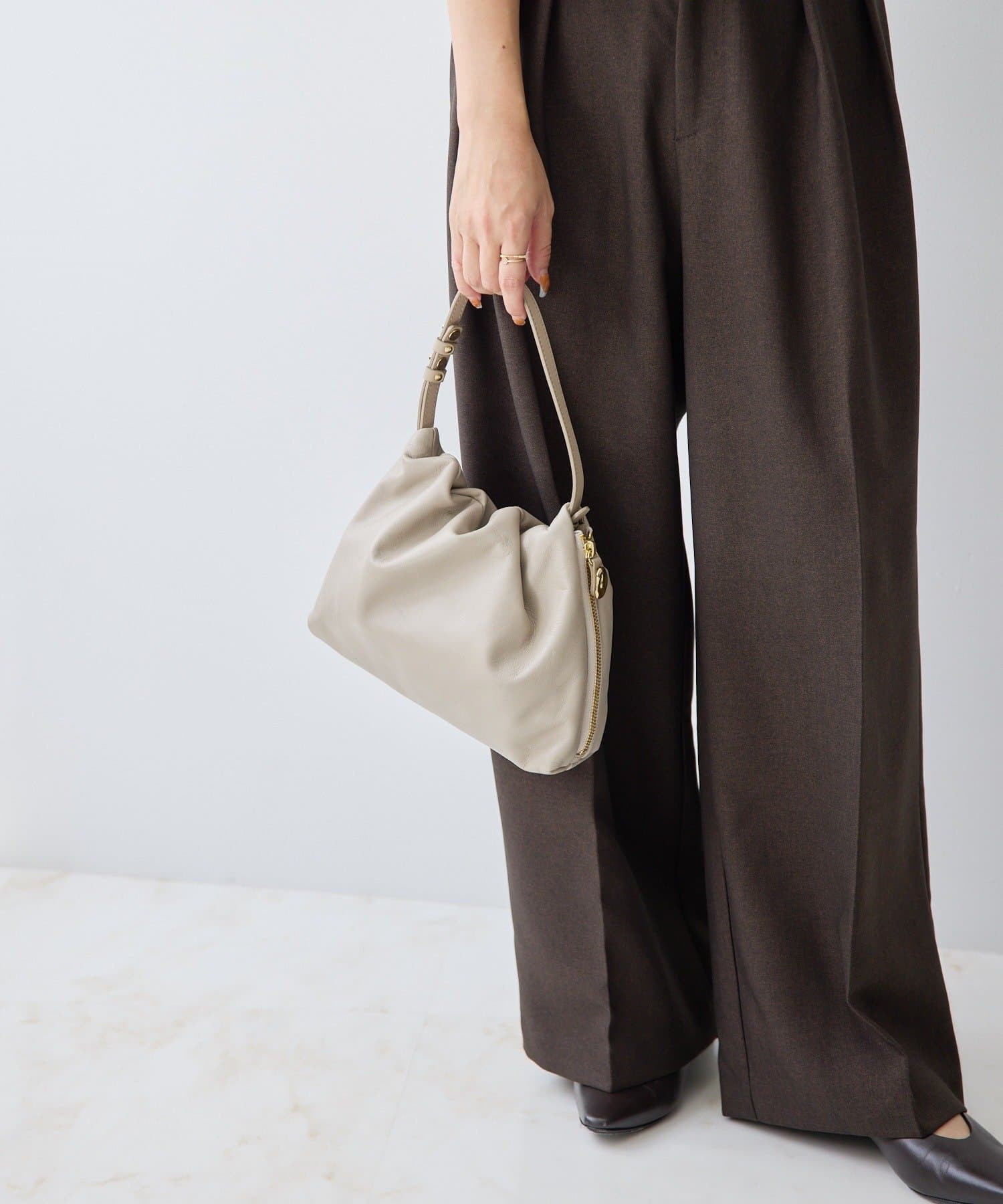 特徴的なバッグ上部のギャザーは荷物の量によって変化し、表情を楽しめるのがポイント。