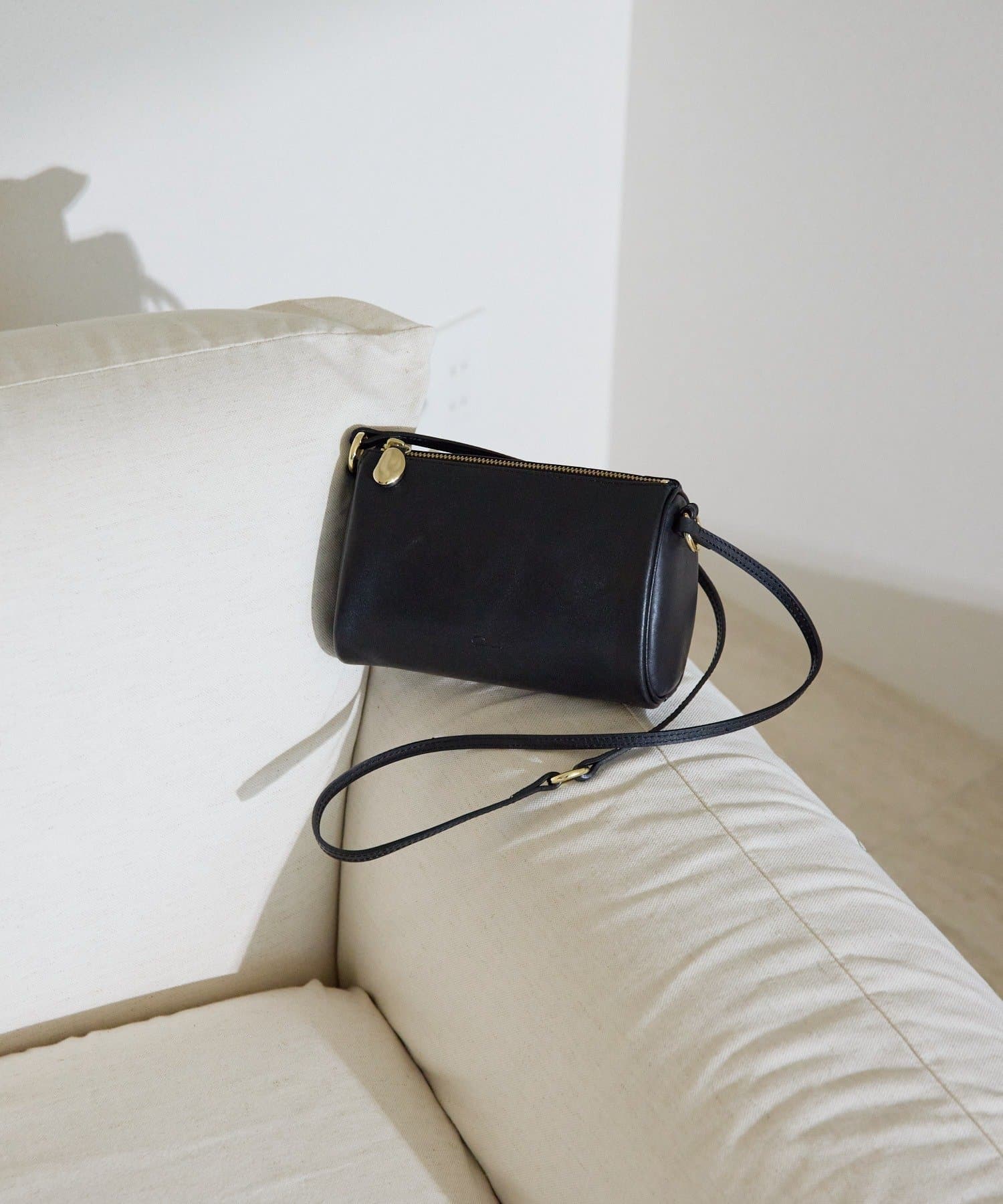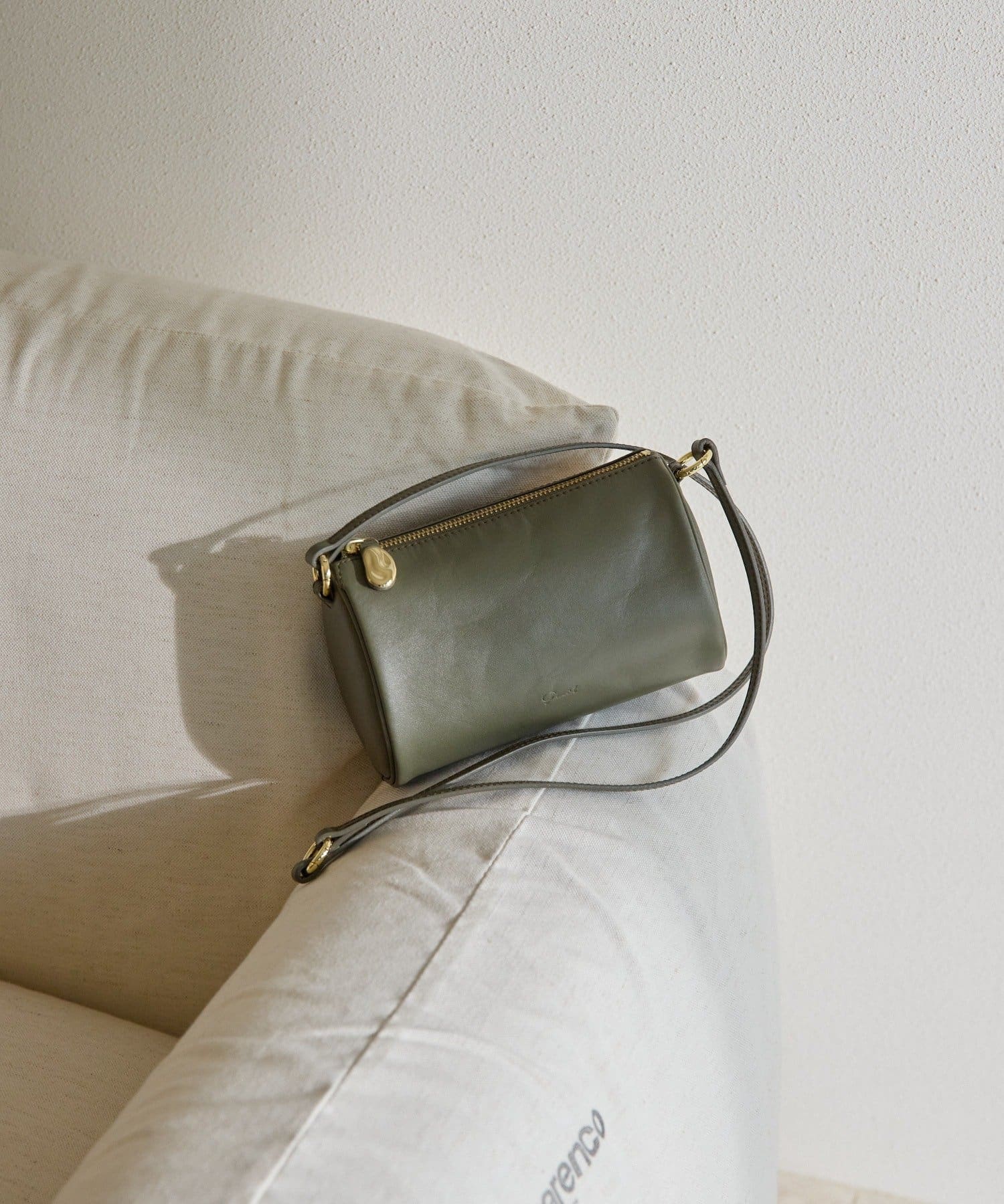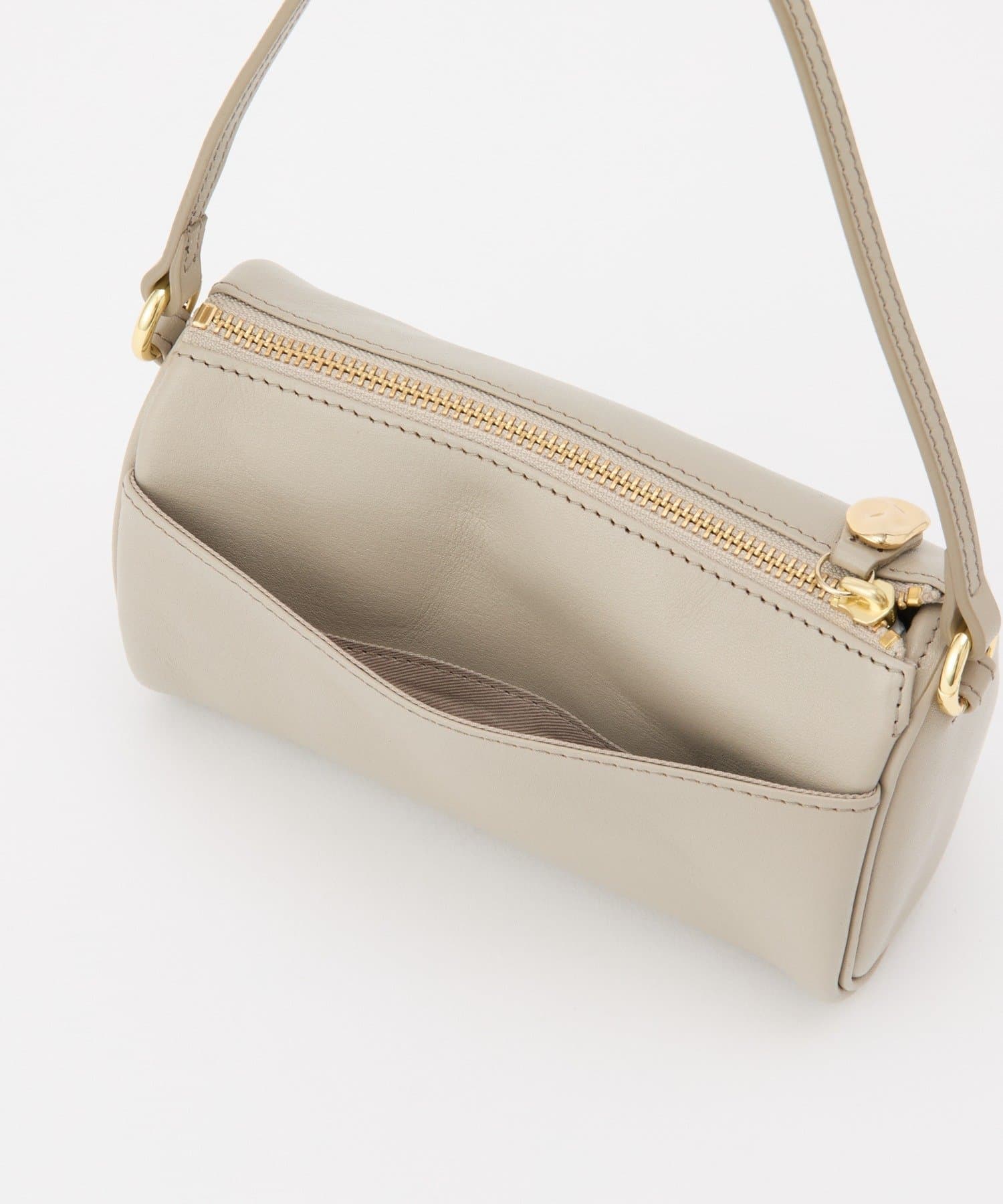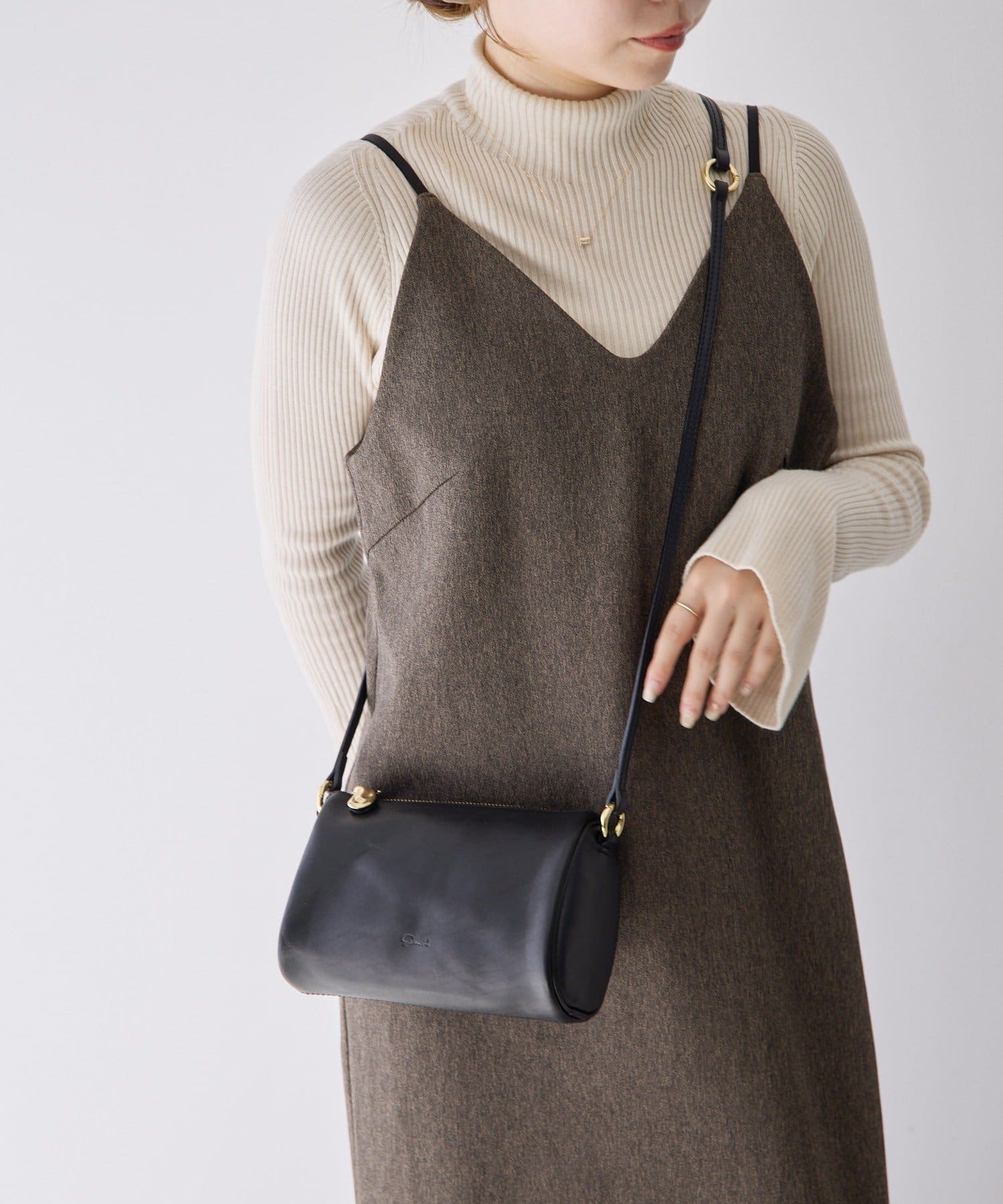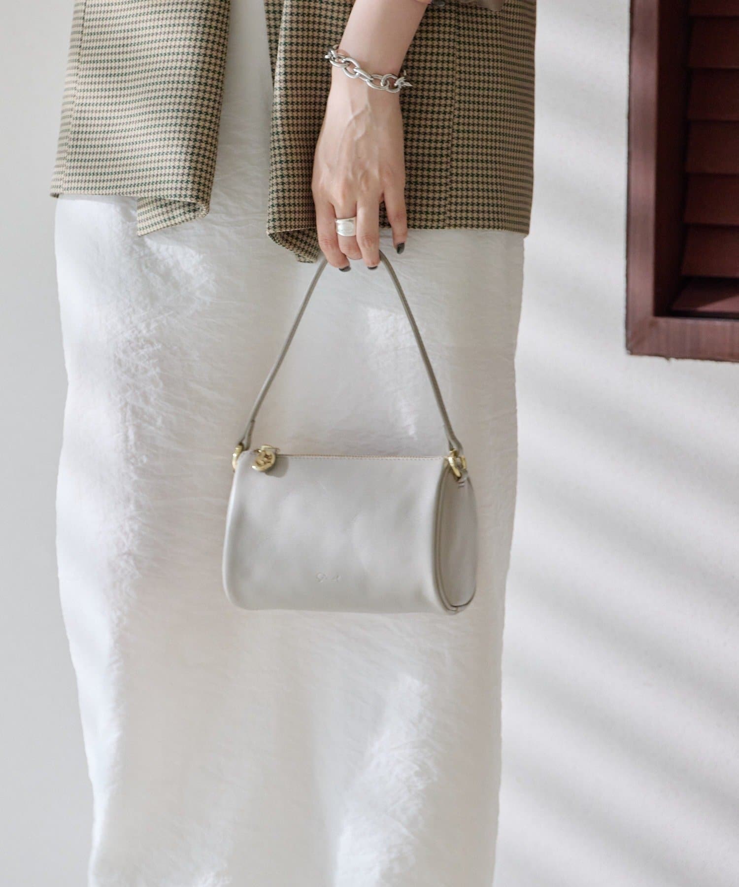 gemeilのアイコンでもあるニュアンスパーツをファスナーの引手に施し、バッグ正面にはさりげないロゴの刻印も。