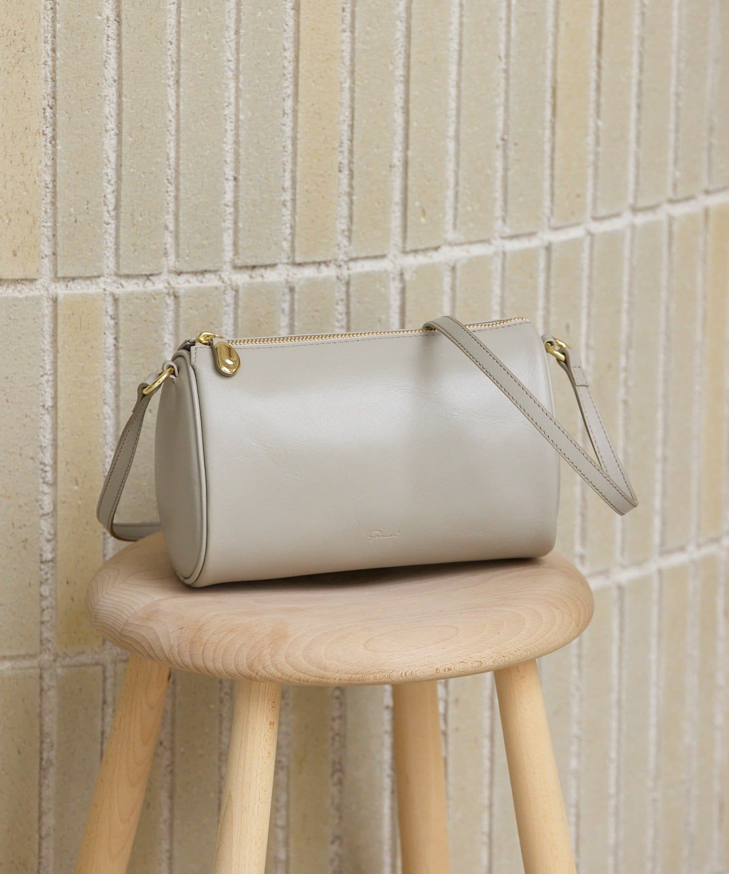 gemeilのアイコンでもあるニュアンスパーツをファスナーの引手に施し、バッグ正面にはさりげないロゴの刻印も。