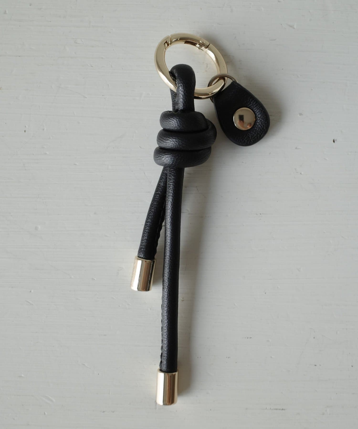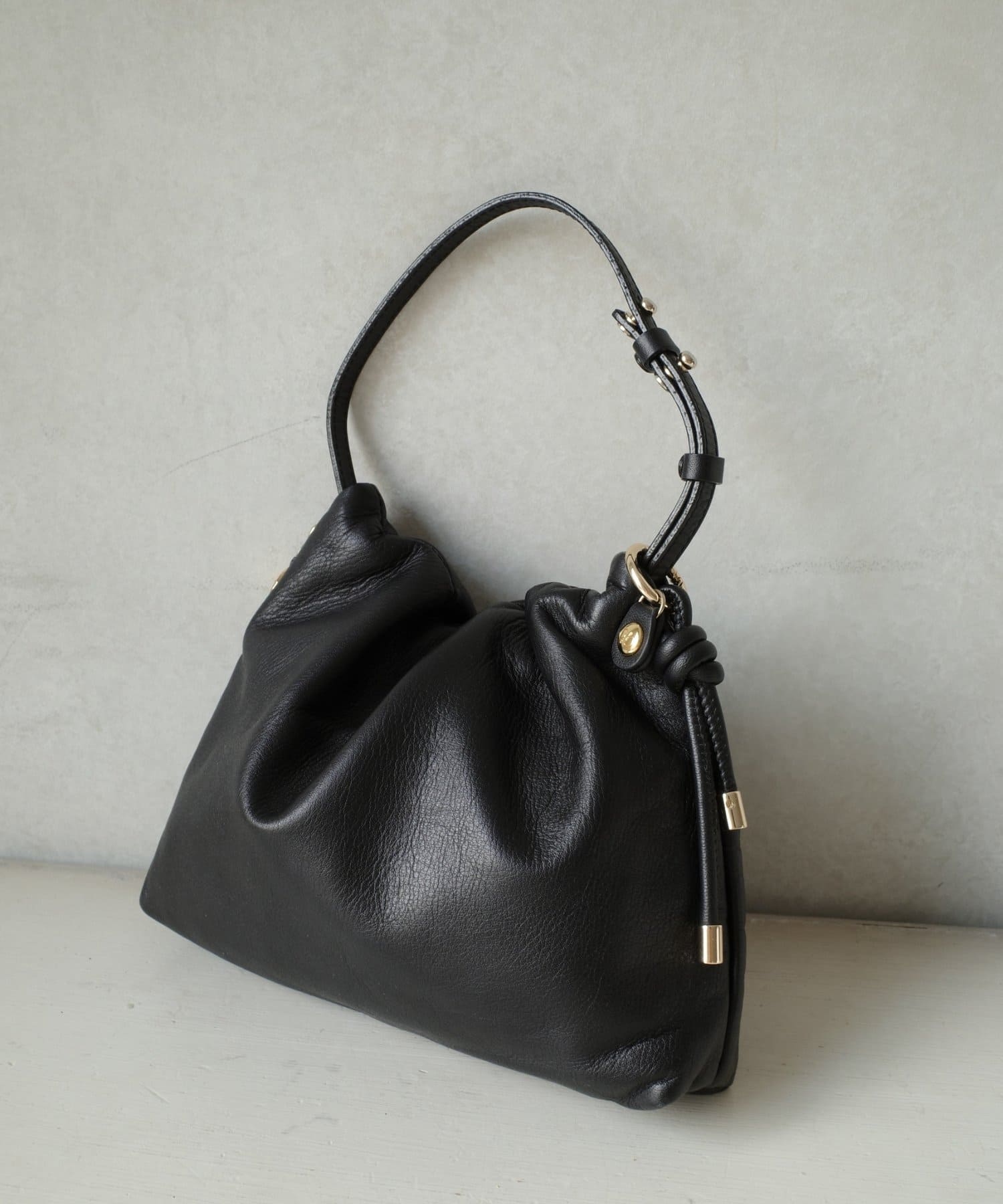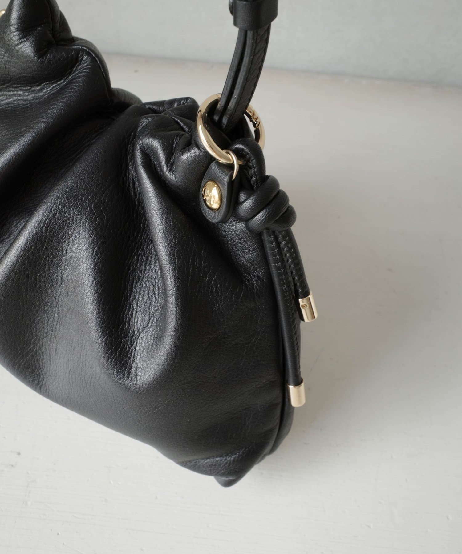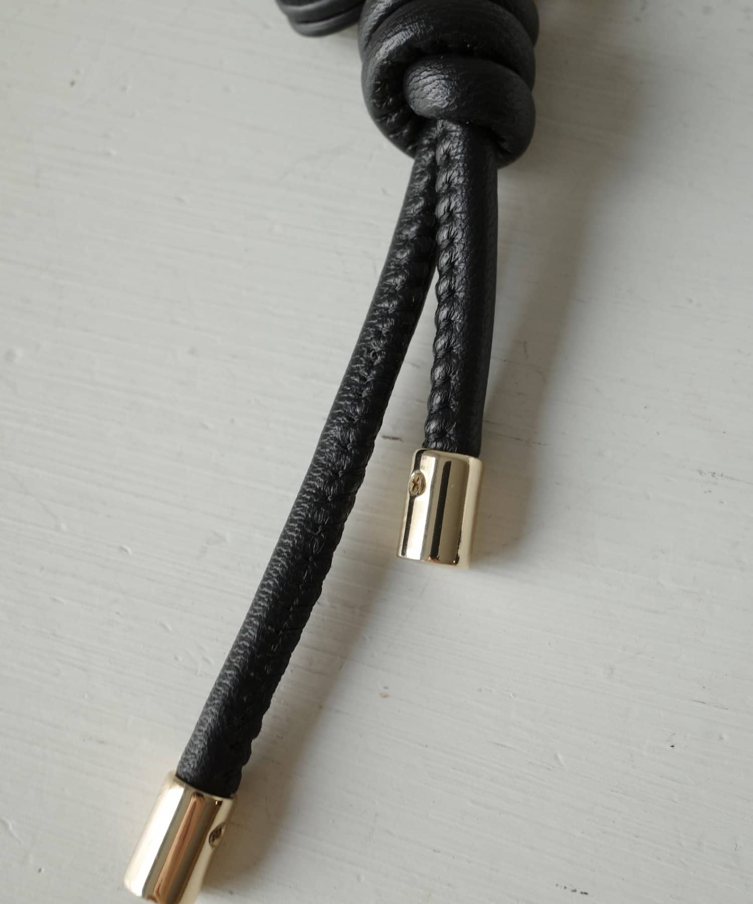 レザーの上品な質感と結び目のデザインがシンプルながらも存在感を放ち、ゴールドの金具がさらに高級感を演出。