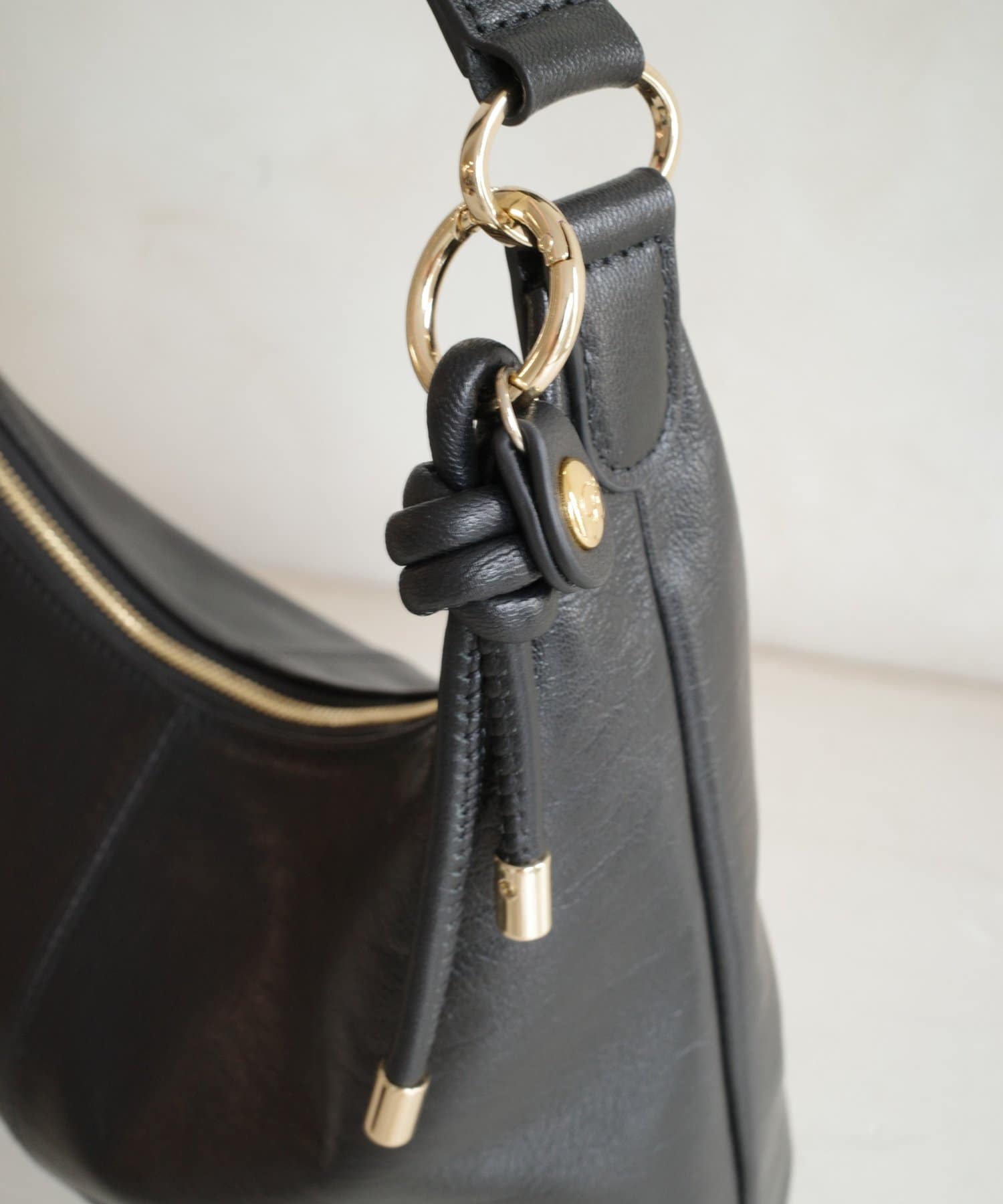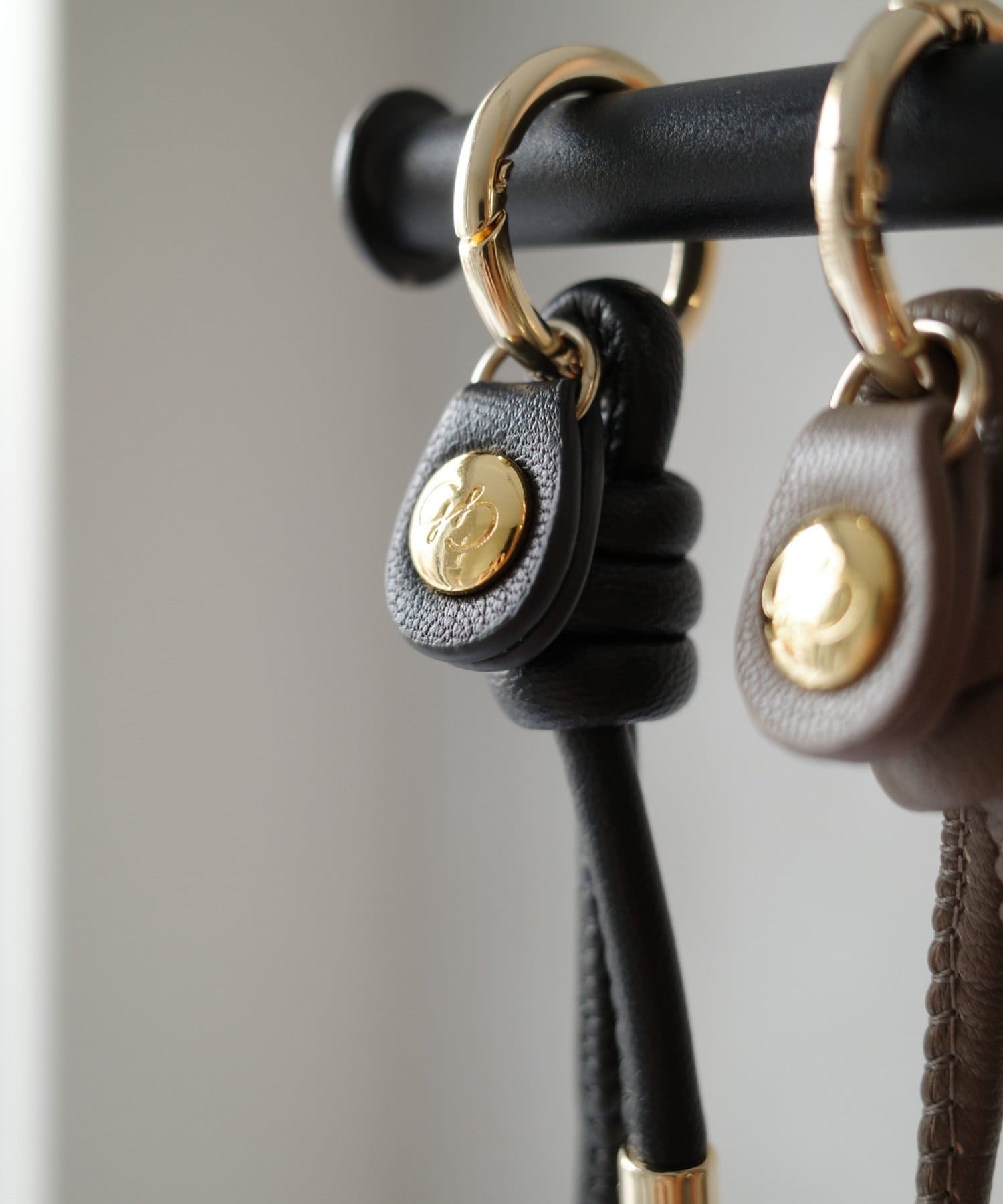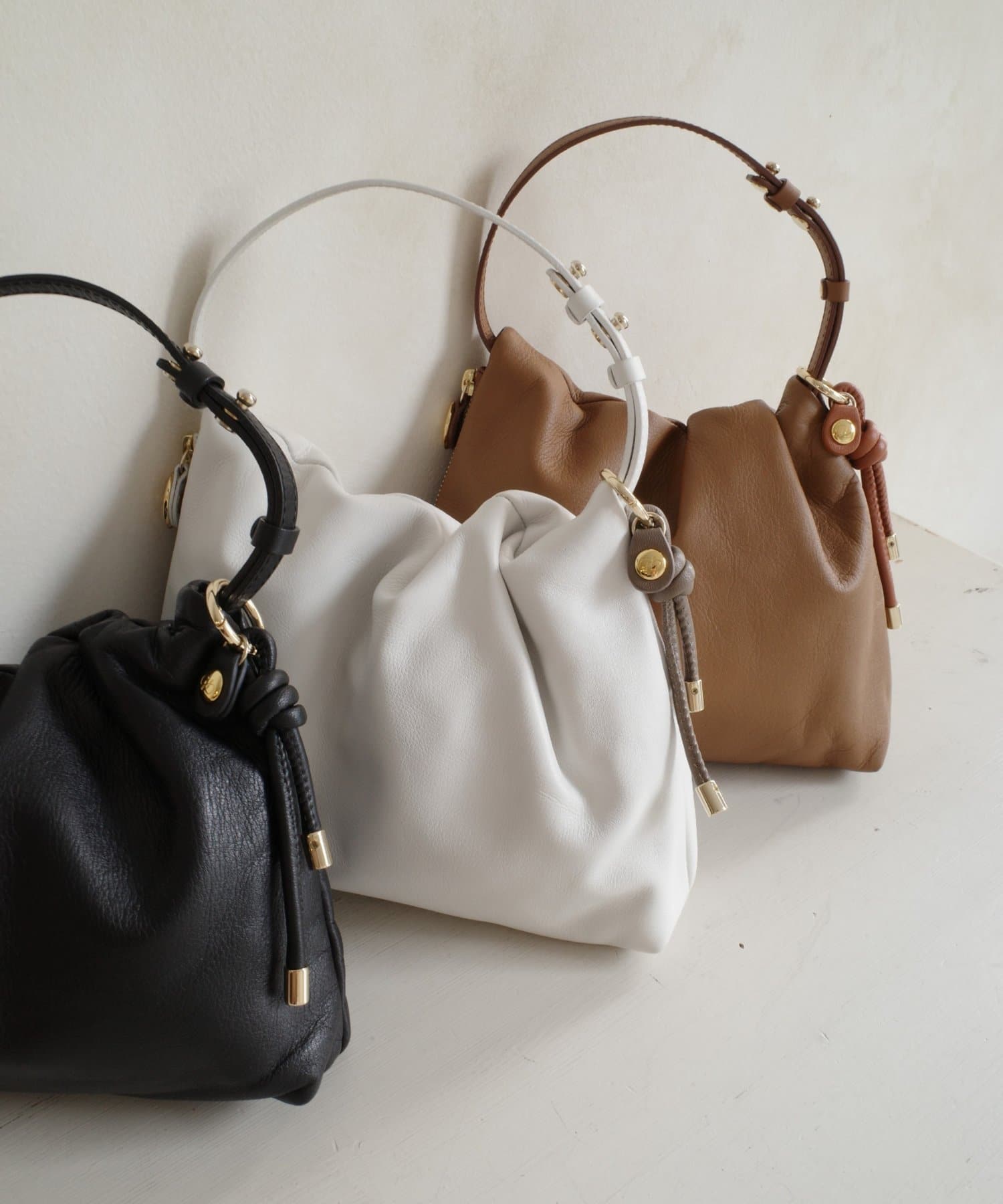 レザーの上品な質感と結び目のデザインがシンプルながらも存在感を放ち、ゴールドの金具がさらに高級感を演出。