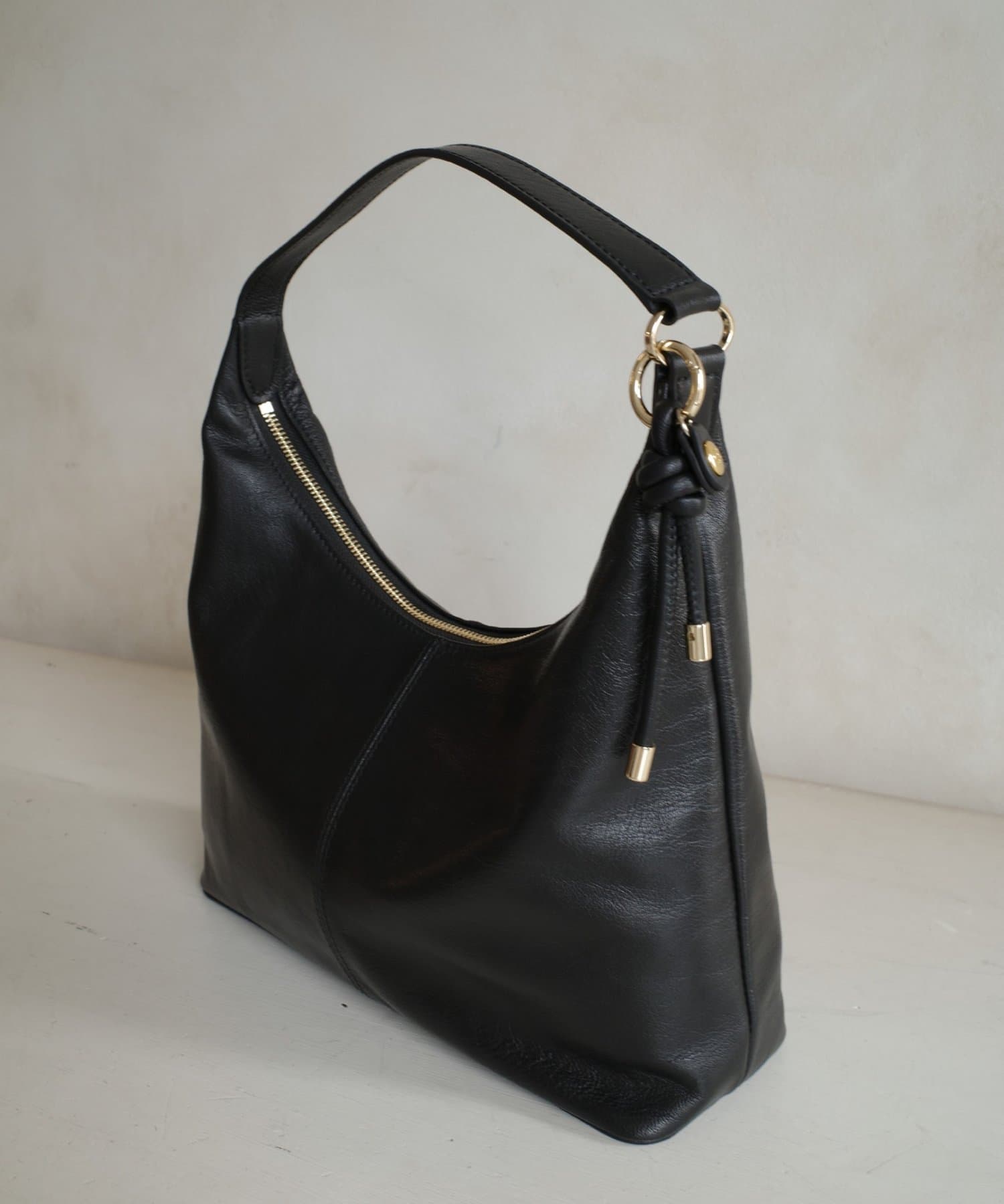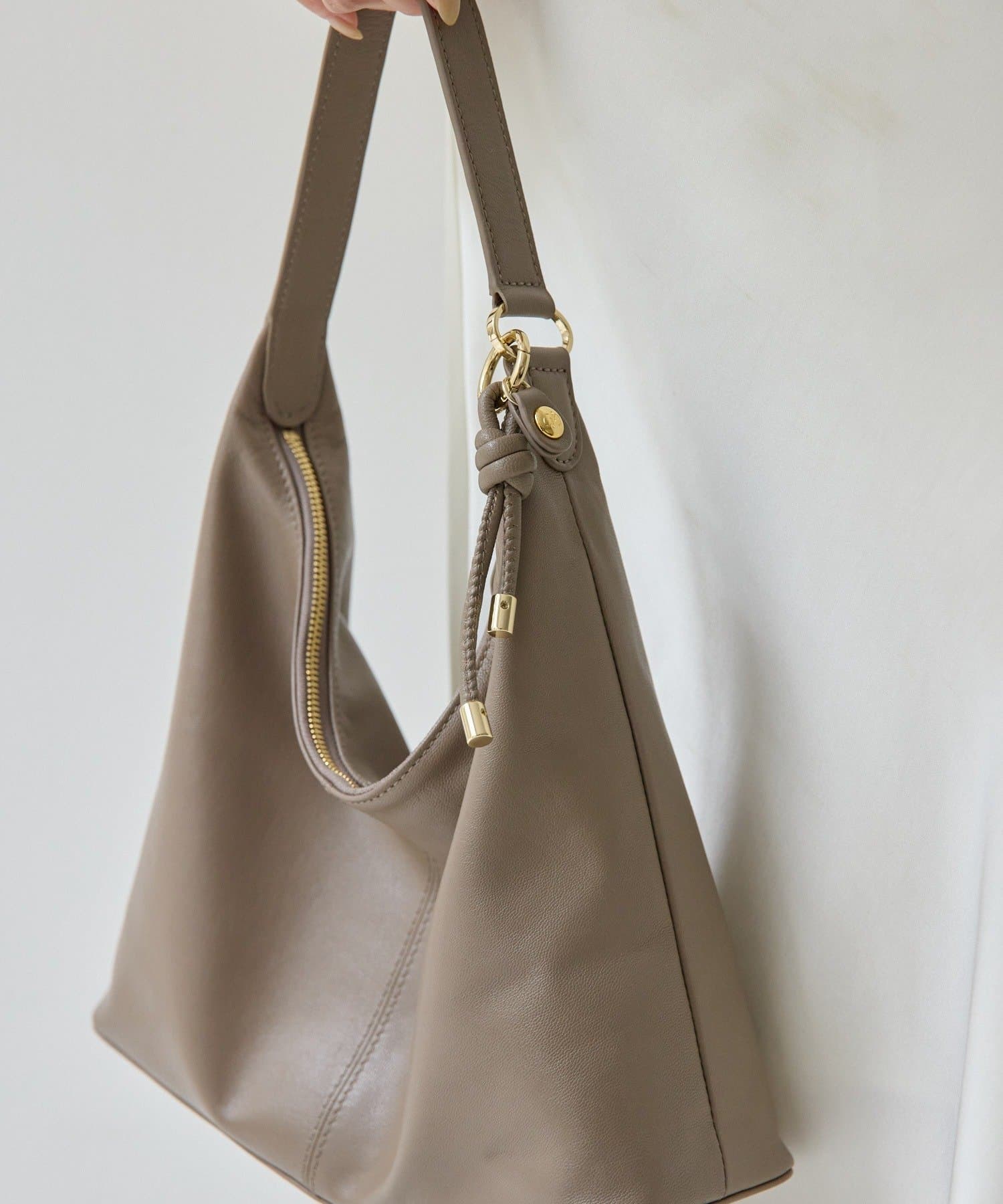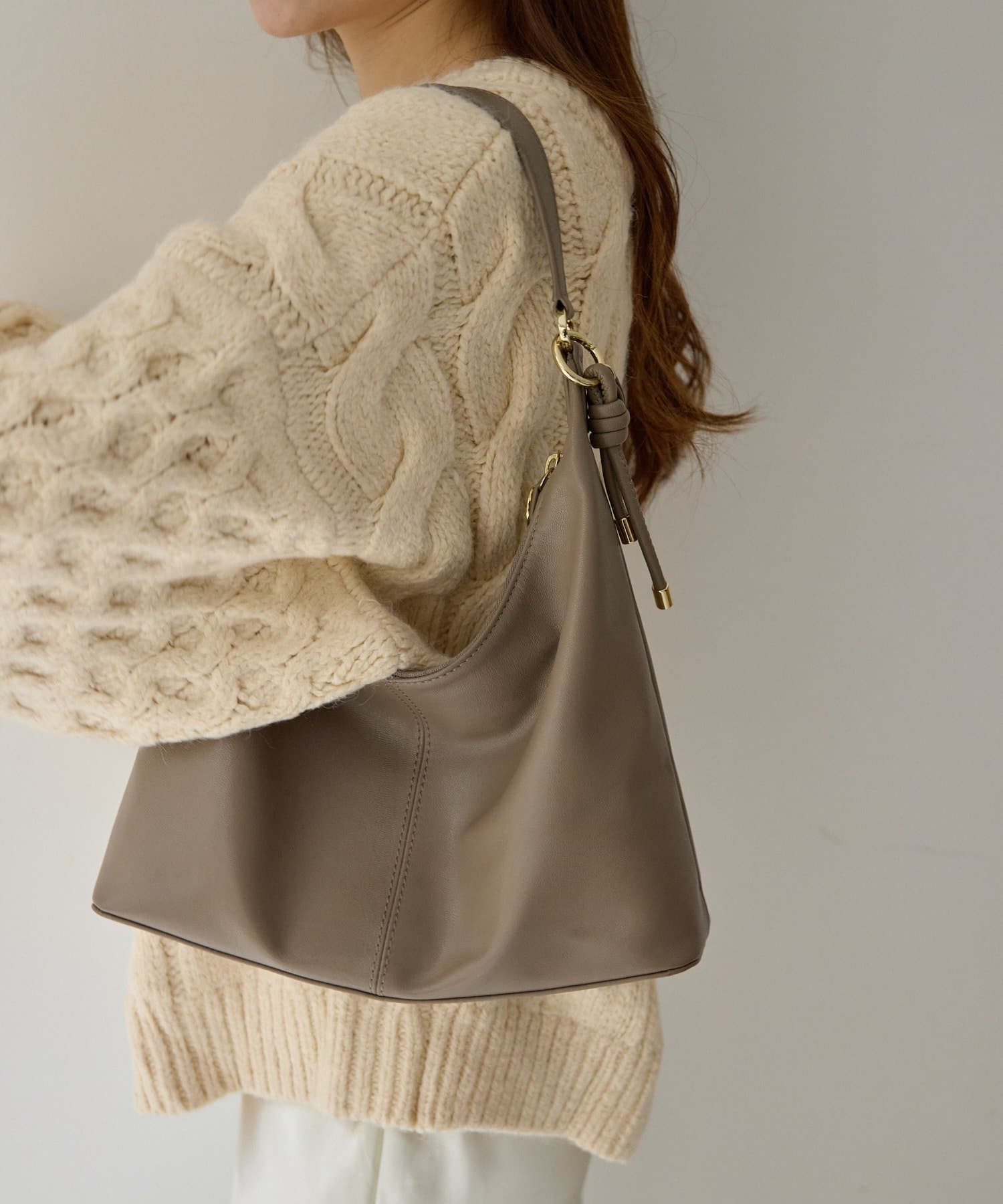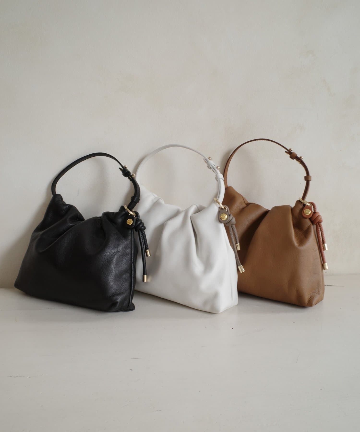 レザーの上品な質感と結び目のデザインがシンプルながらも存在感を放ち、ゴールドの金具がさらに高級感を演出。