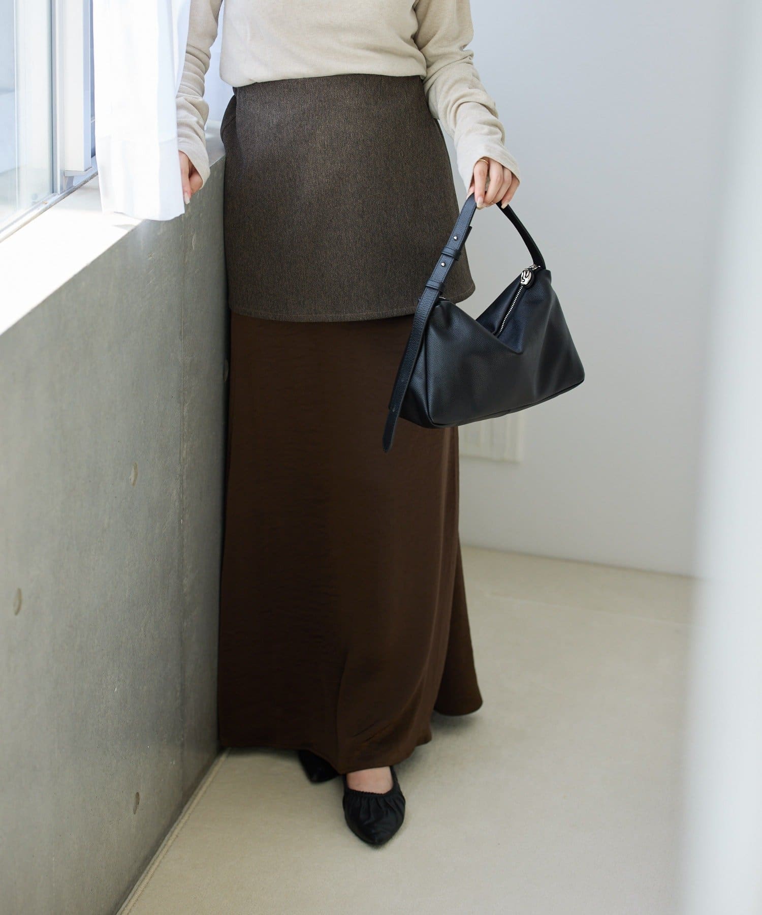 ほどよい光沢が上品な印象のサテンスカートと、コーデが締まる厚地のミニスカートのセットアイテム。