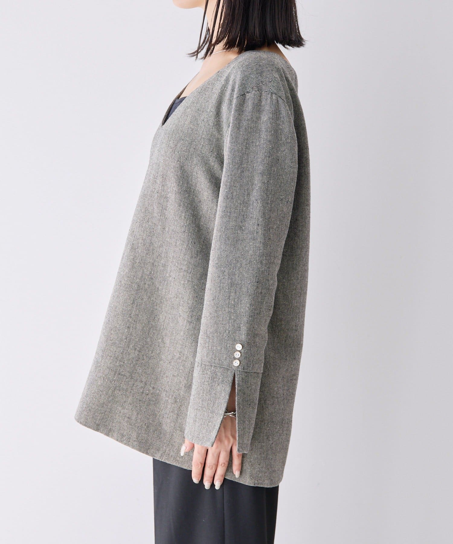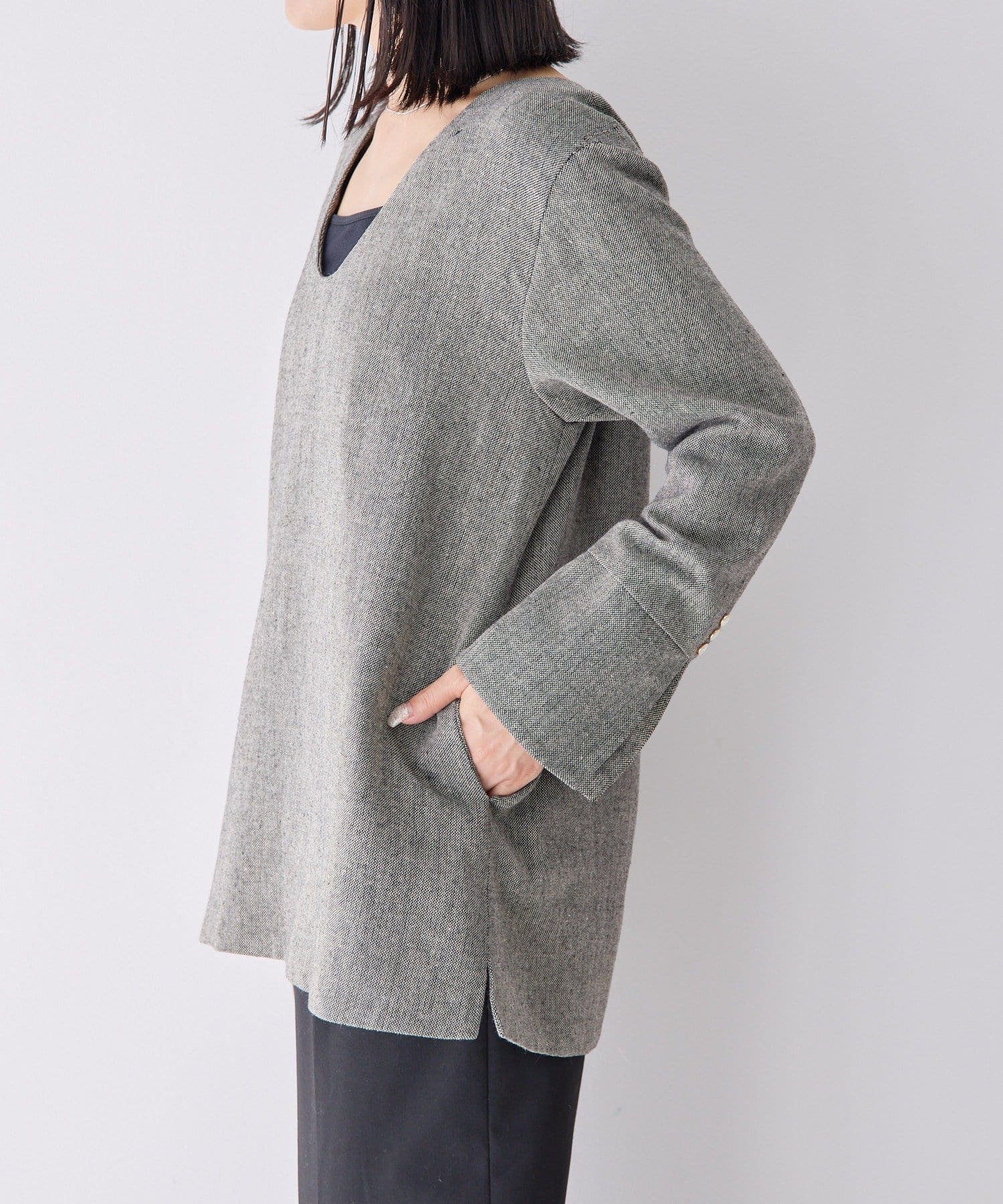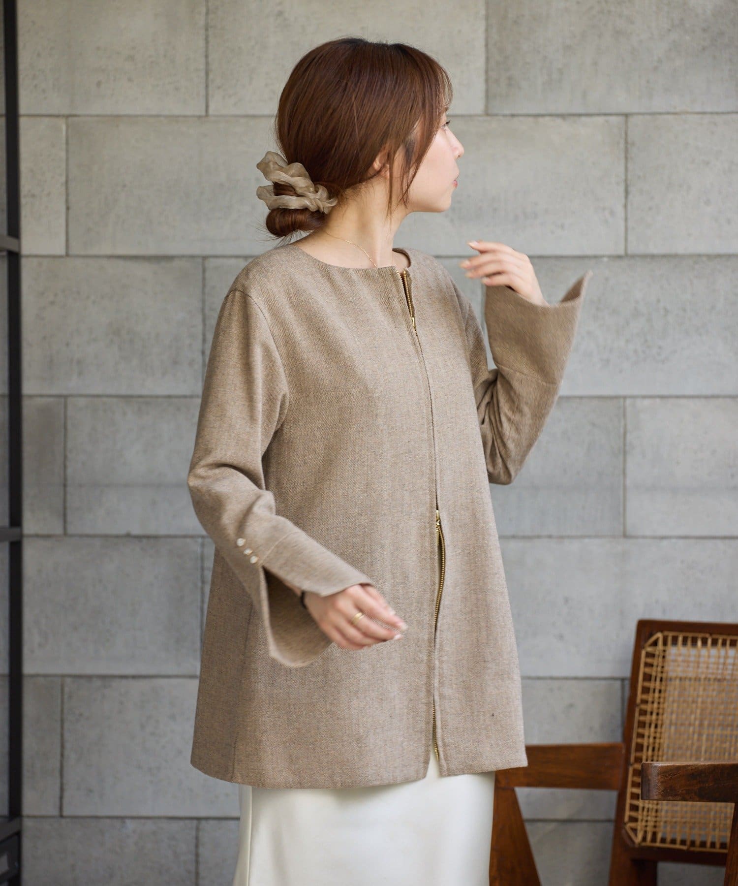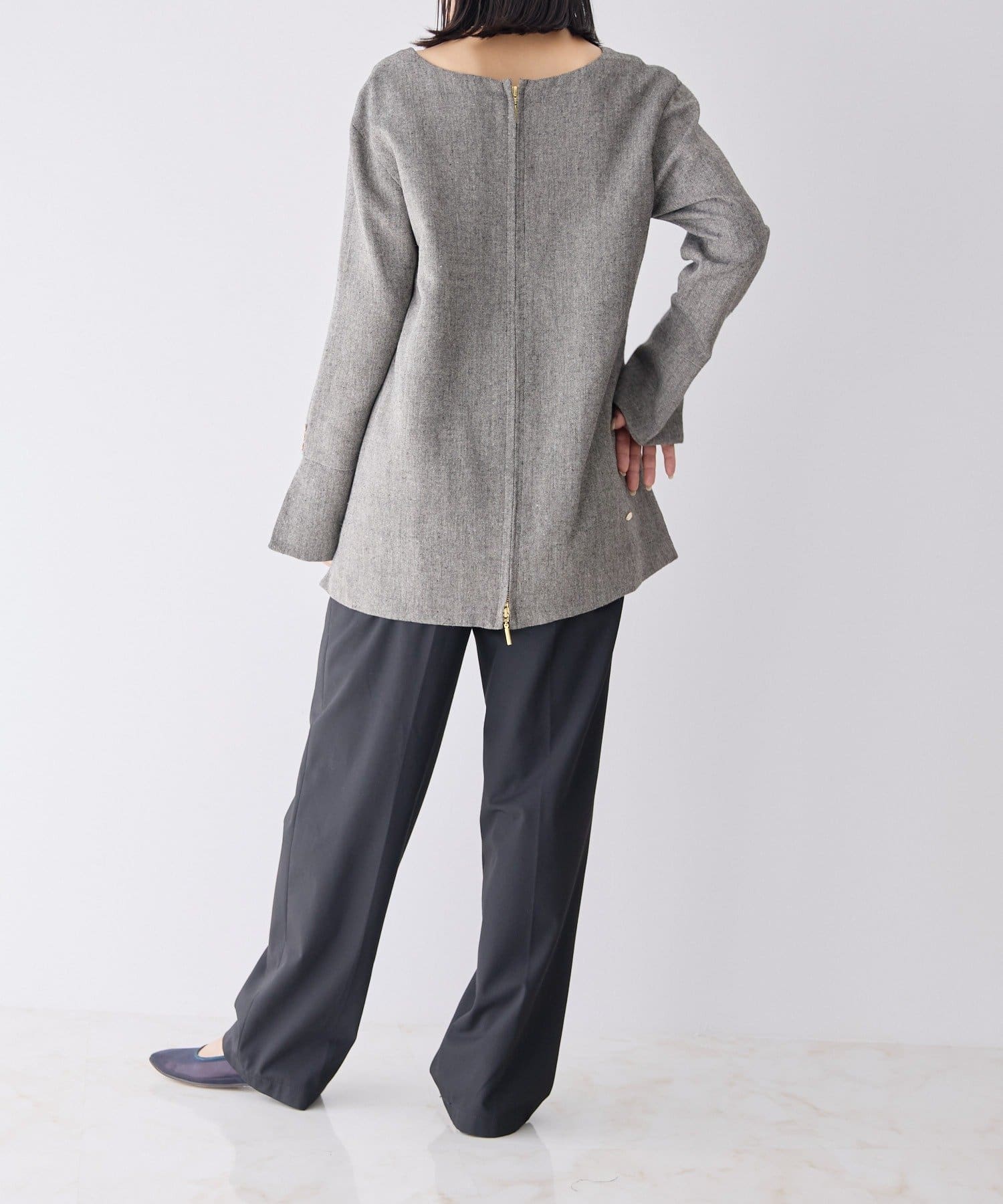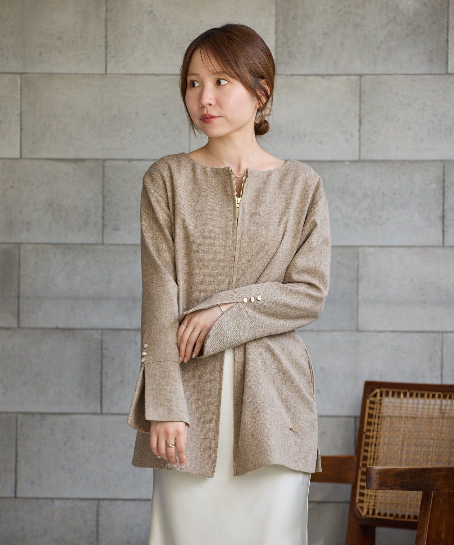 前後どちらでも着られる2WAY仕様なので、トップスとしても、ジャケットとしても着用可能。
