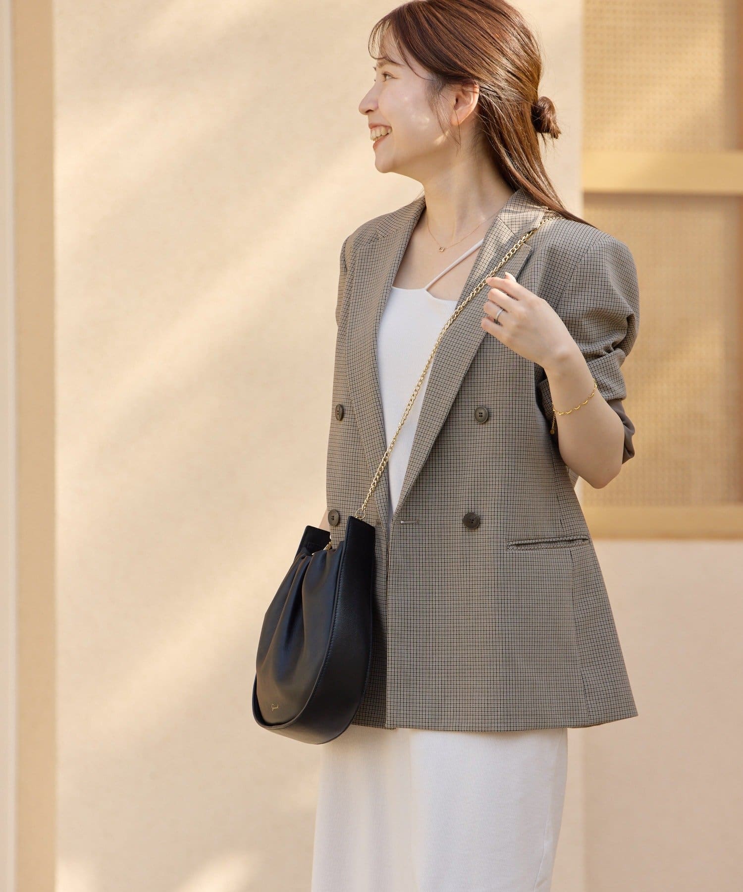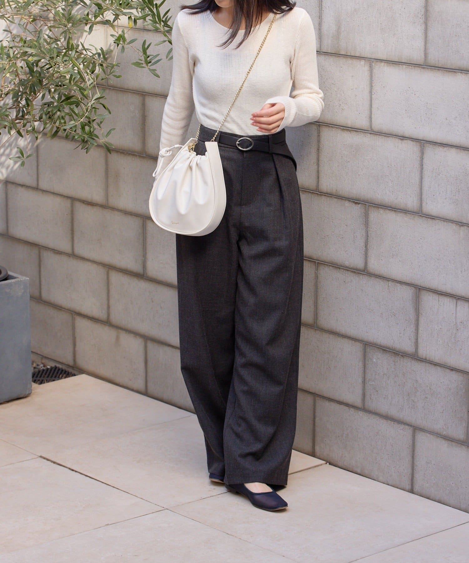 ゴールドのチェーンベルトとのコントラストが美しく、どんなスタイルにも馴染む万能カラー