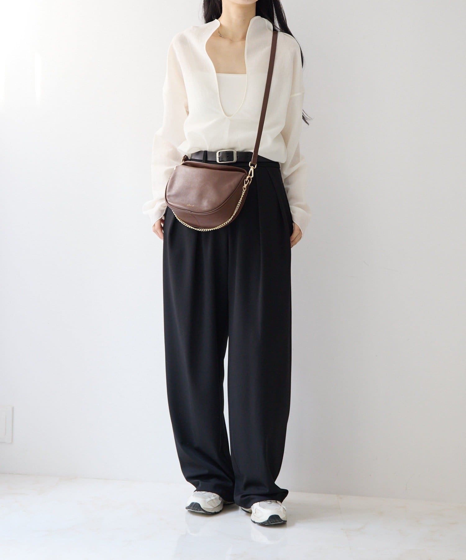 アクセサリー感覚で持てるチェーンベルトはワンショルダーが可能。