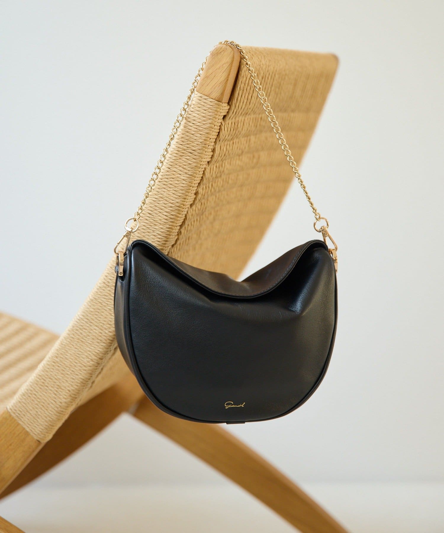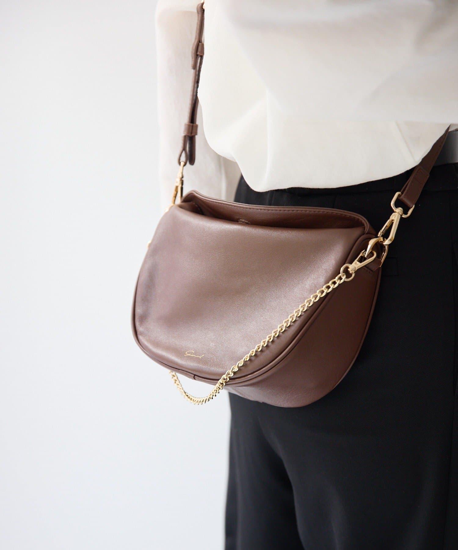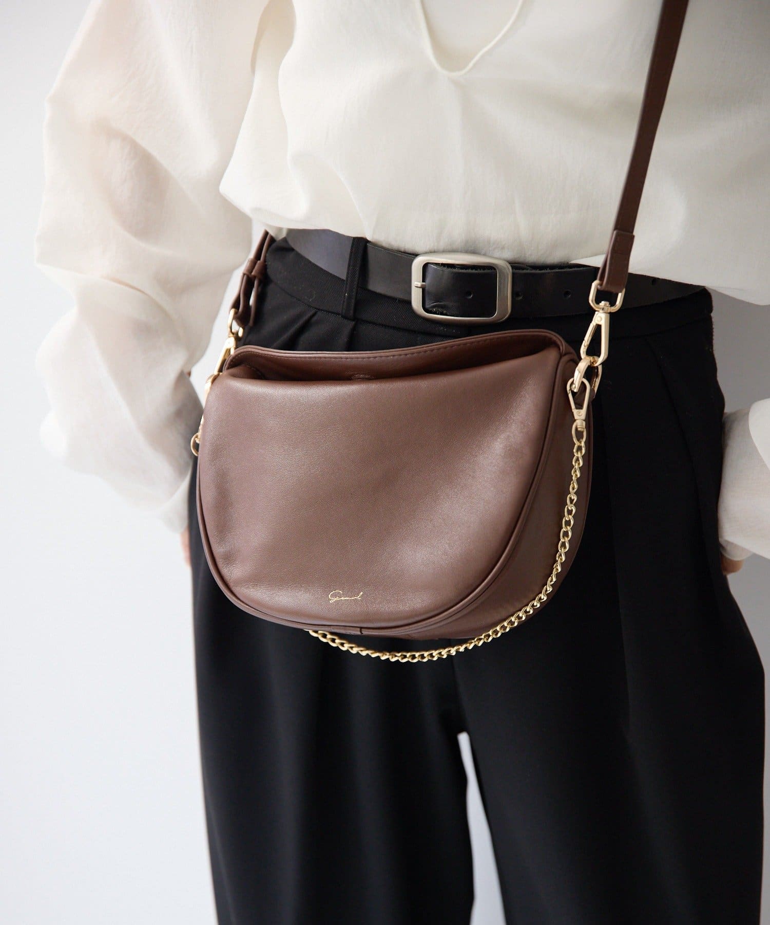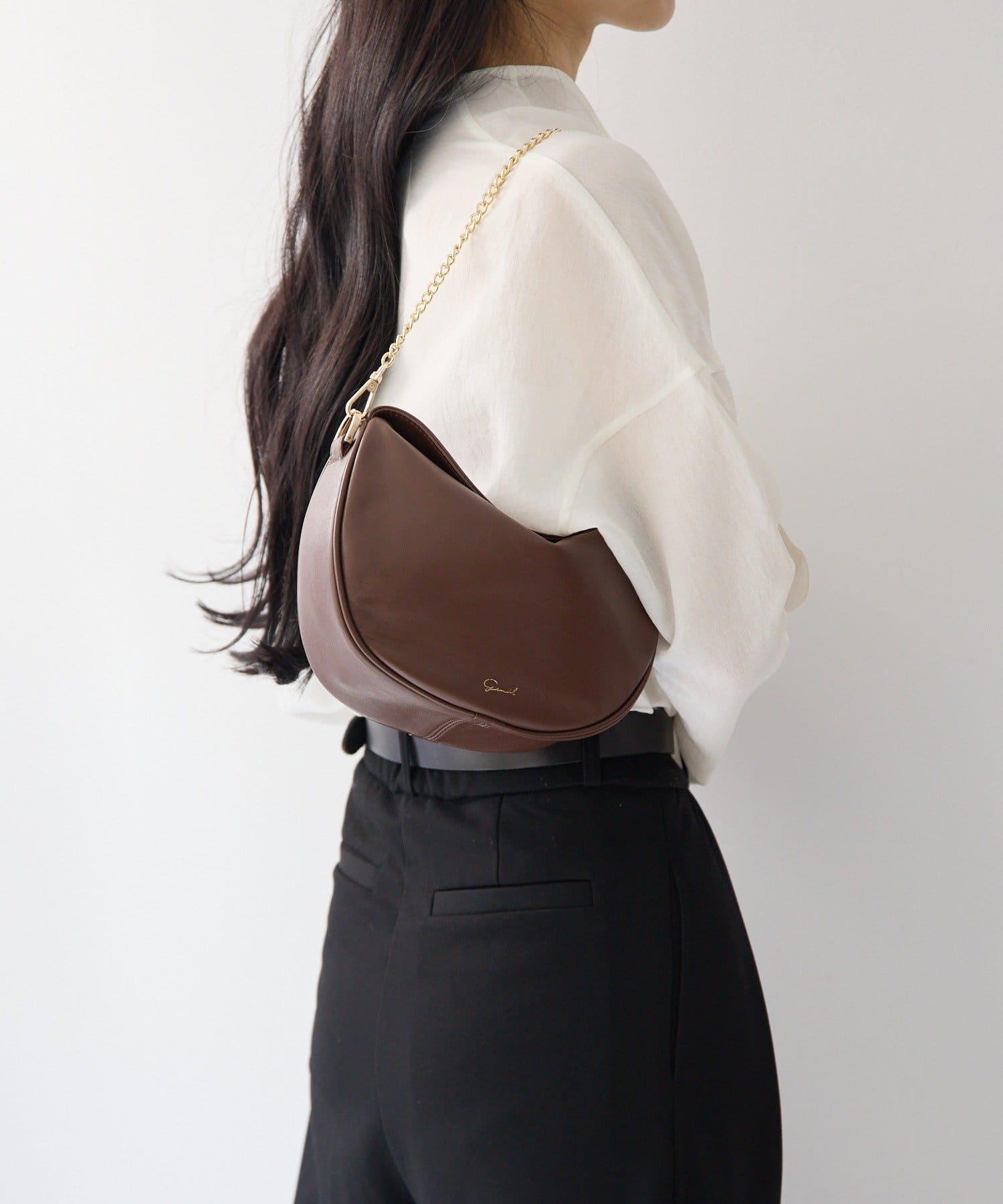 柔らかな質感のレザーを使用した、ハーフムーンシルエットが美しいショルダーバッグ。