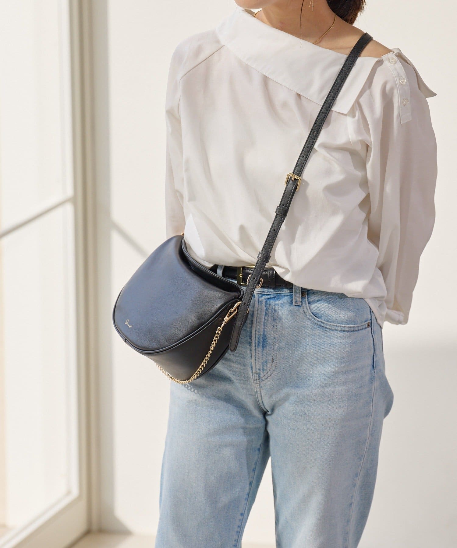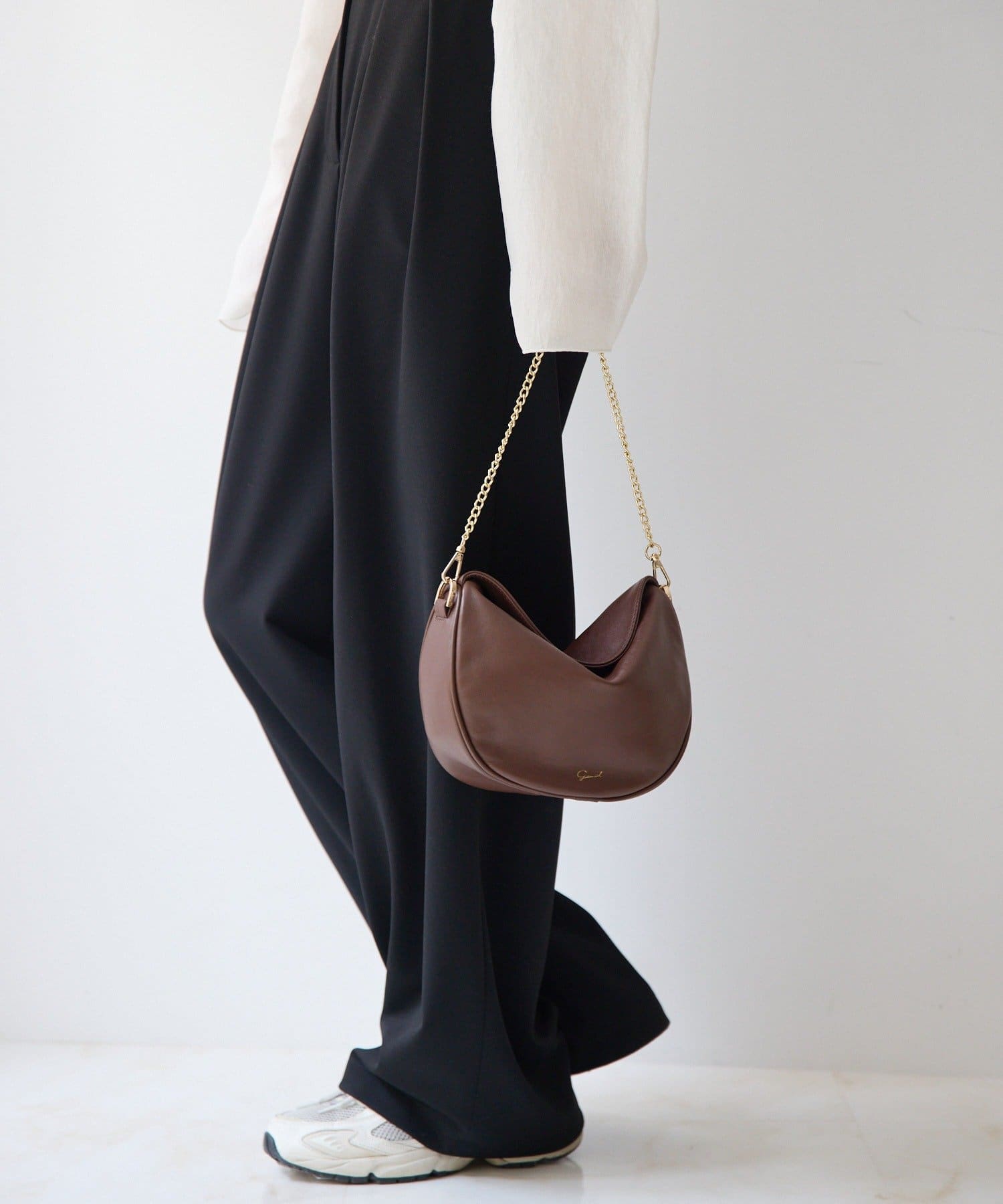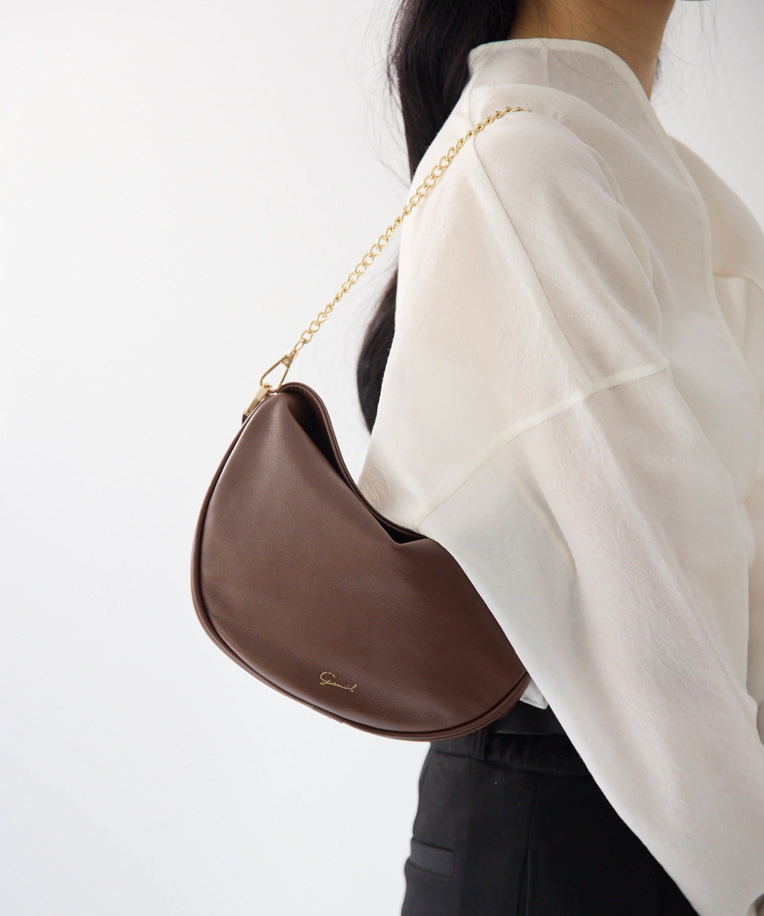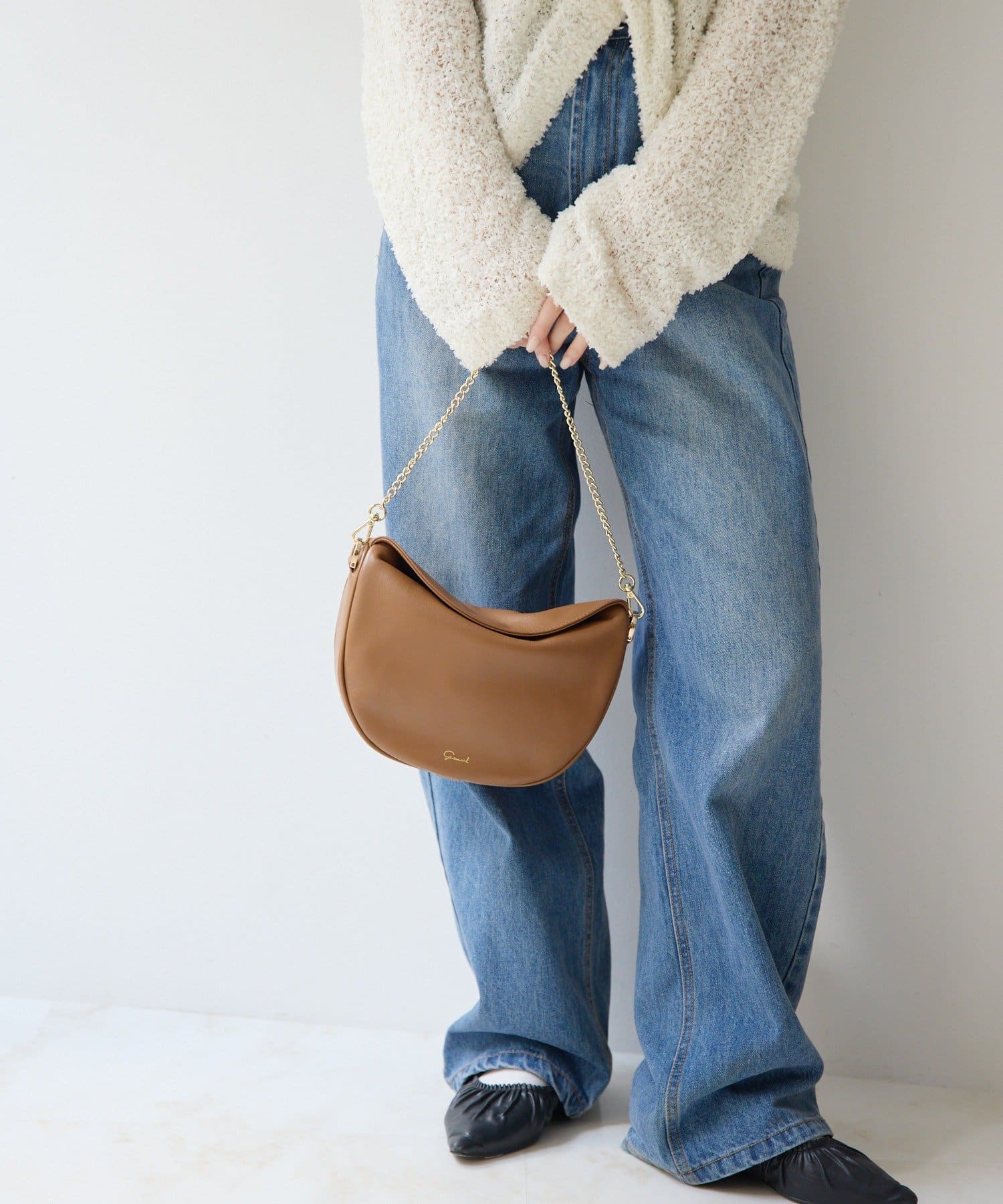 柔らかな質感のレザーを使用した、ハーフムーンシルエットが美しいショルダーバッグ。