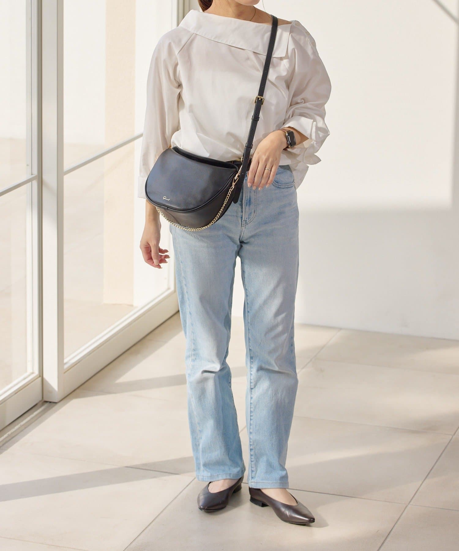 長さ調節が可能なレザーベルトはアクティブに過ごしたい日や、カジュアルなデニムスタイルの日にも。