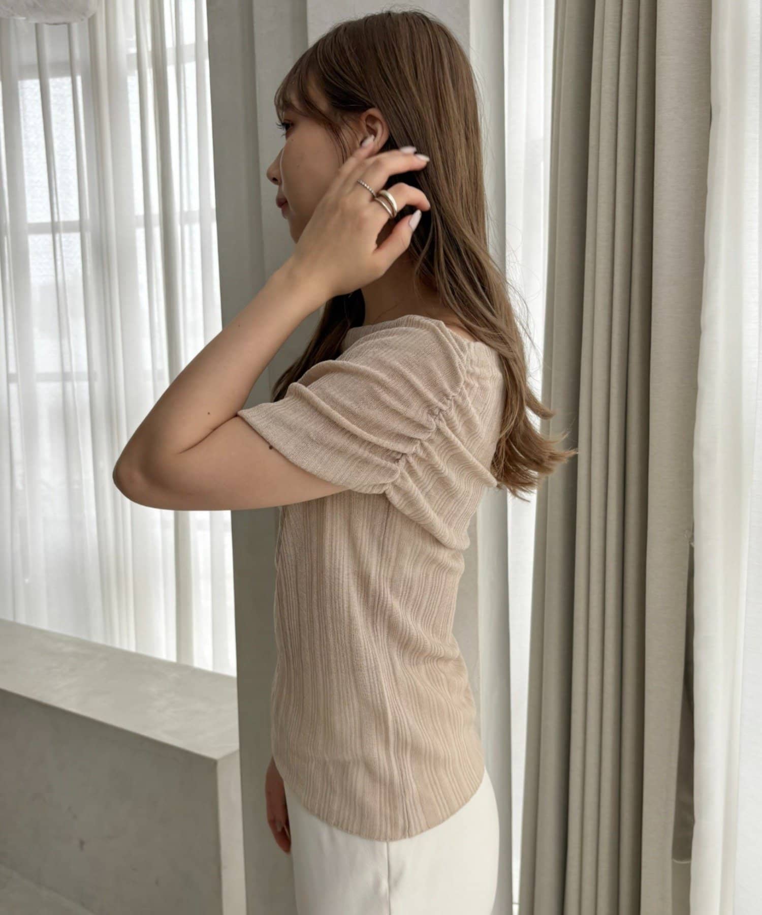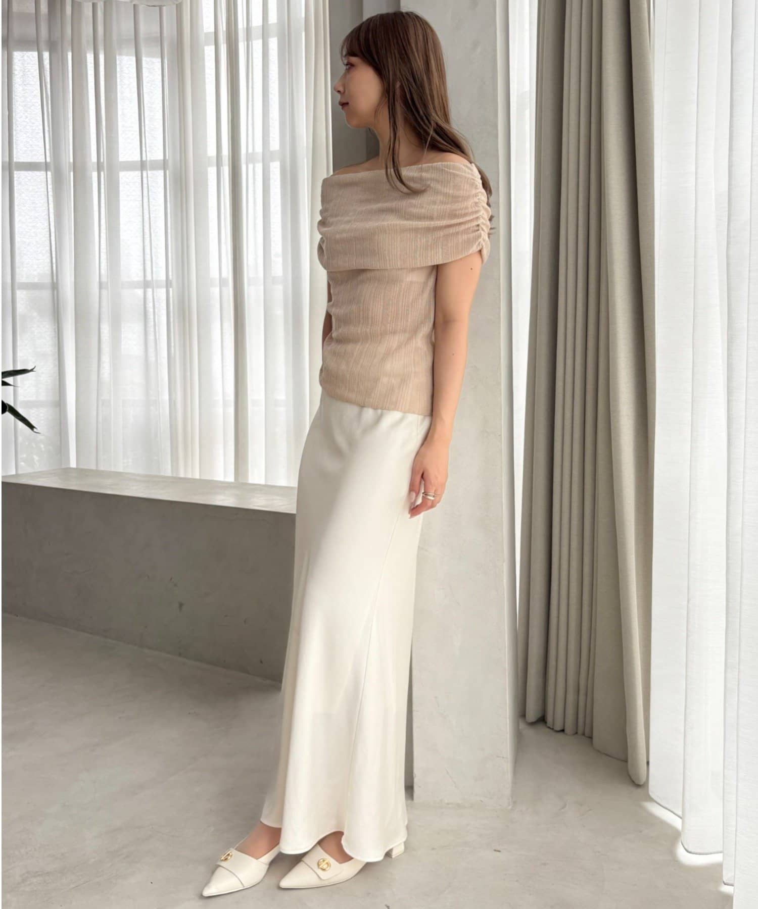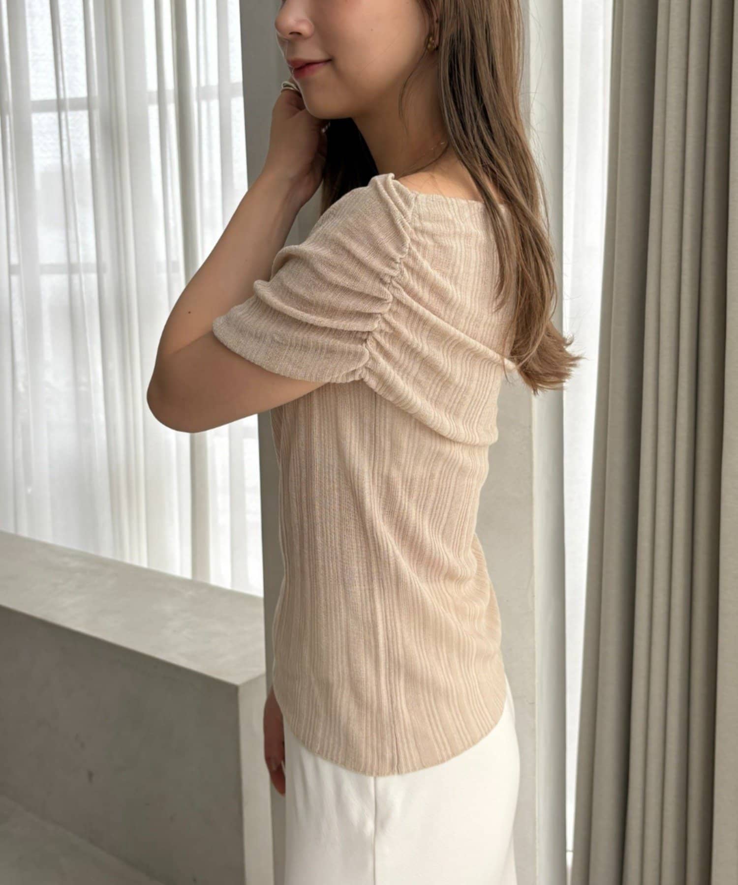 片側にはギャザーが施されており、くしゅっとしたニュアンスが生まれます。