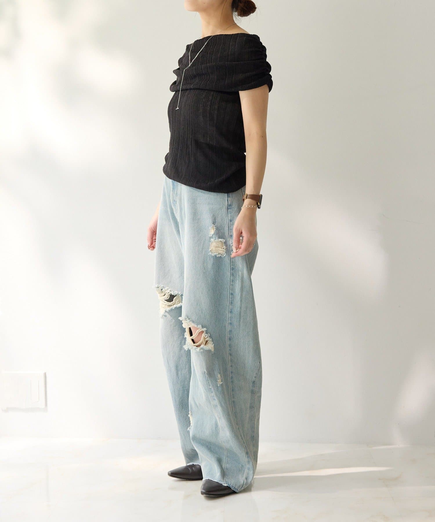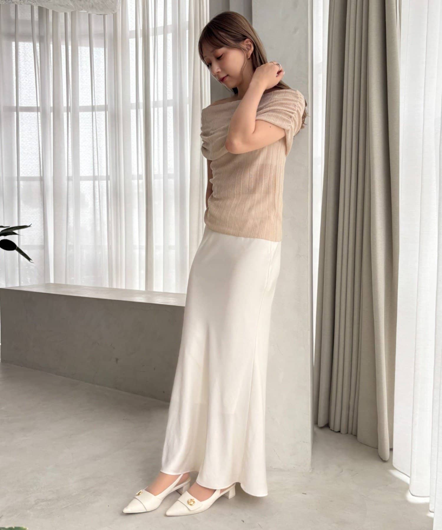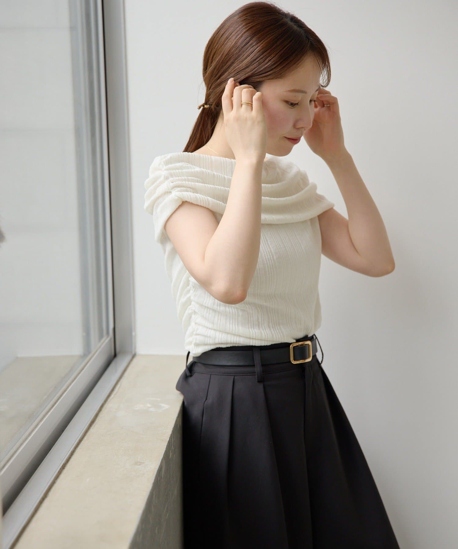 片側にはギャザーが施されており、くしゅっとしたニュアンスが生まれます。