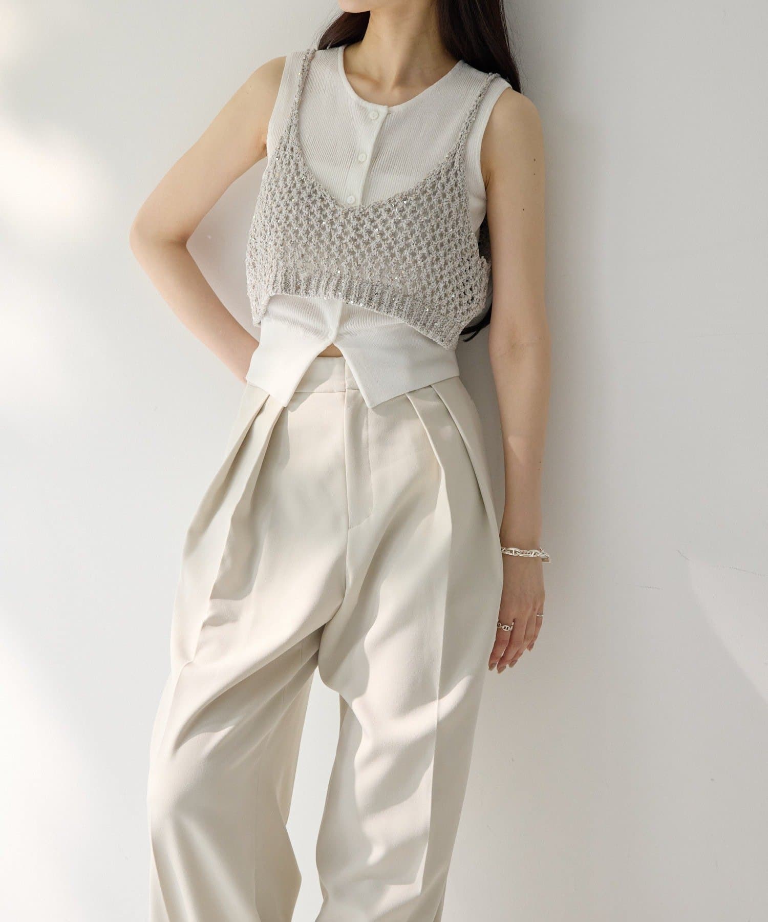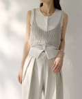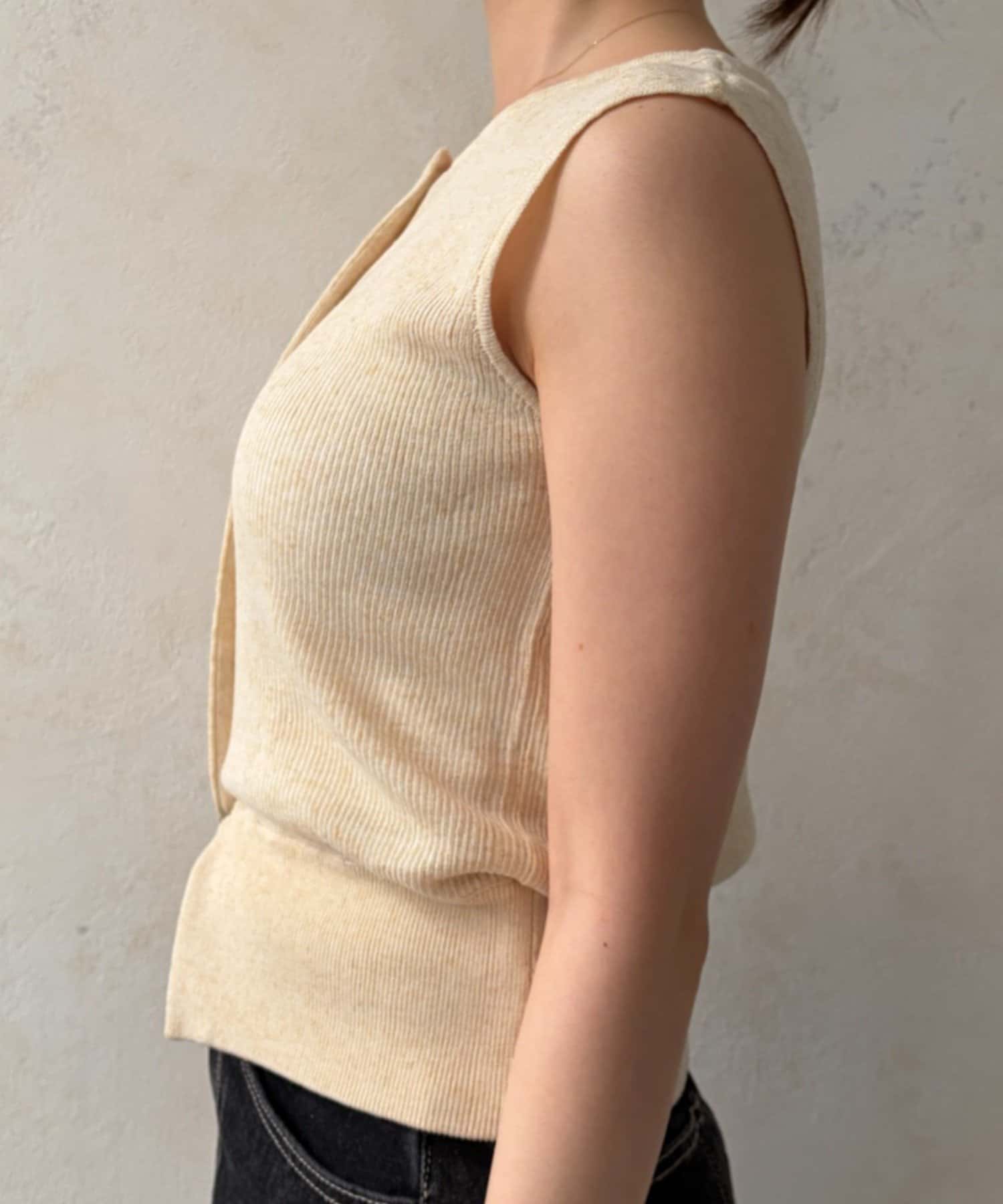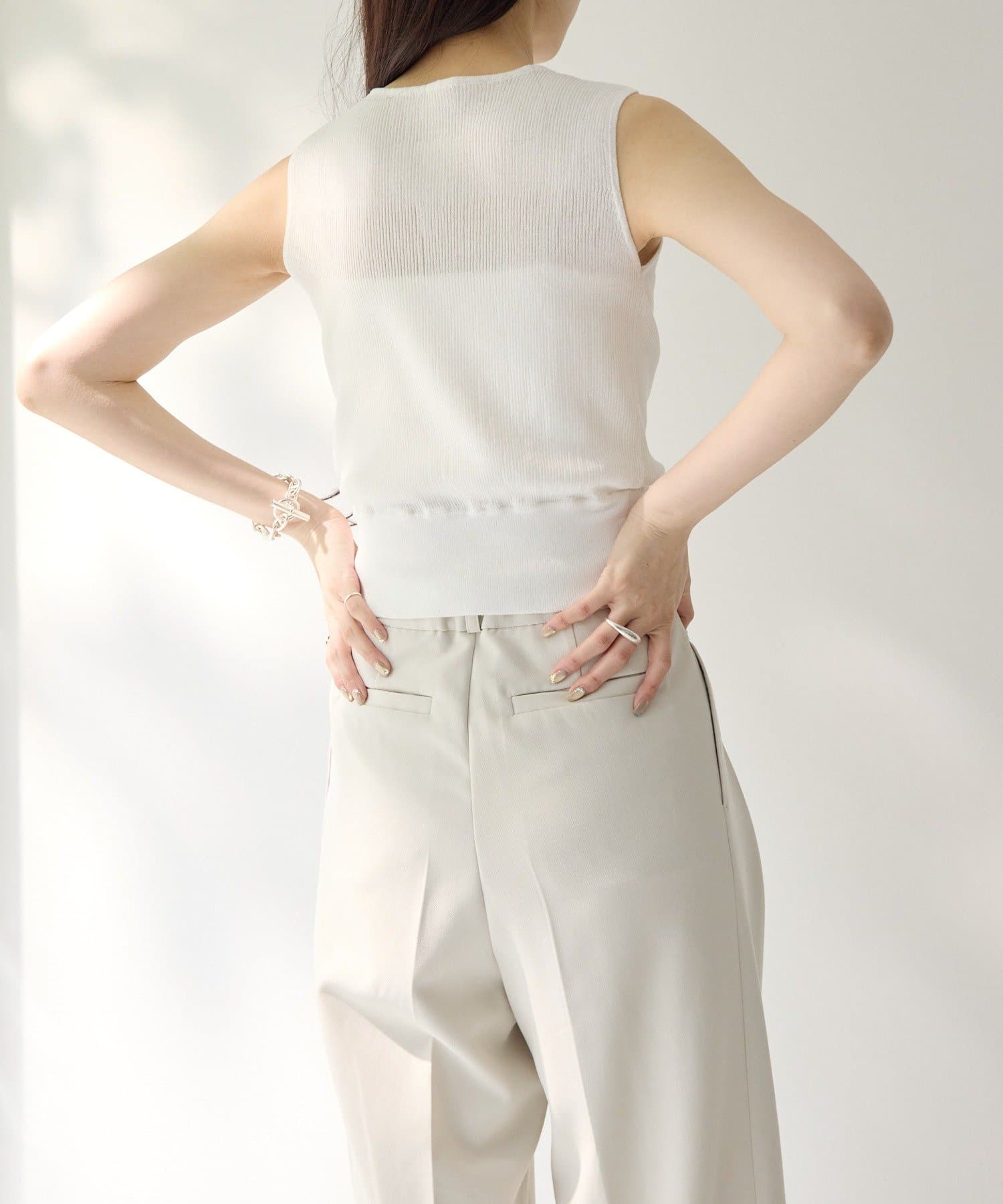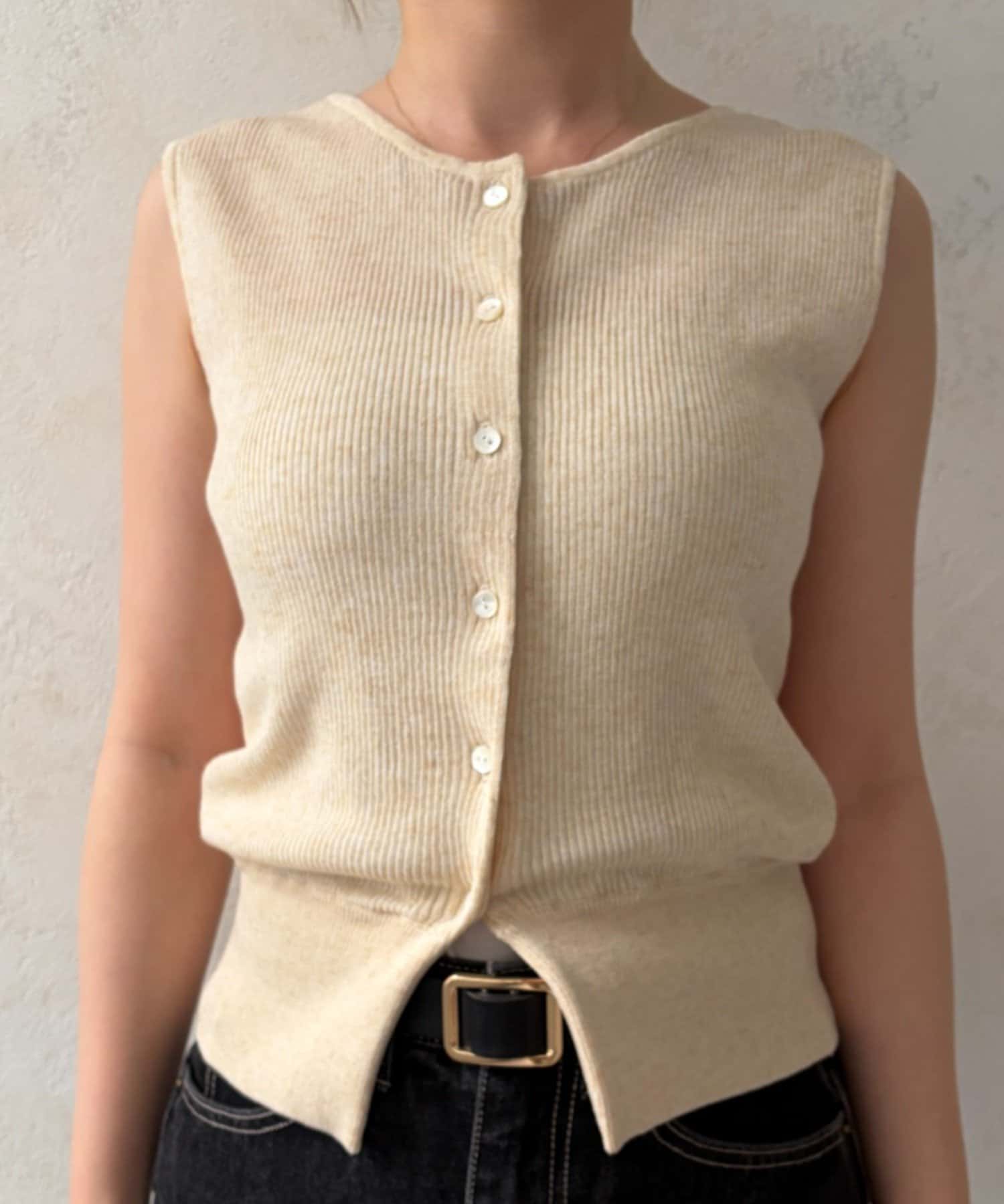 インナーのノースリーブカーディガンは、縦のラインを強調してくれるリブ素材を使用。