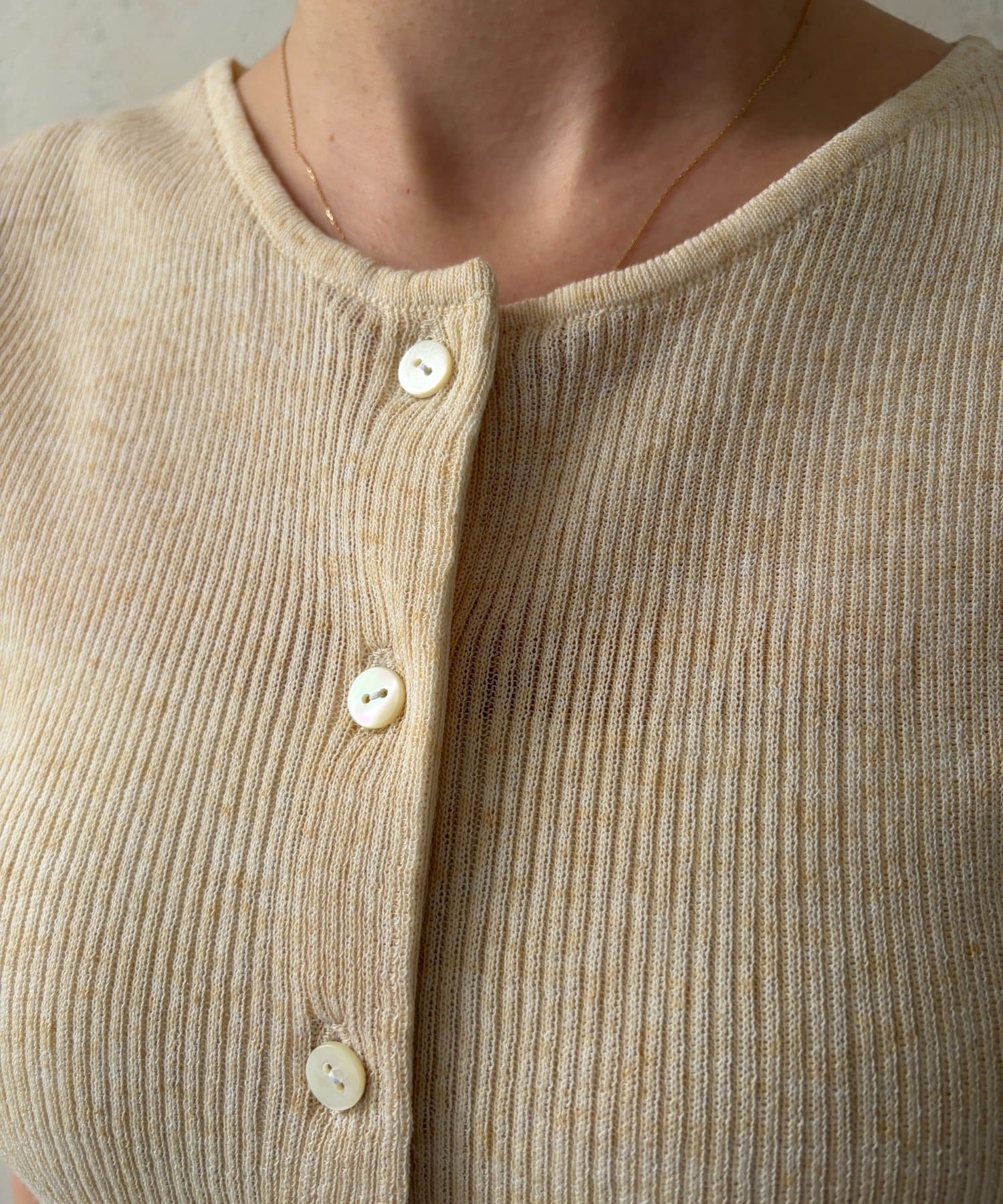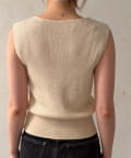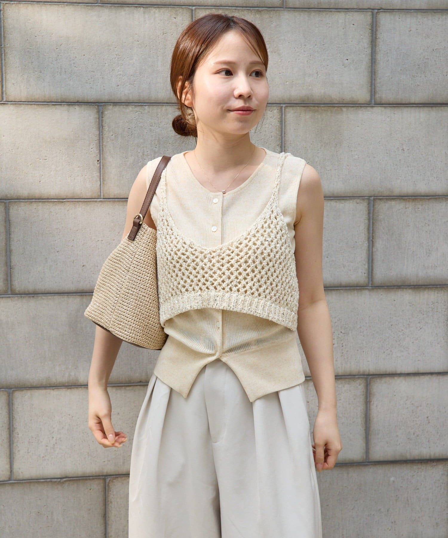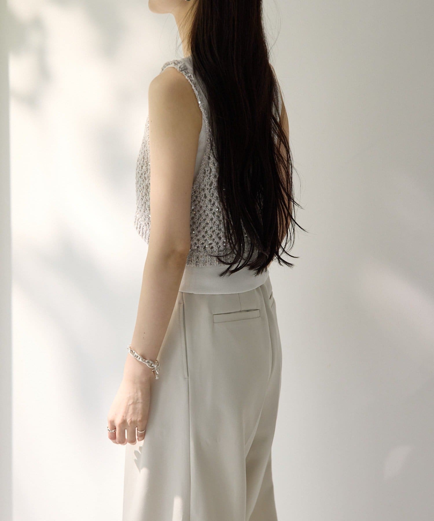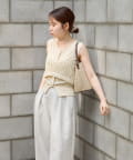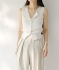 インナーのノースリーブカーディガンは、縦のラインを強調してくれるリブ素材を使用。