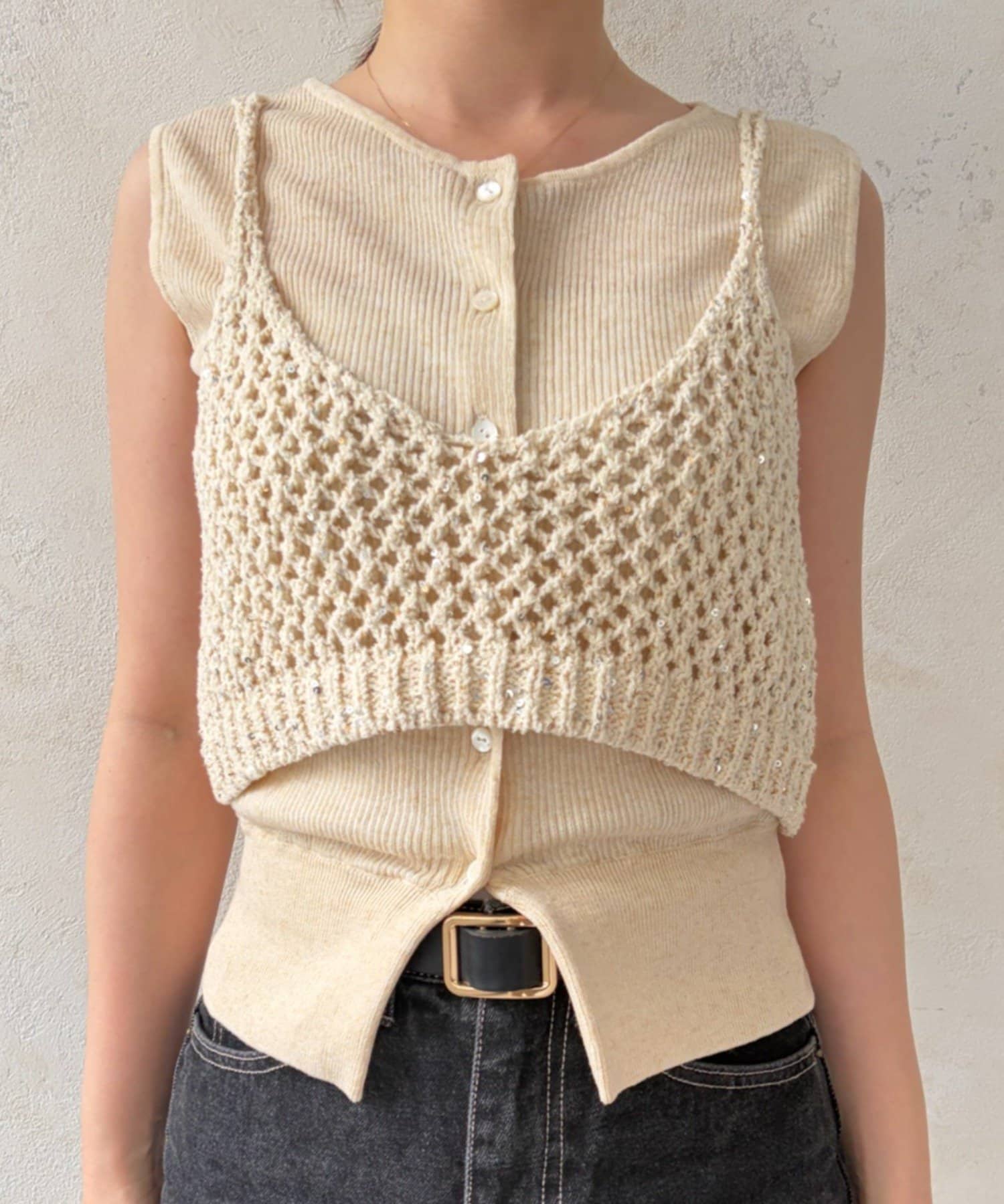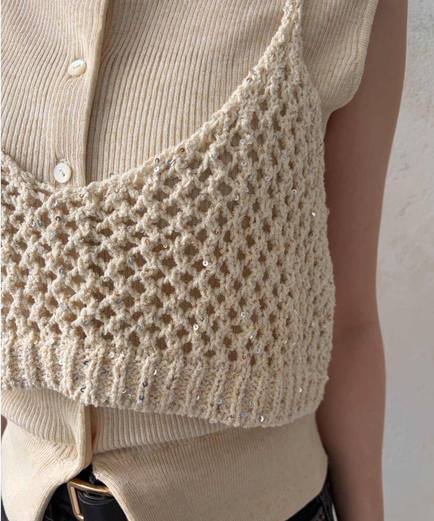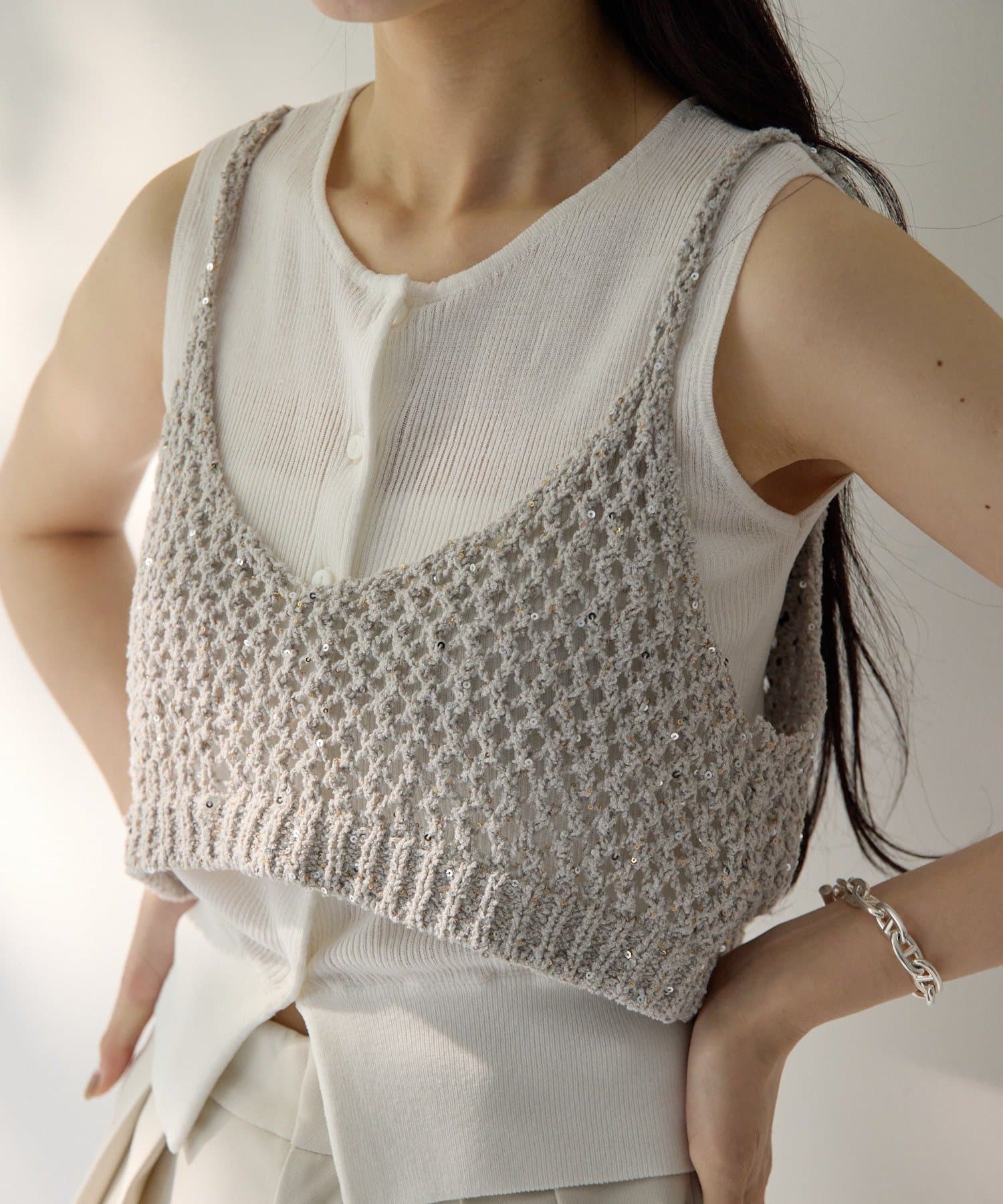 ラメビスチェとノースリーブカーディガンのアンサンブルアイテム。