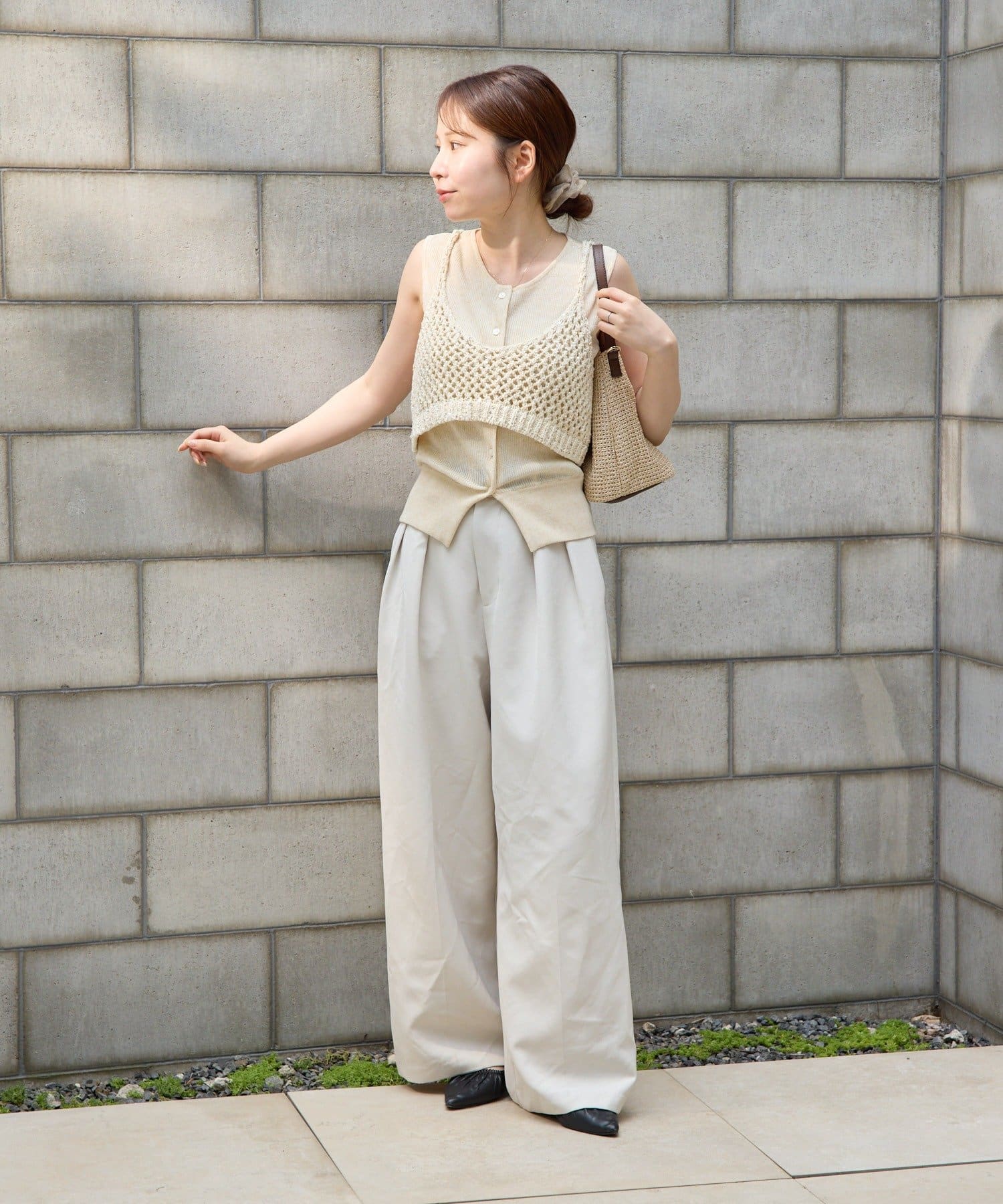 ・ワントーンでまとめたワイドパンツやスラックスと合わせて、リラックス感がありつつも洗練された、こなれ感のあるきれいめカジュアルスタイルに。