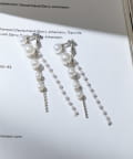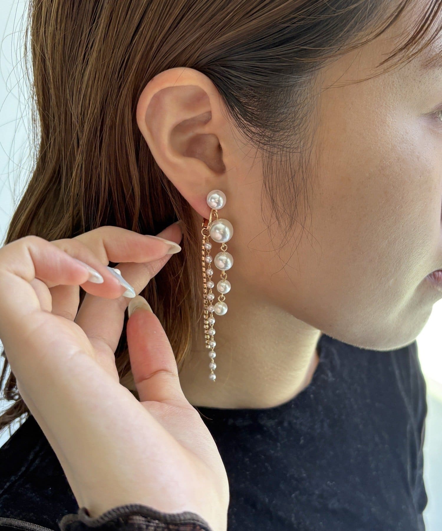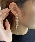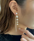 大きさの異なるパールが連なるラインと、繊細なストーンがきらめくチェーンがアシンメトリーにデザインされており、動くたびに優雅に揺れて女性らしさを引き立てます。