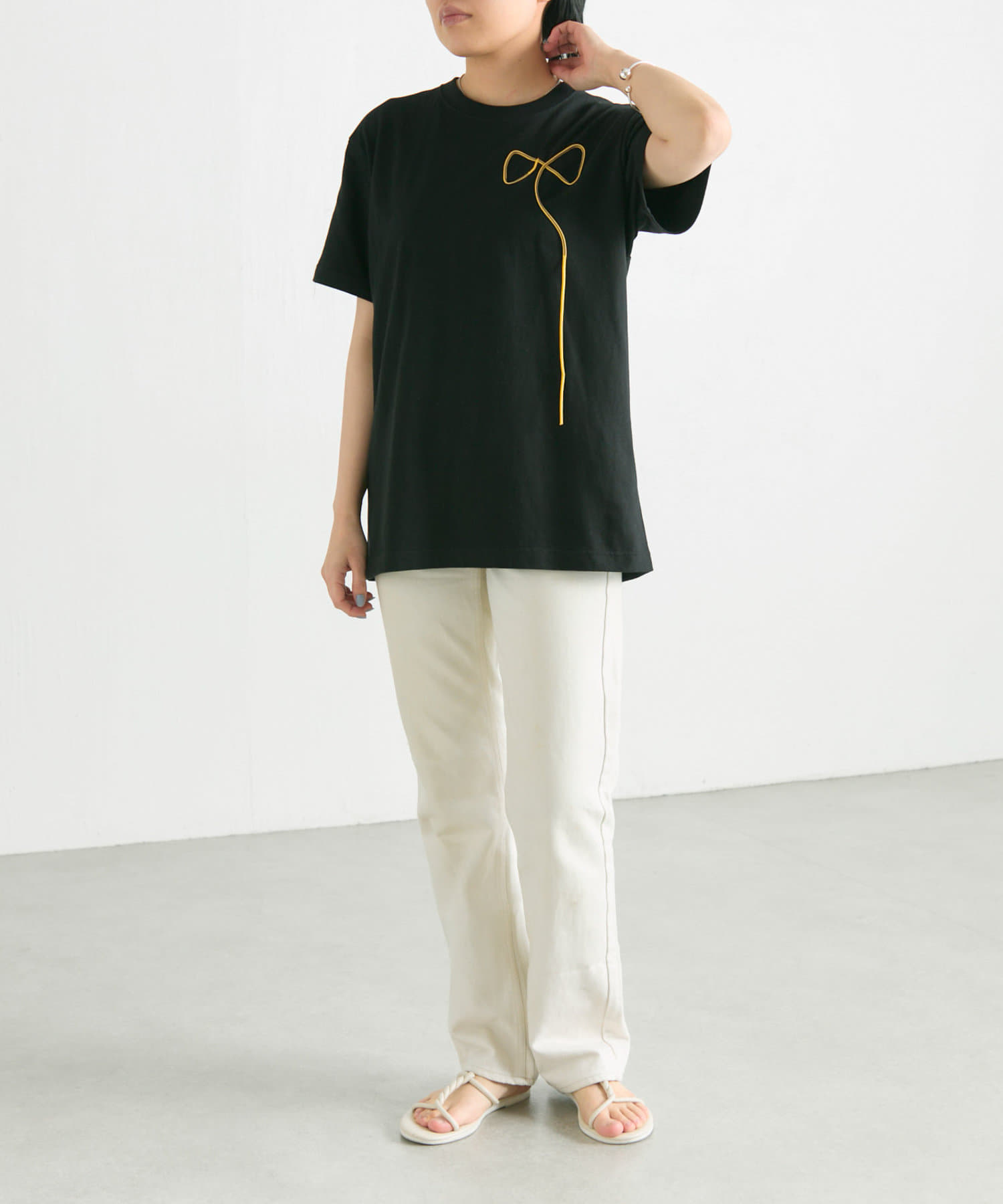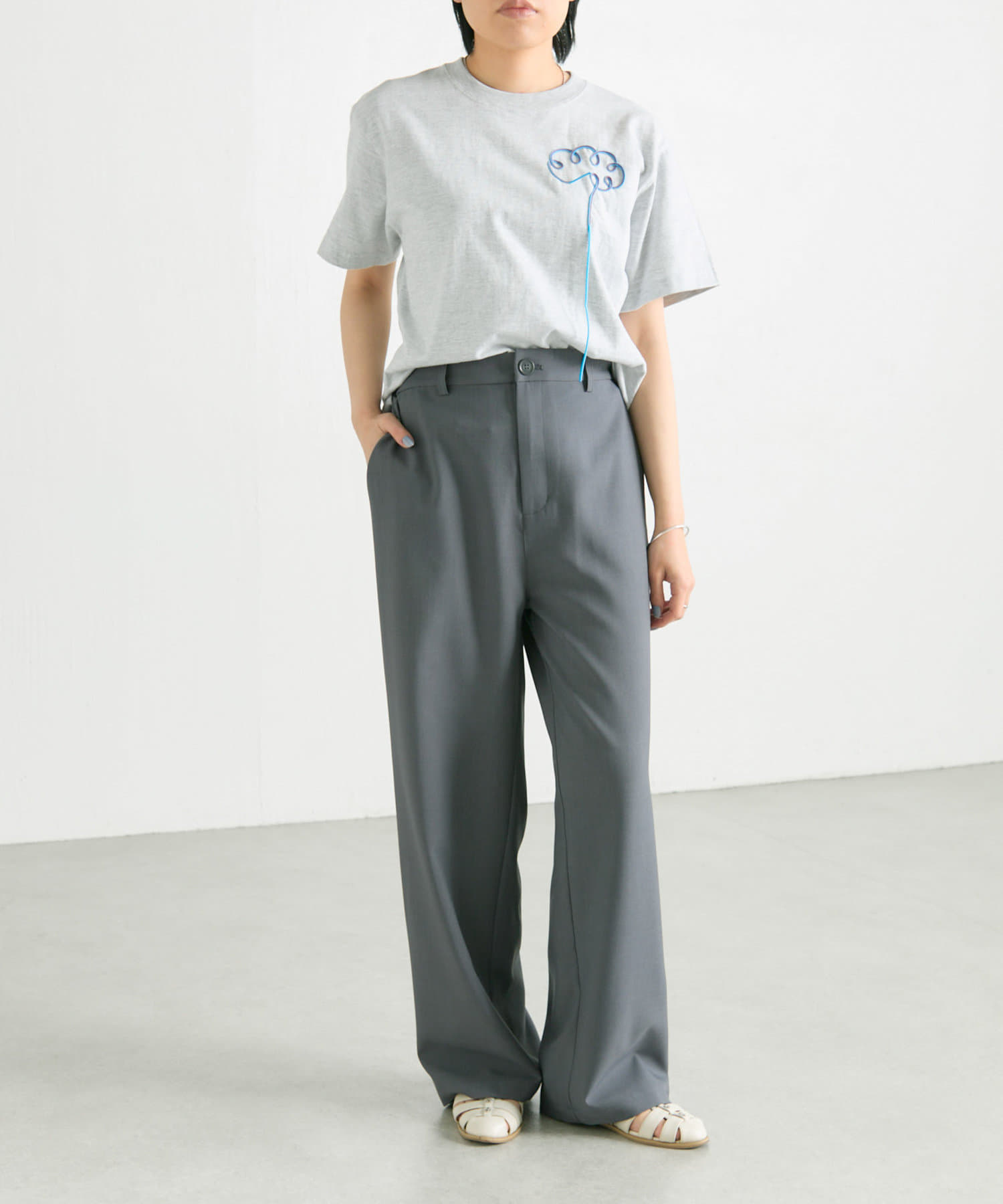 また、ワンポイントのシンプルなデザインなので柄物のボトムスとも相性良くまとまりやすいです。
