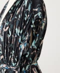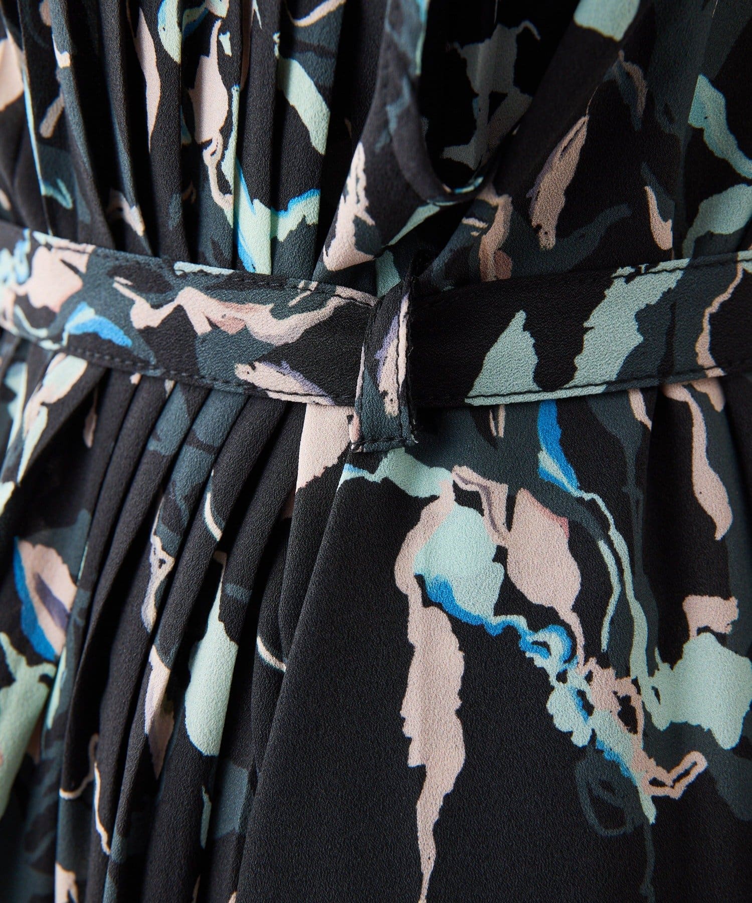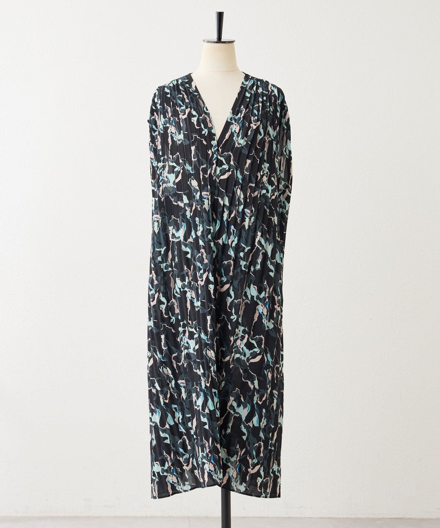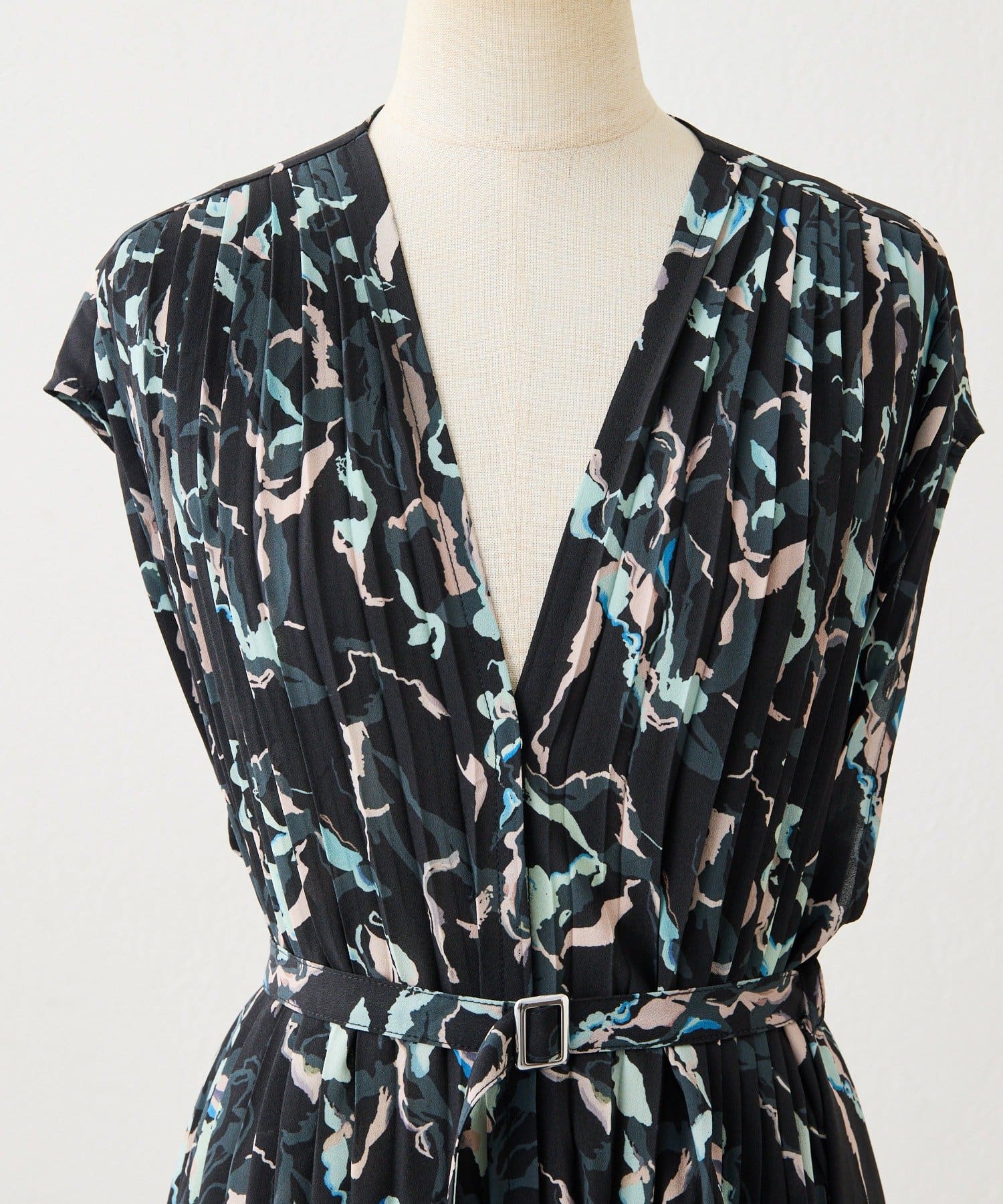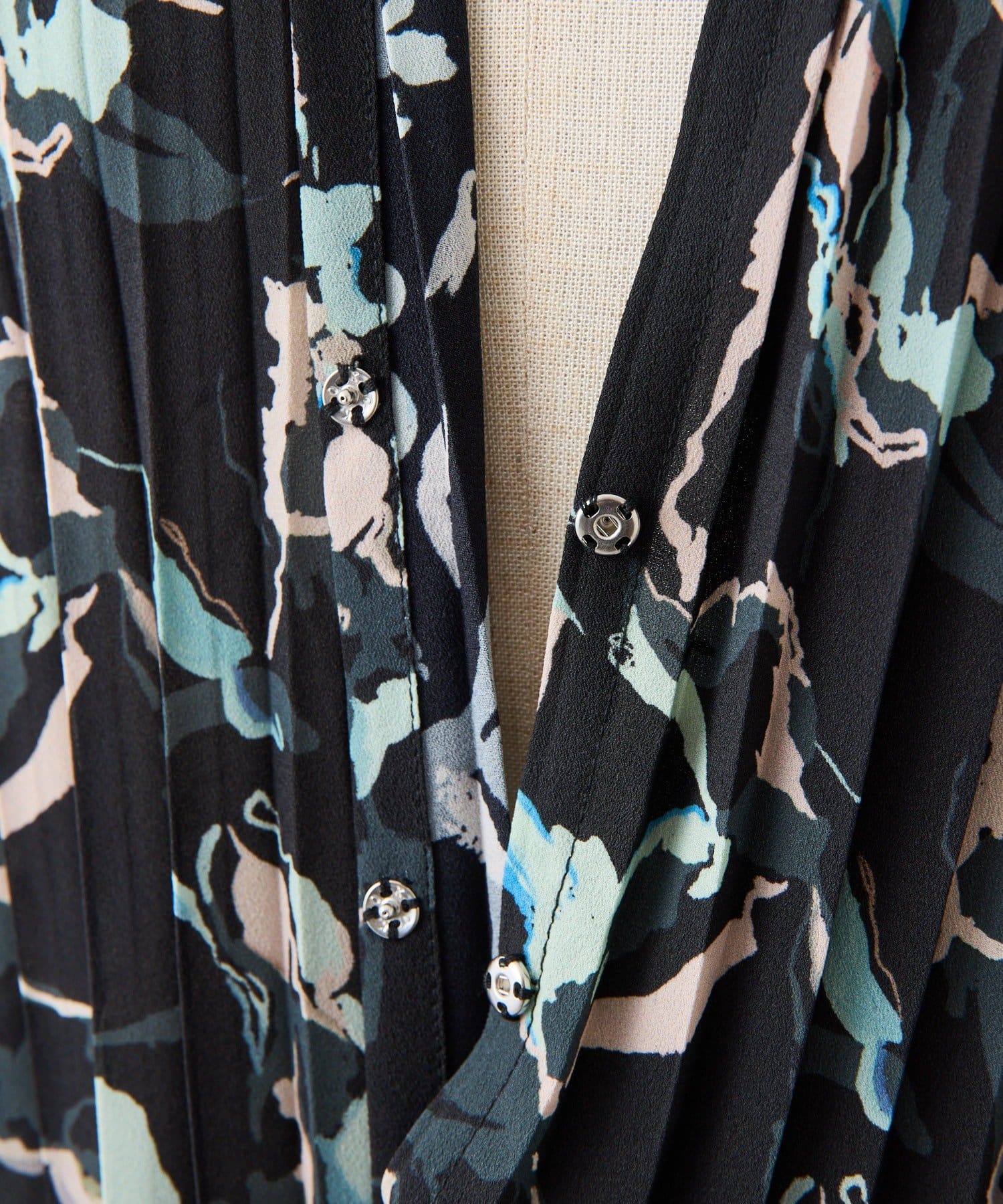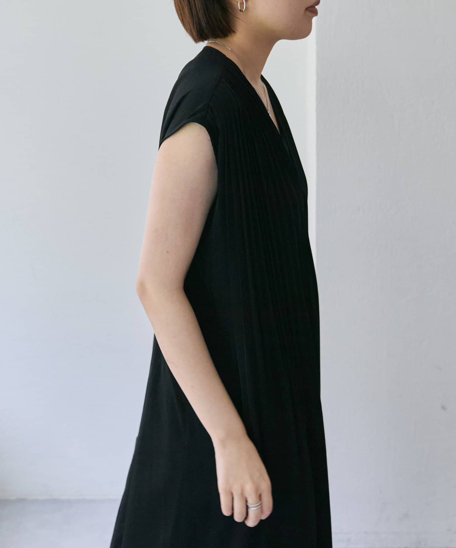 Vネックと縦ラインを強調するプリーツですっきりとして見えます。
