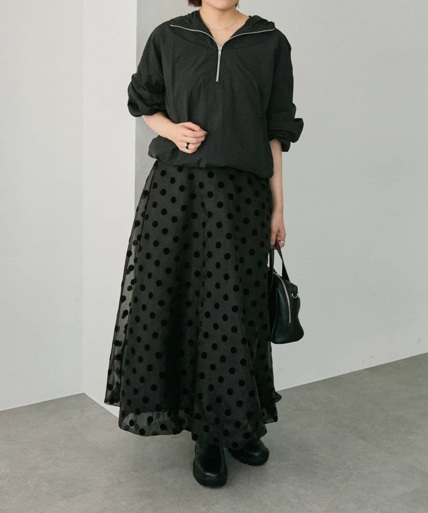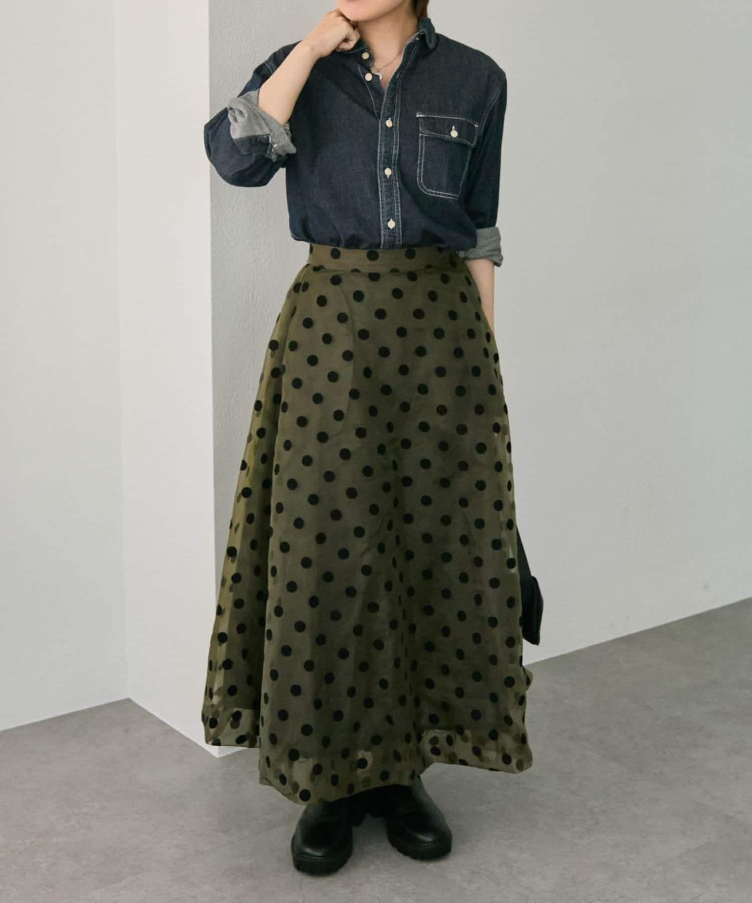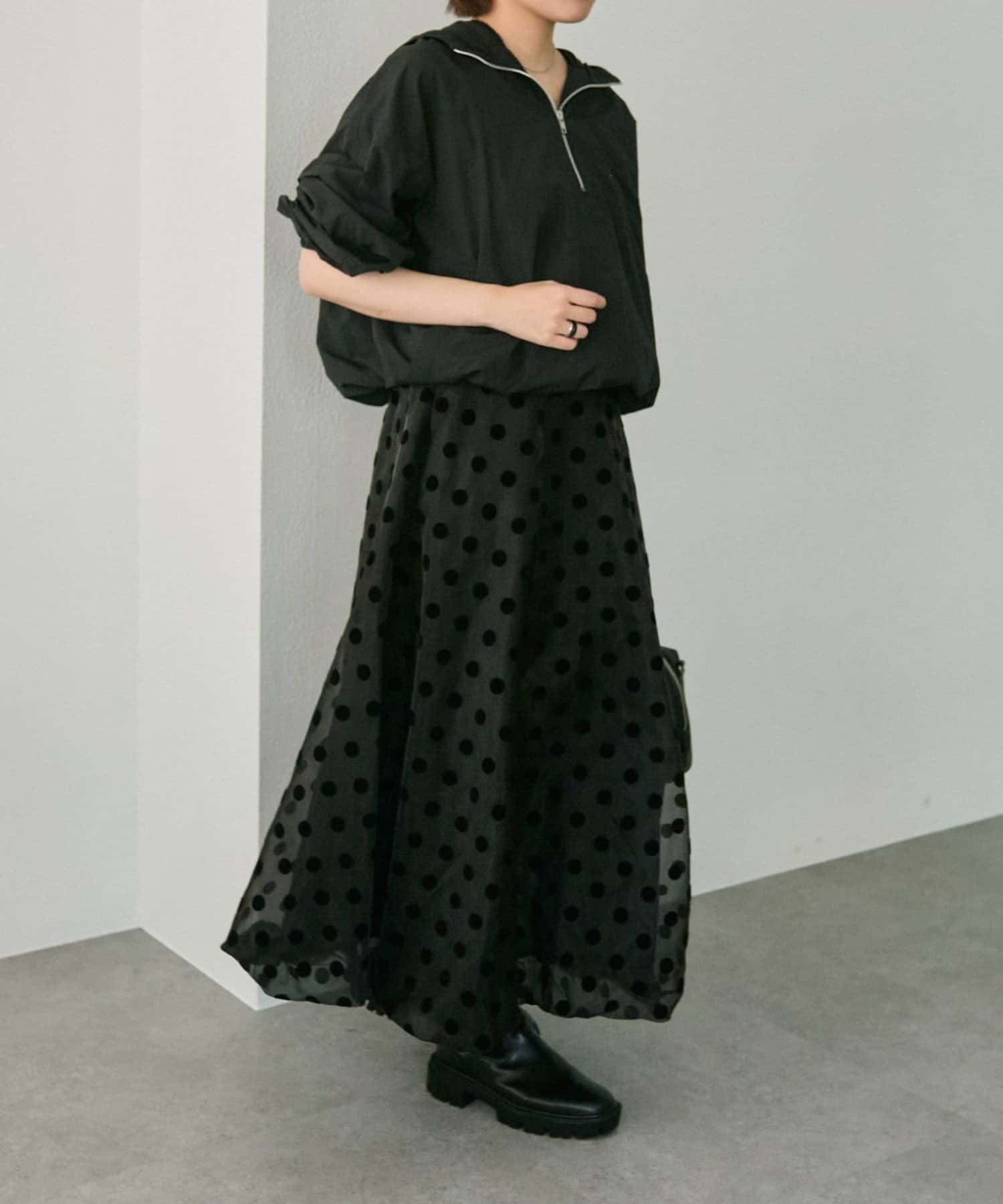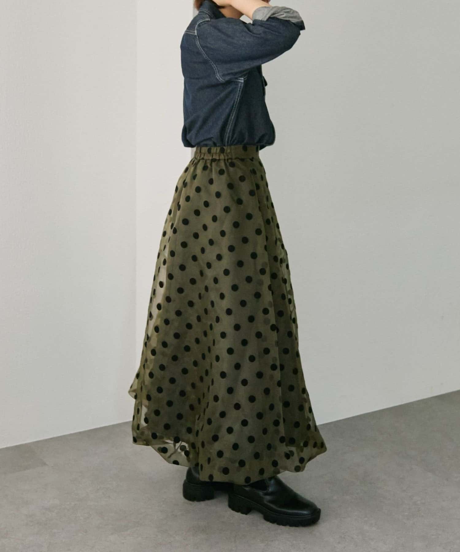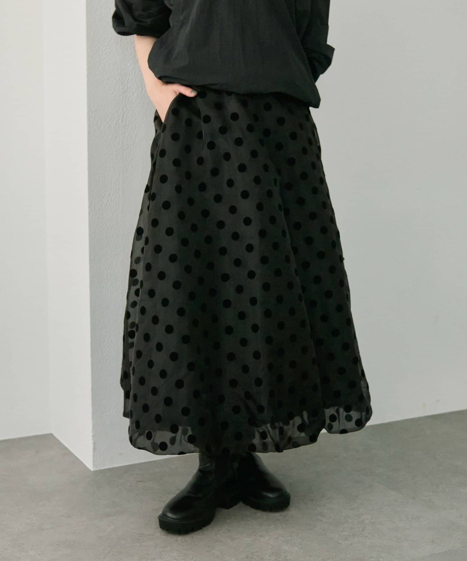 ふんわりと広がりのあるシルエット×ドット柄がポイントのスカート