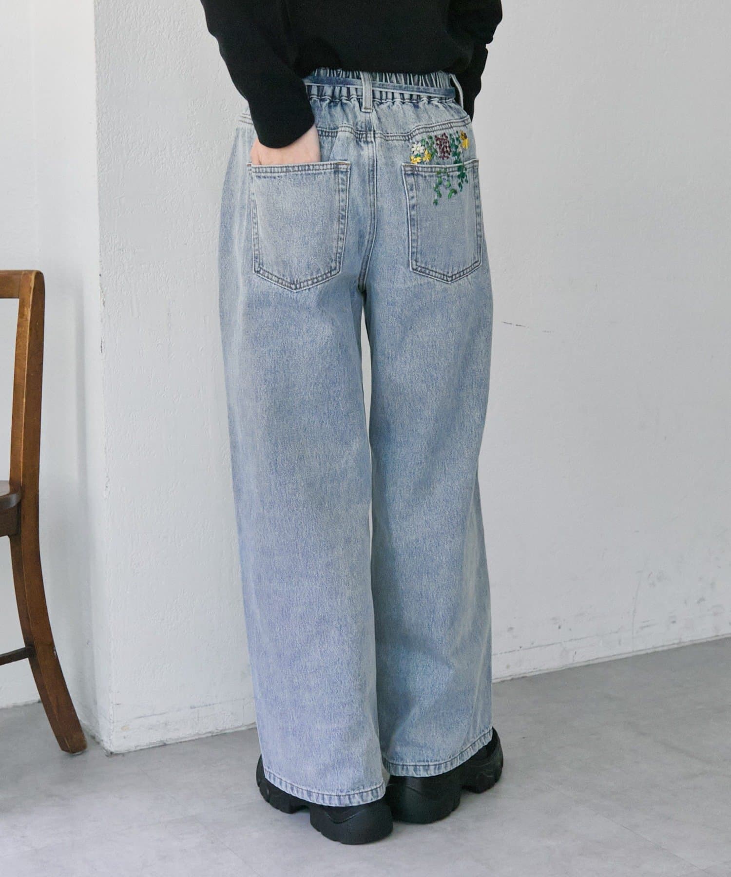 《バックウエストゴム/切替入り》ポケット花刺しゅうデニム【SUM1 STYLE(スミスタイル)】