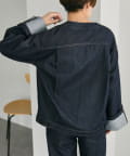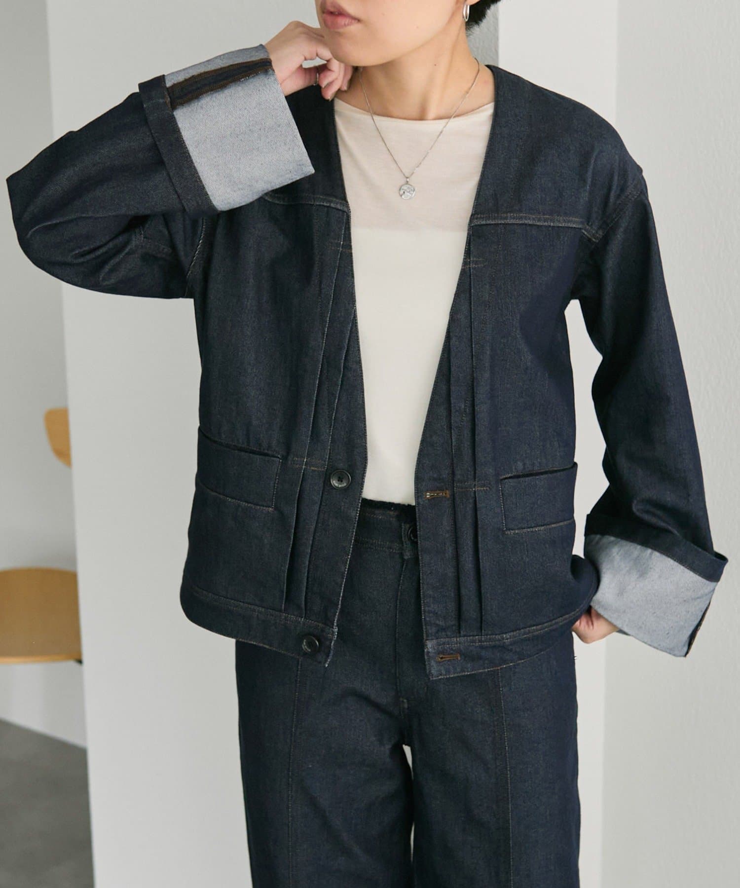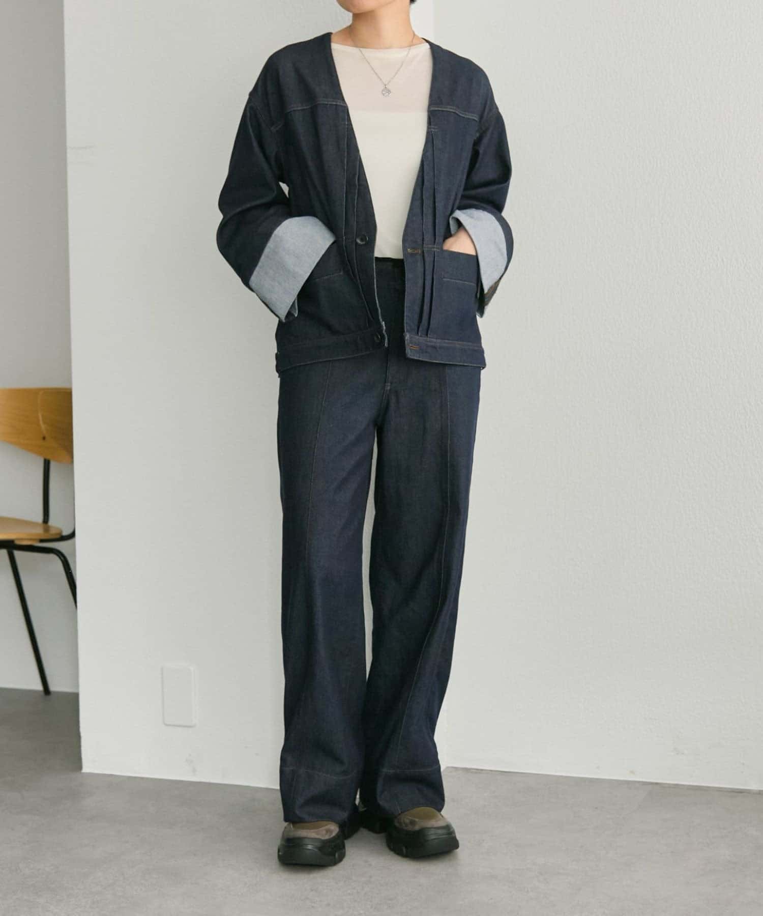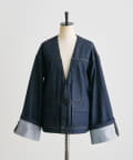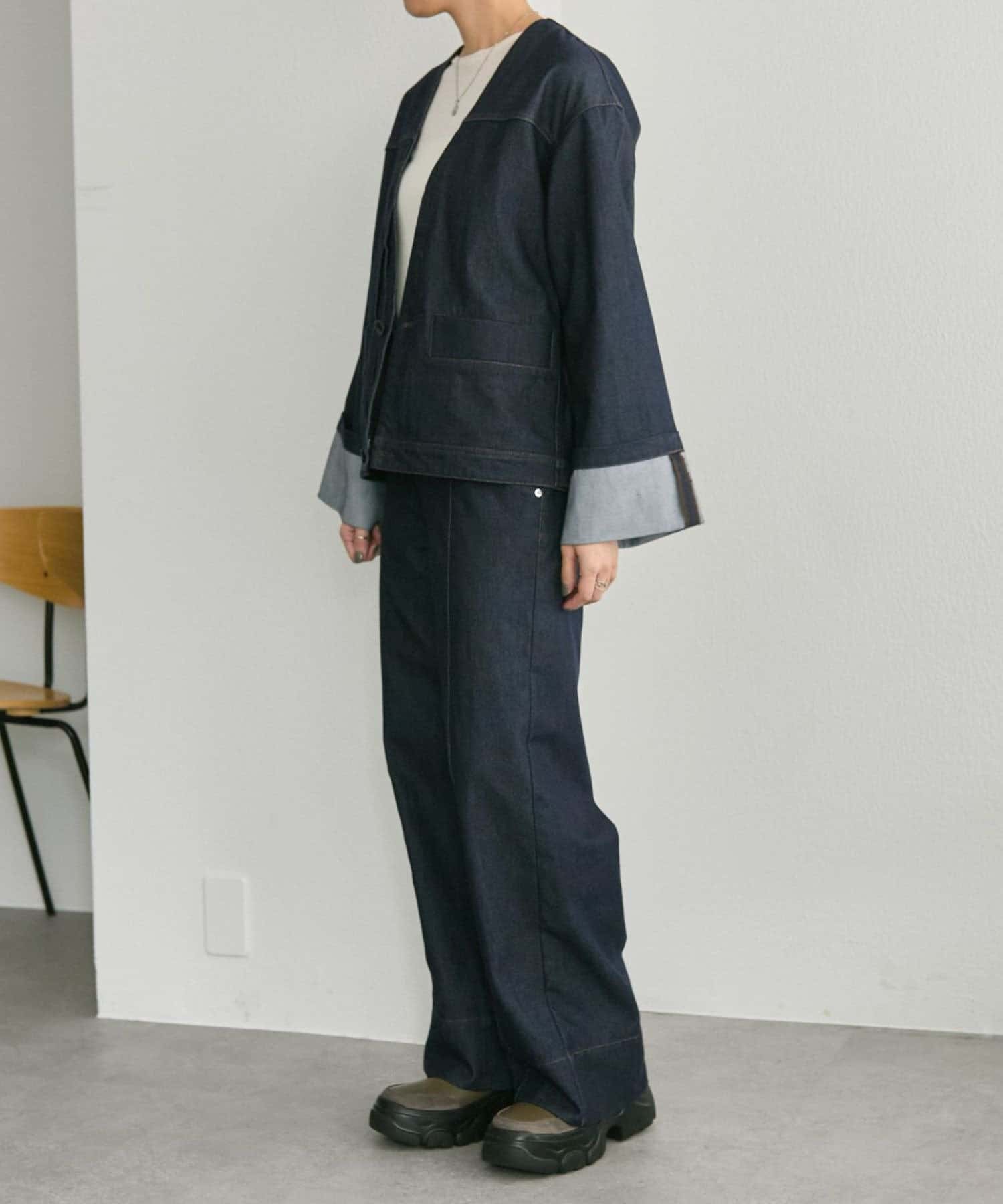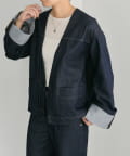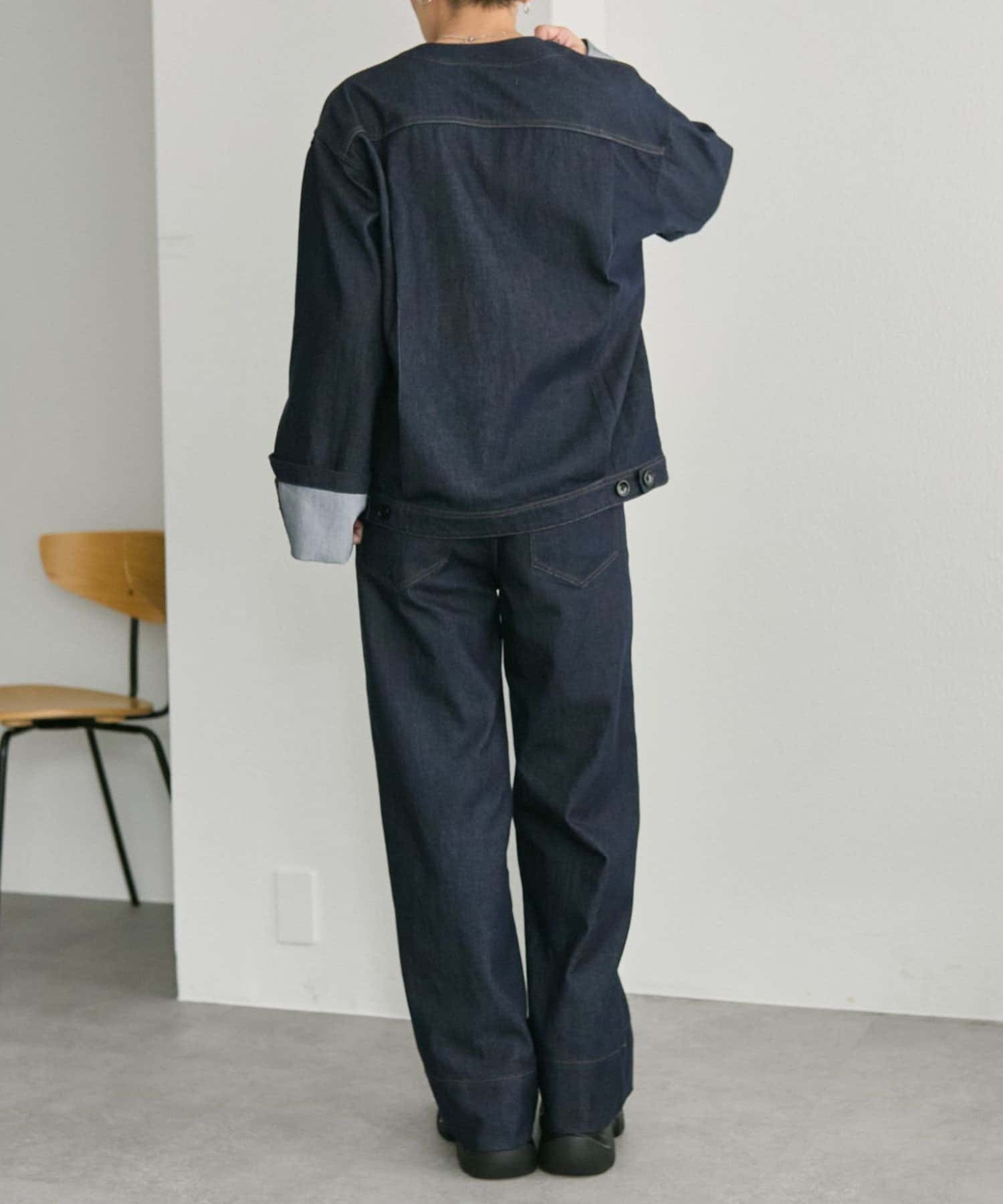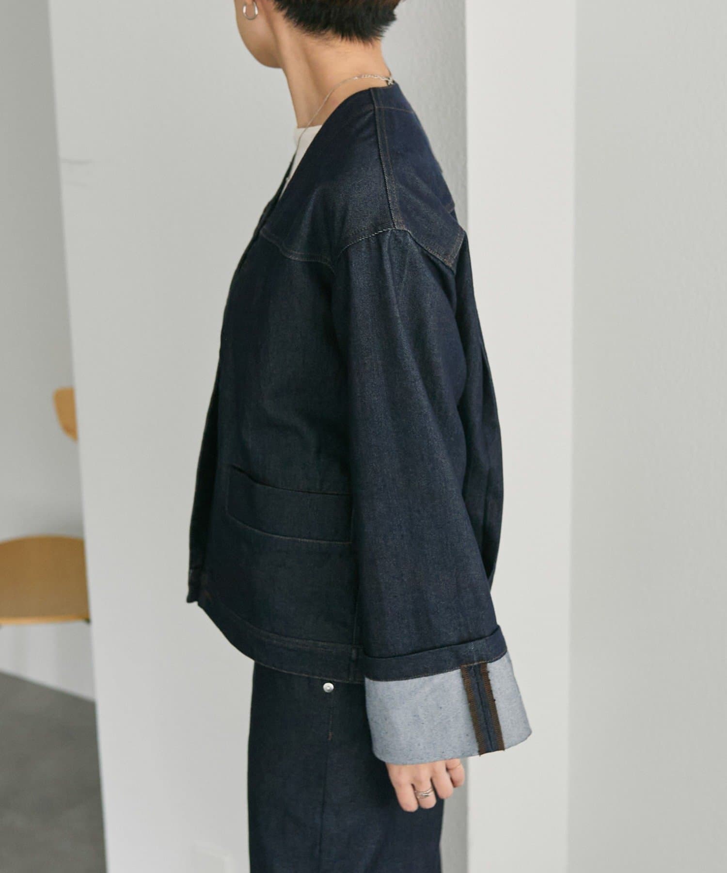 《ノーカラー》Vネックデニムジャケット【SUM1 STYLE(スミスタイル)】