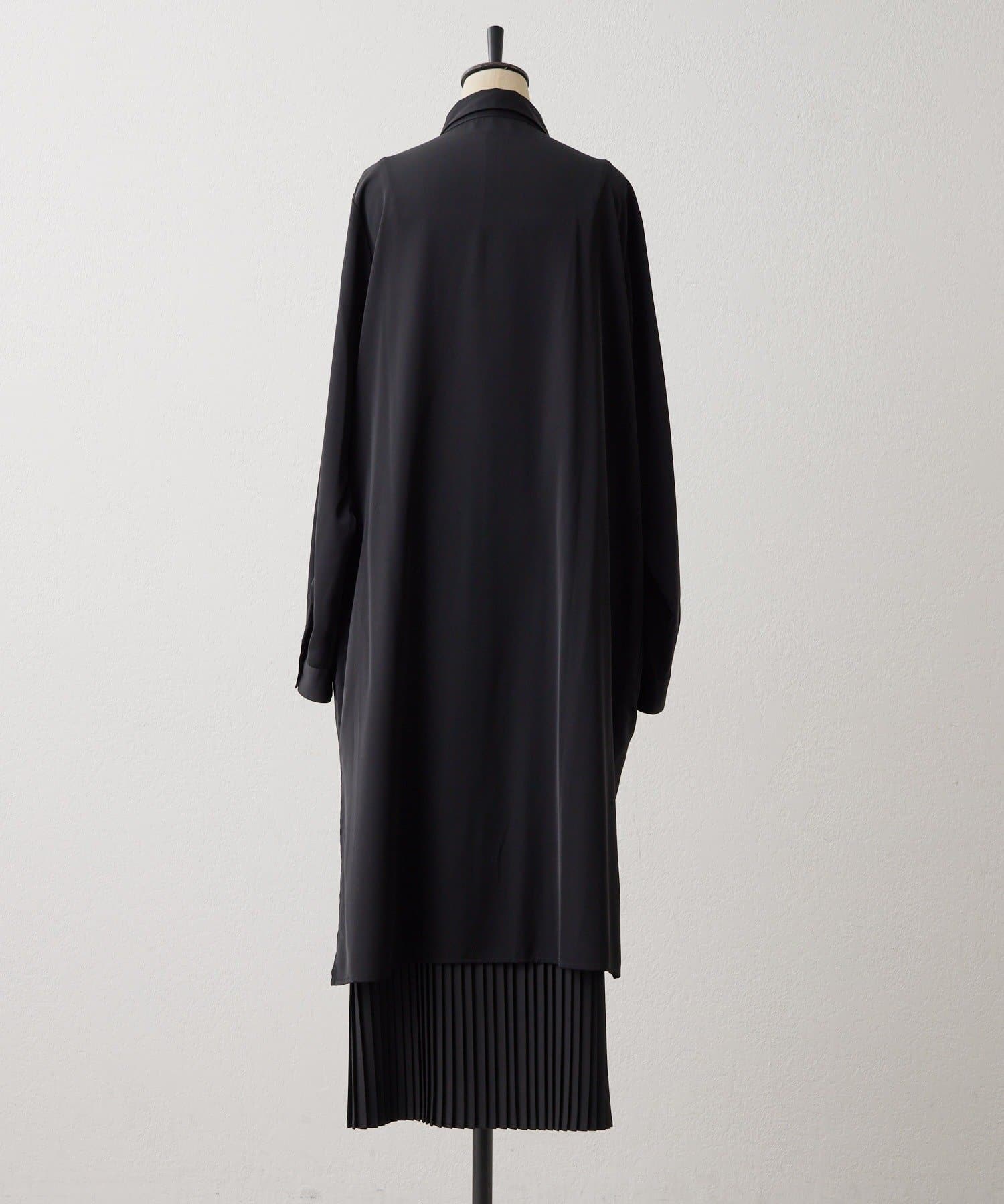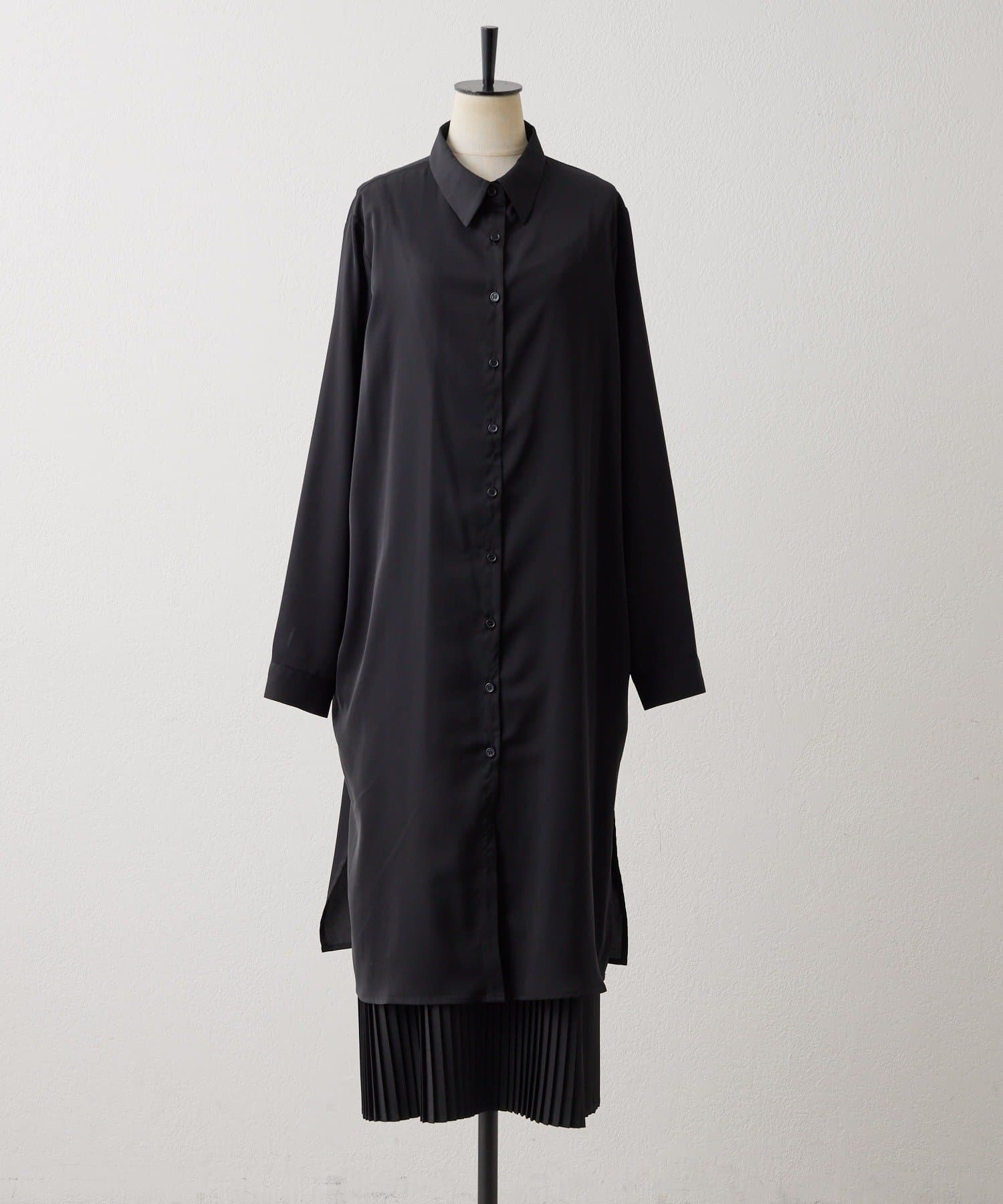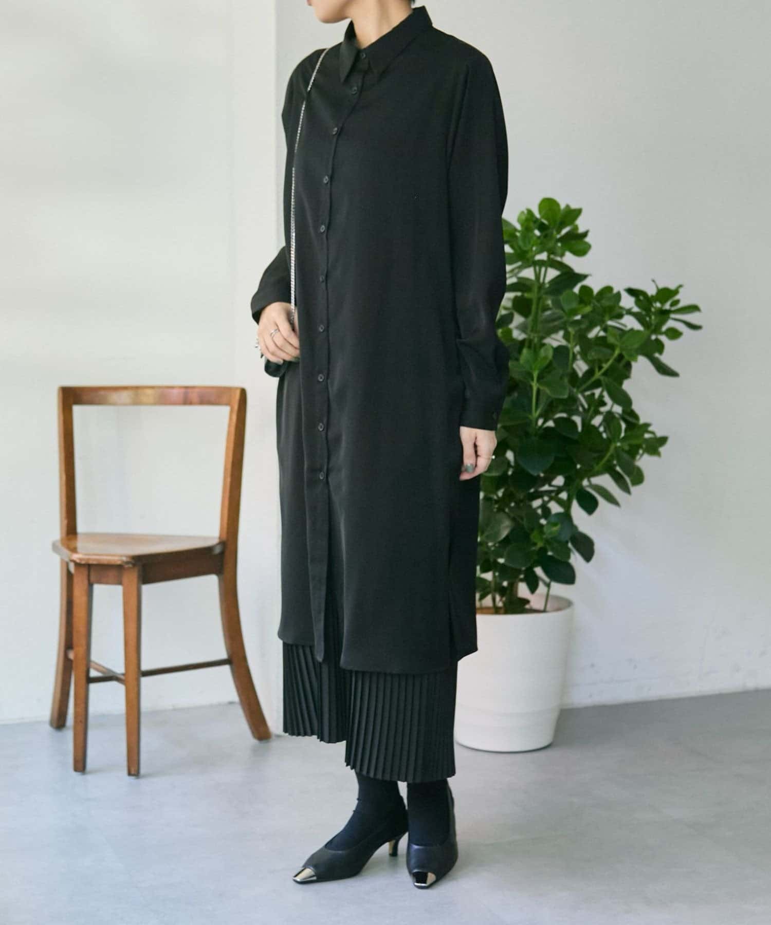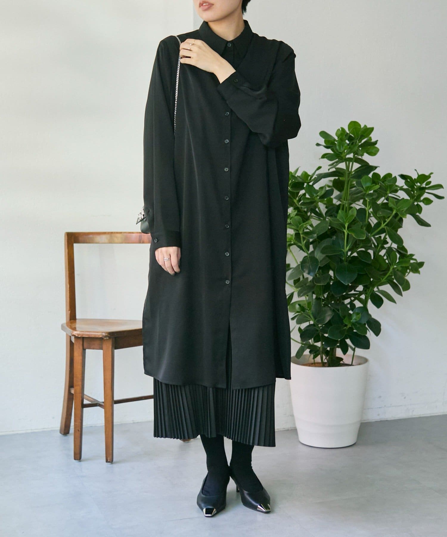 ・ロング丈のシャツワンピと縦ラインを強調するプリーツですっきり見え