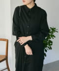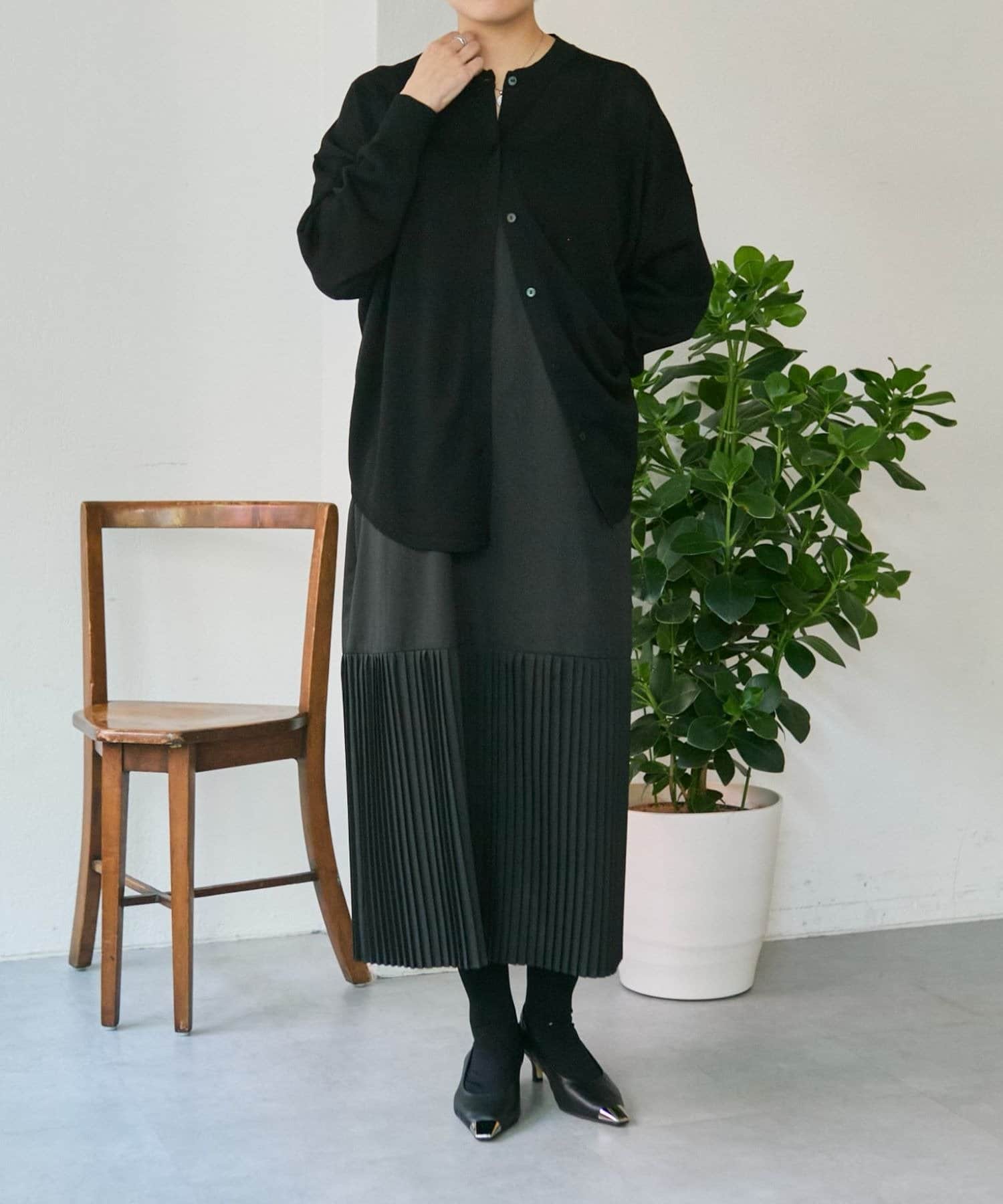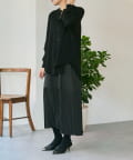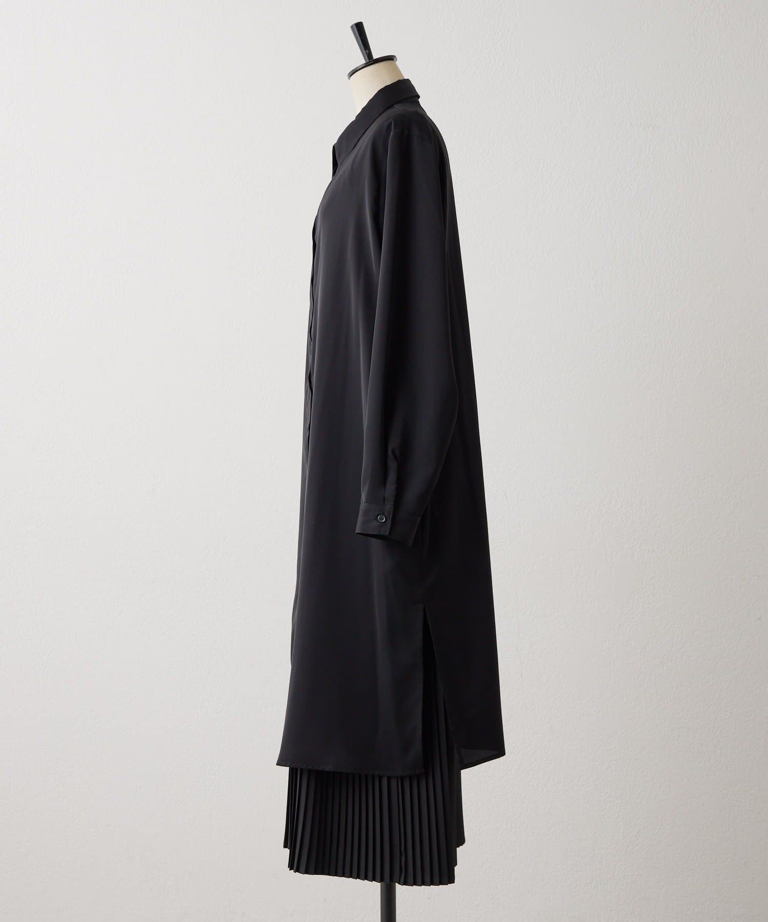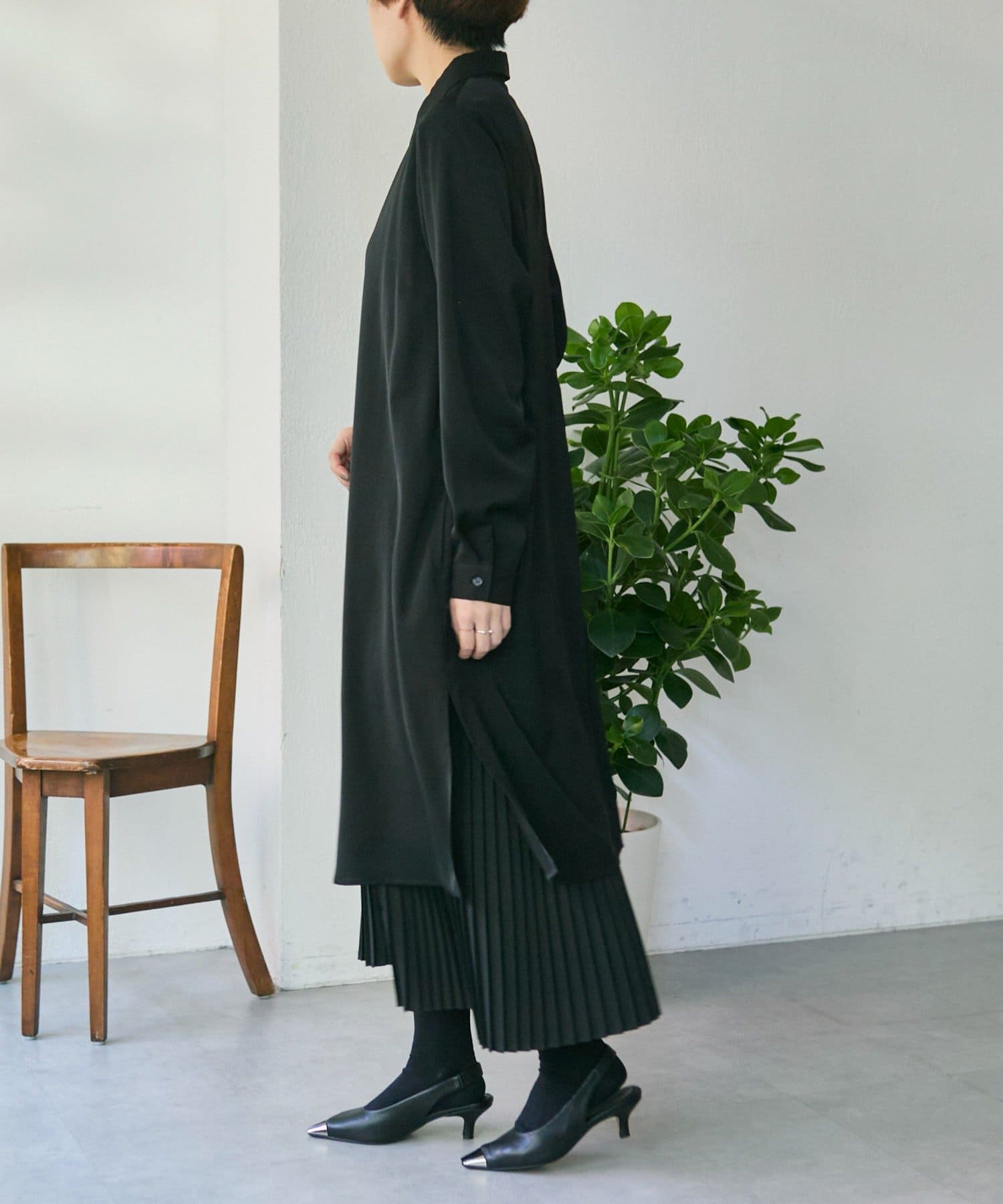 ・ロング丈のシャツワンピと縦ラインを強調するプリーツですっきり見え