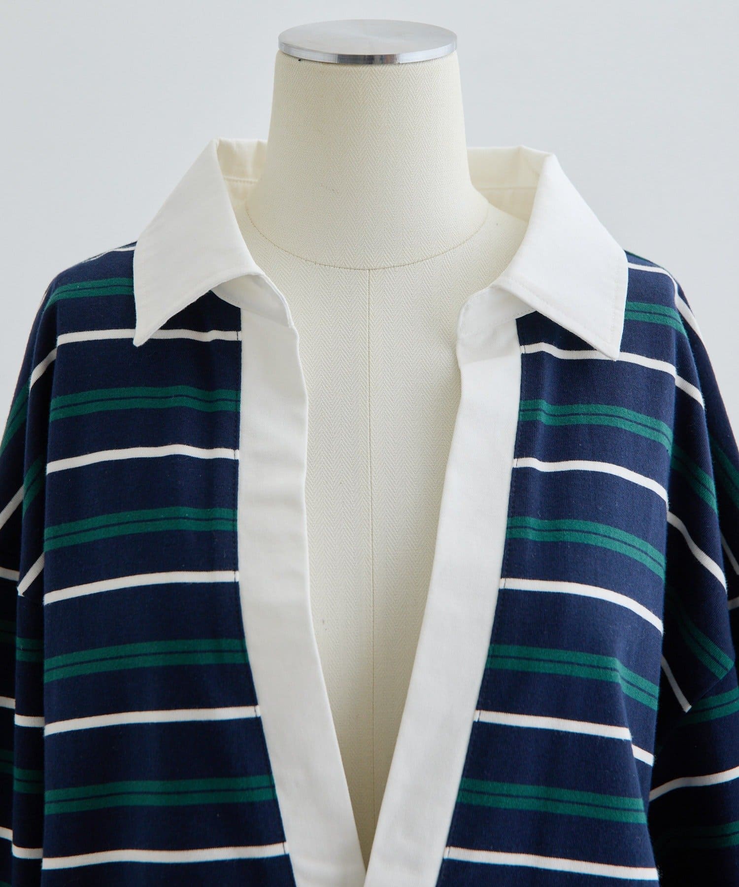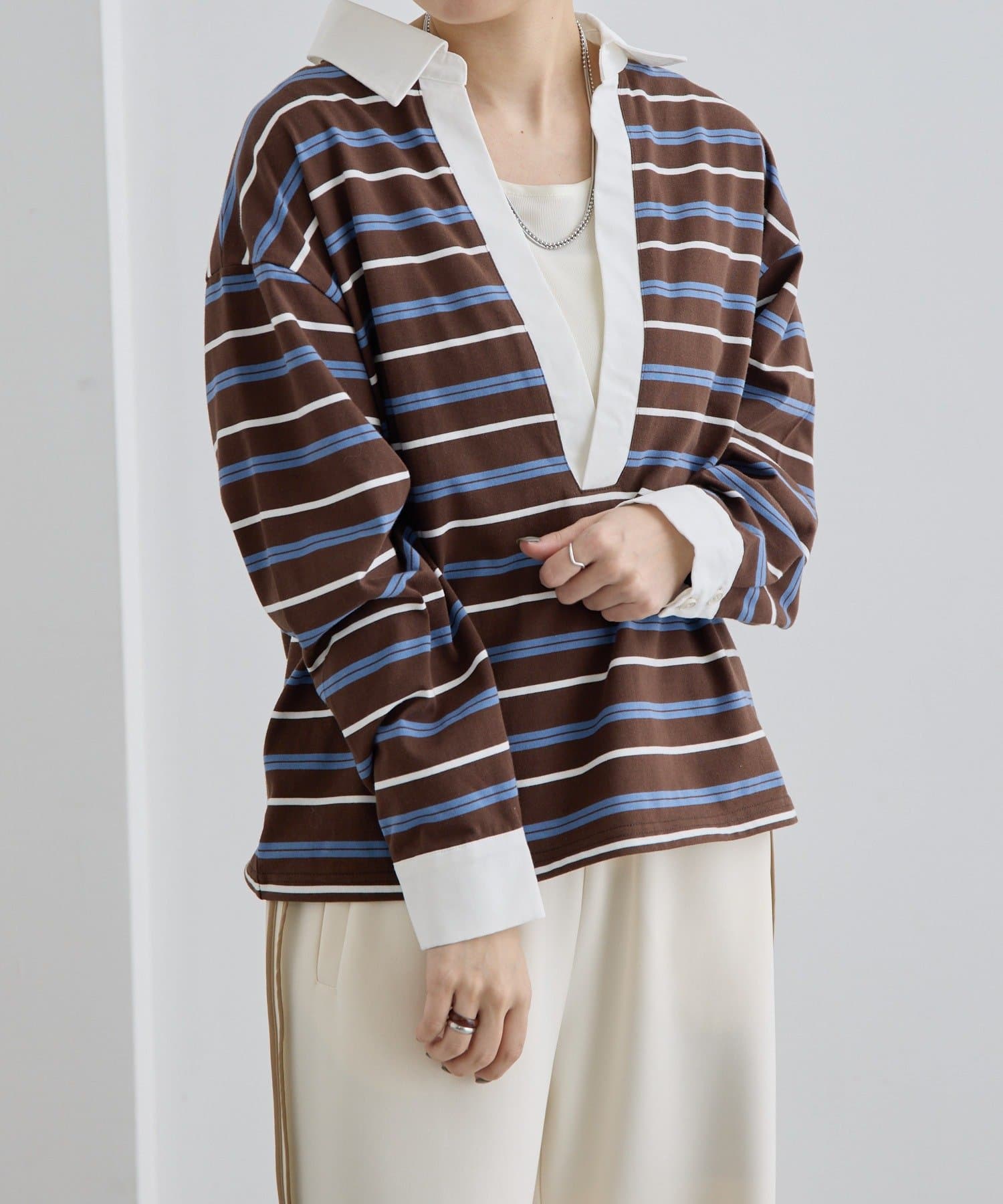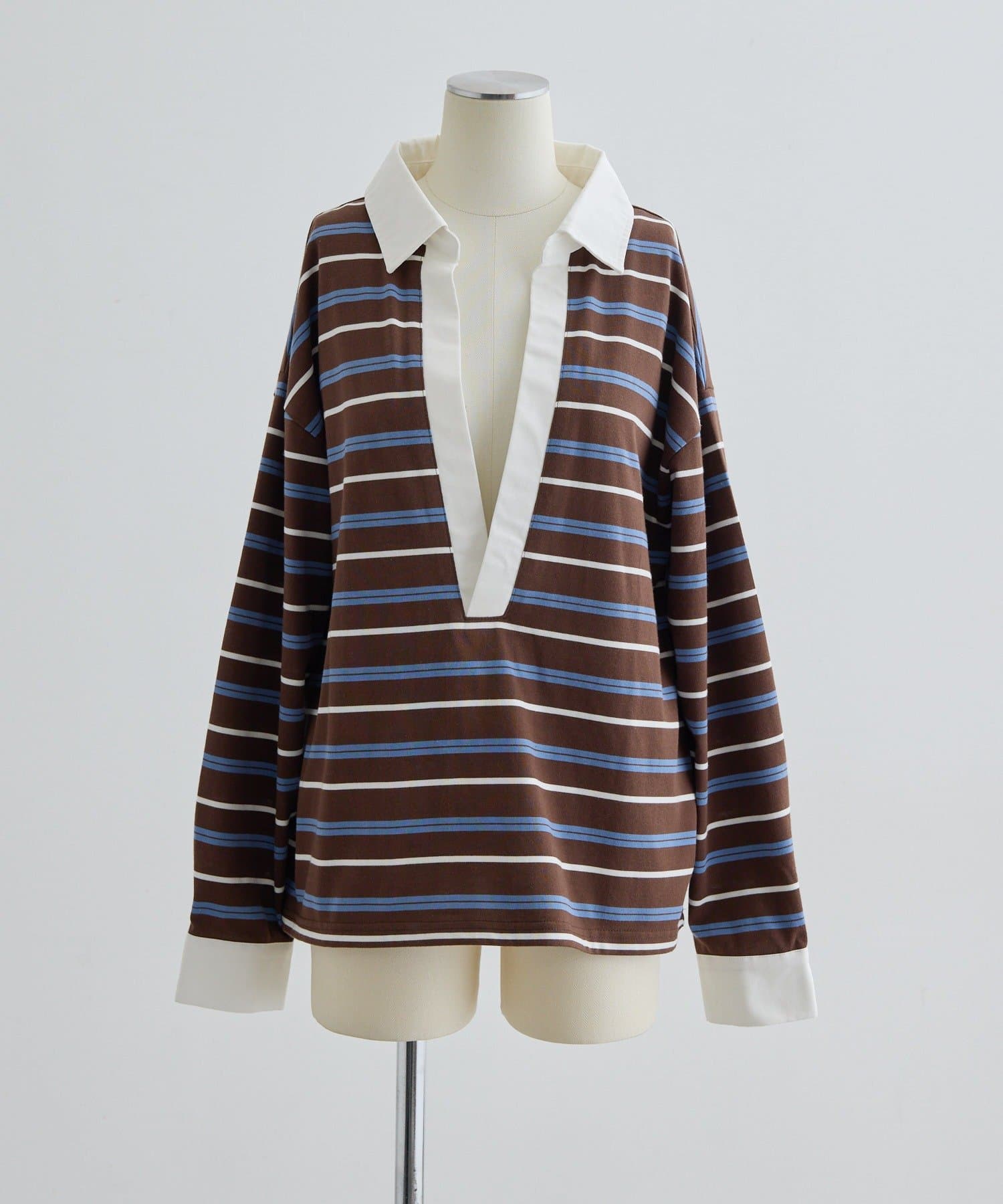 ・マルチボーダー柄に襟付きの深Vネックがポイントのトップス