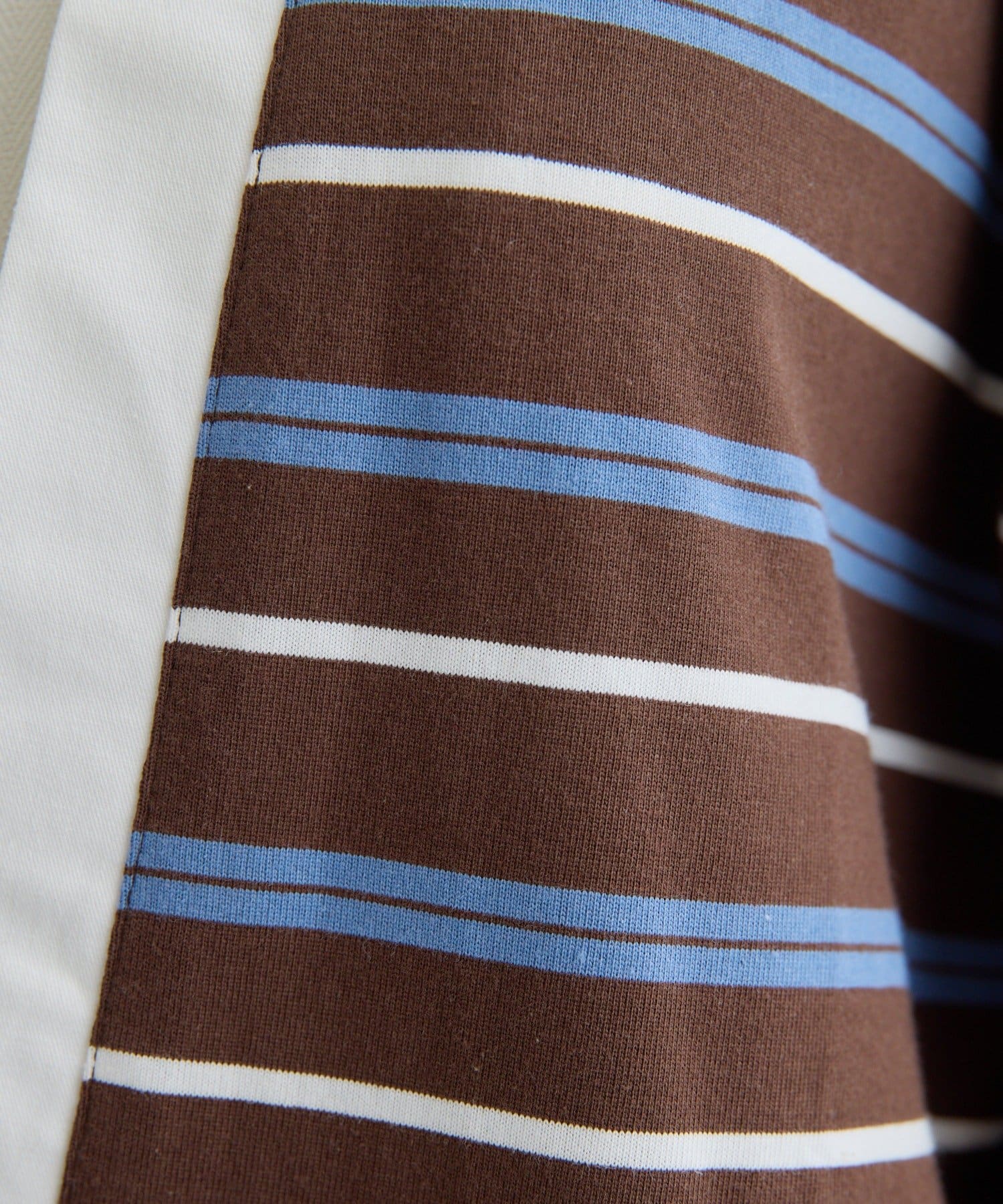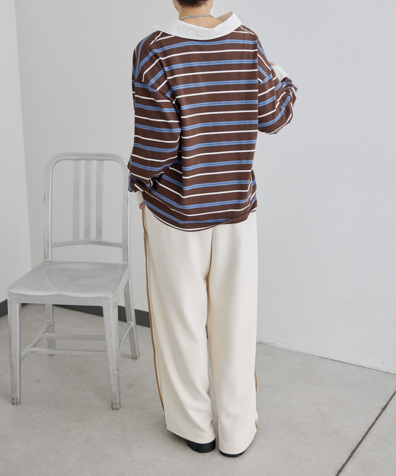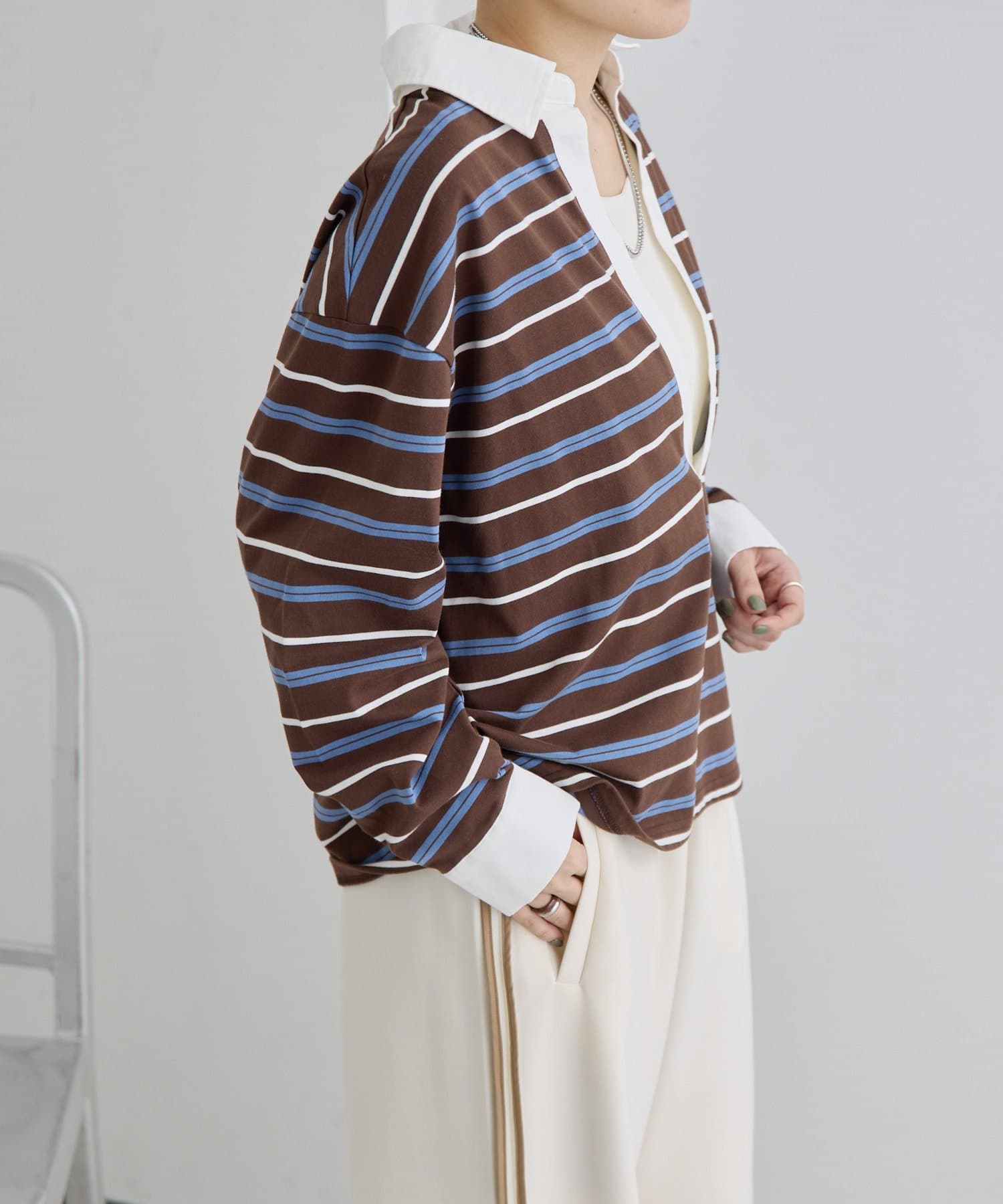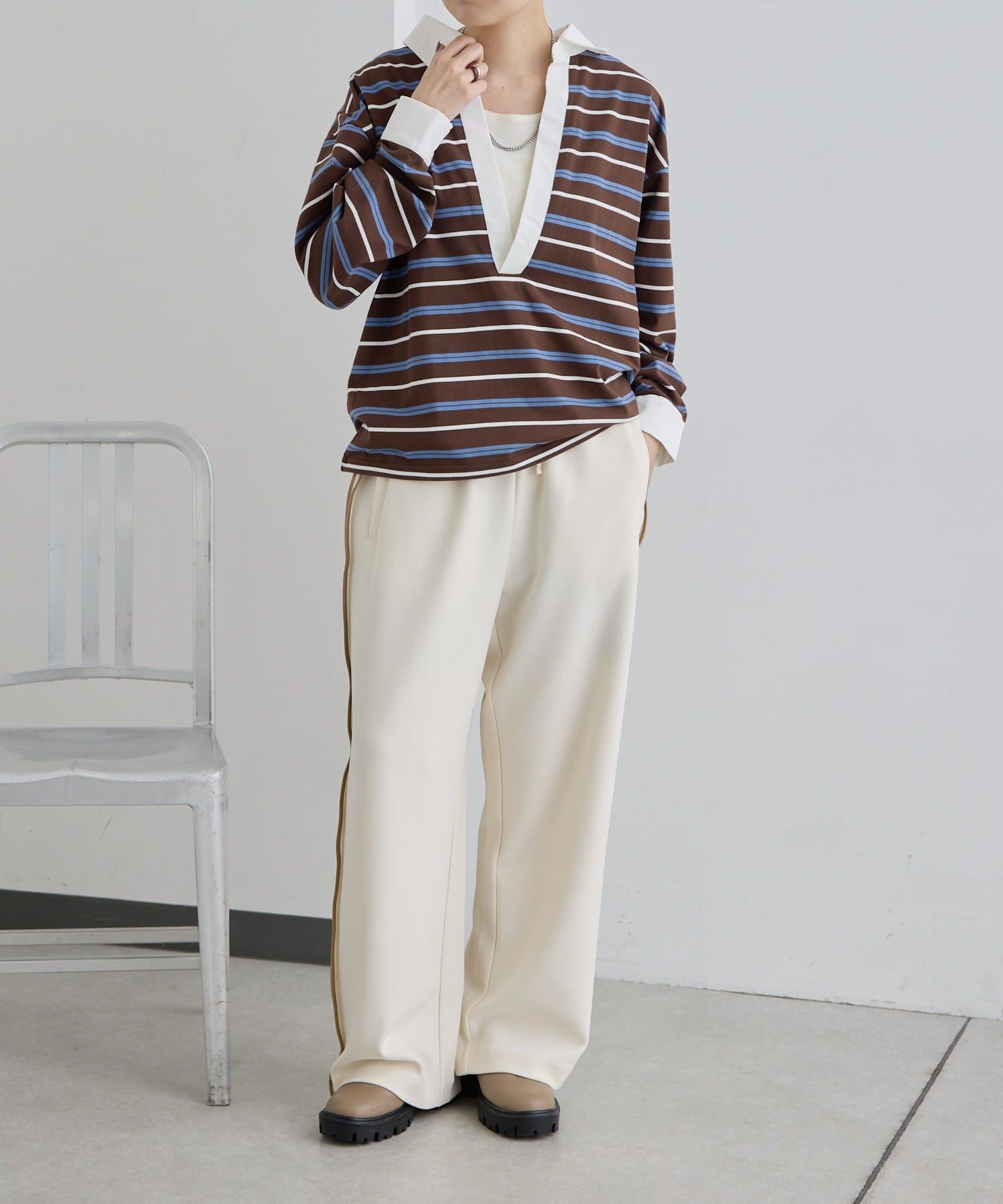 ・マルチボーダー柄に襟付きの深Vネックがポイントのトップス