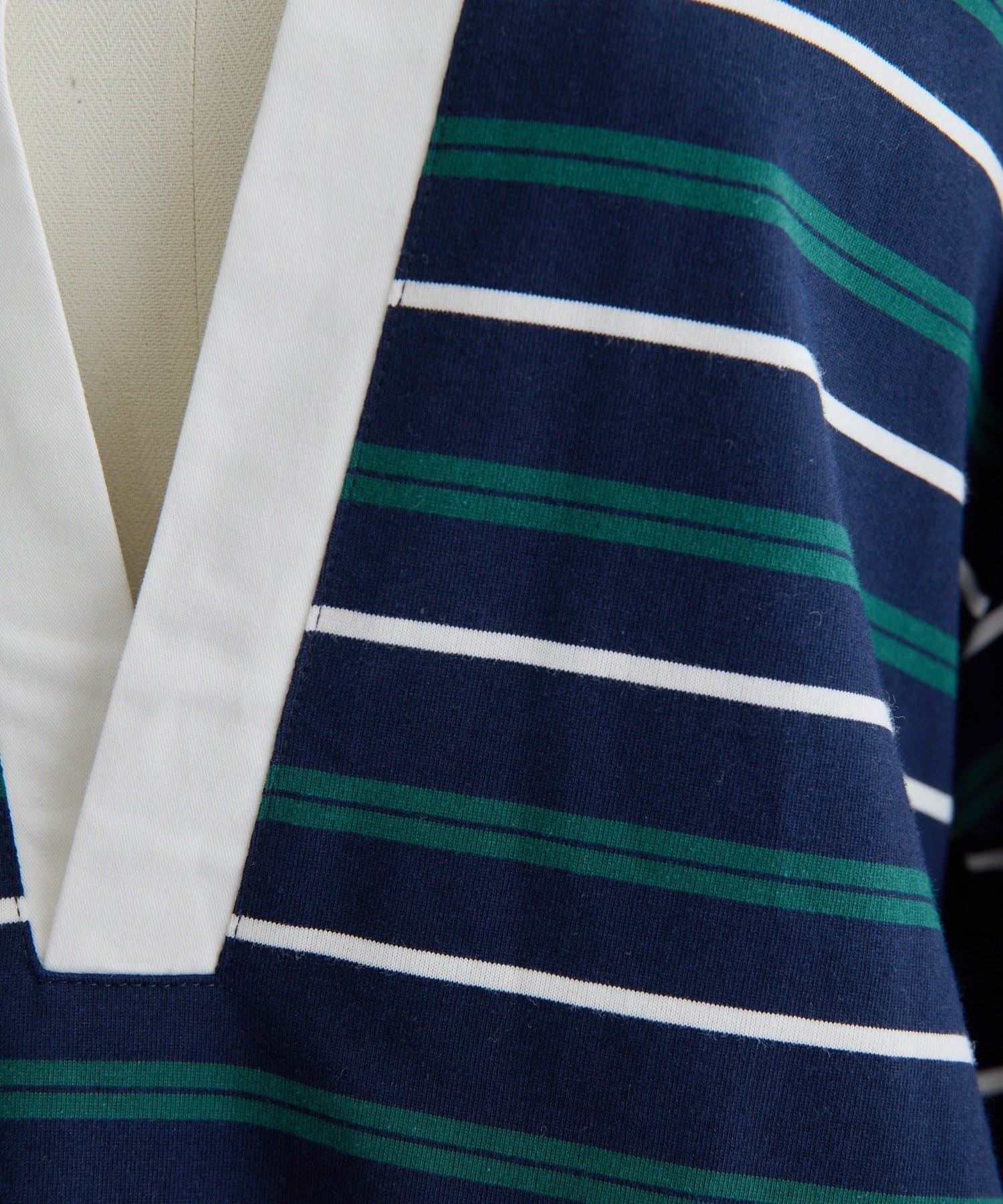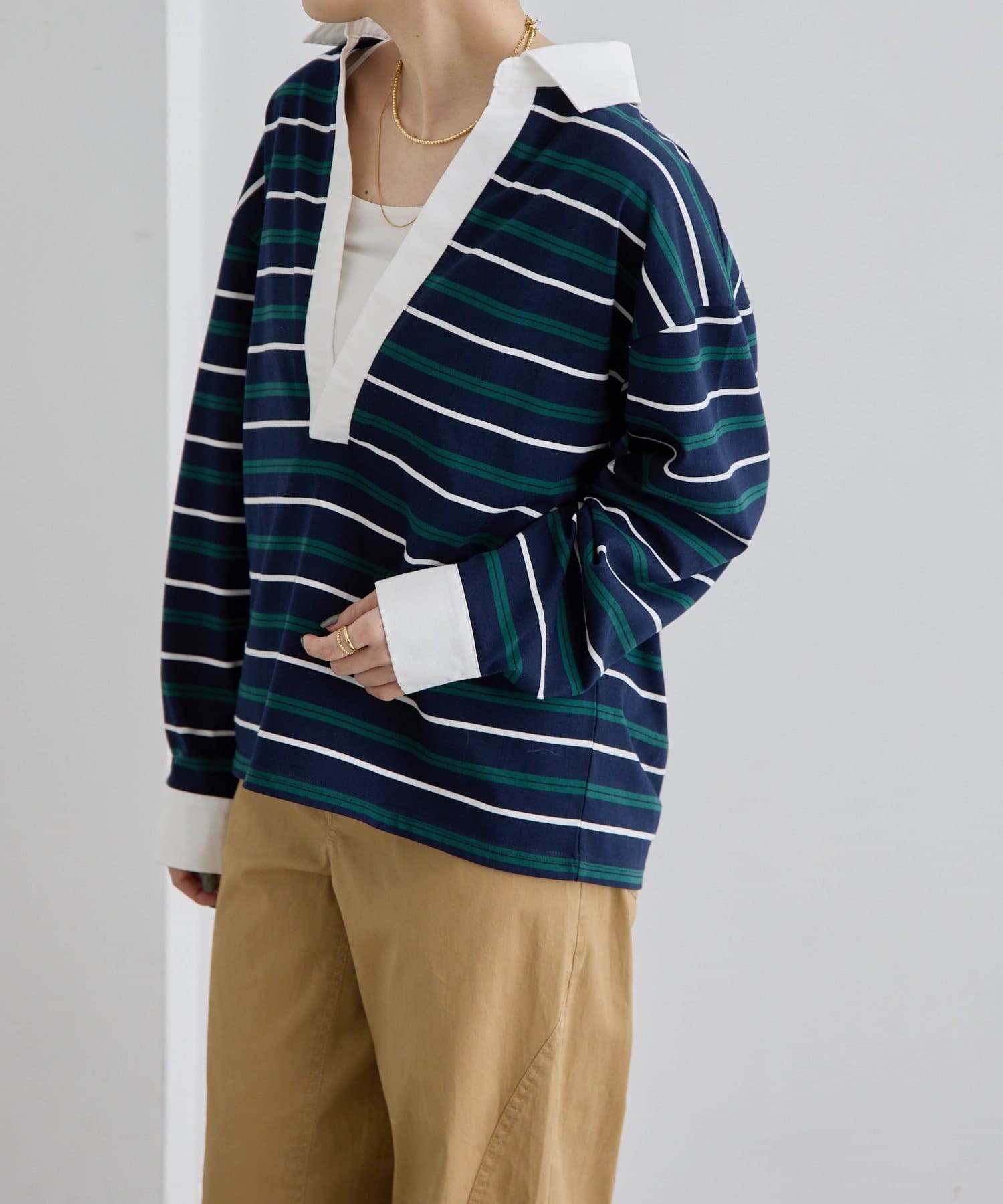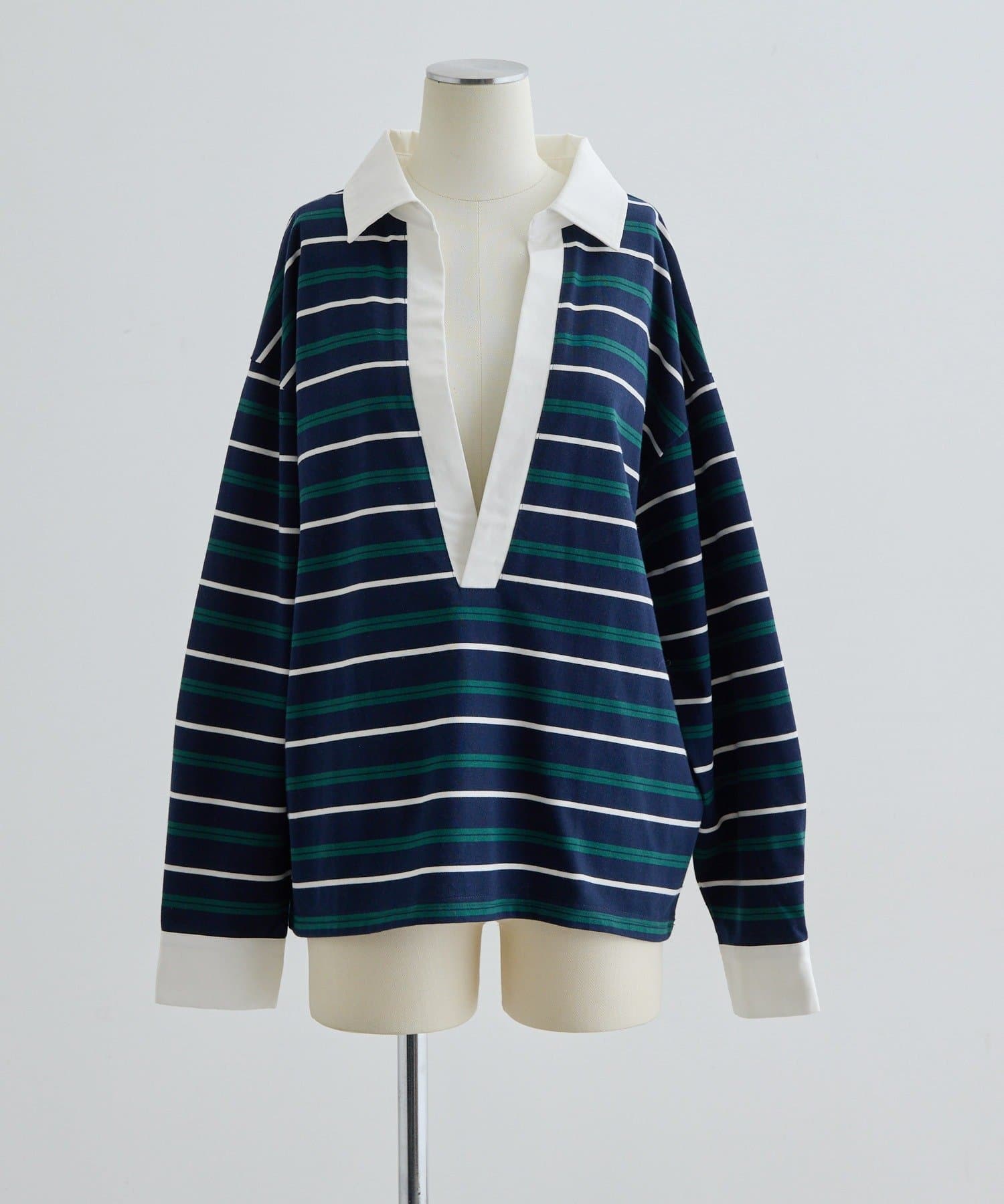 ear PAPILLONNER(イア パピヨネ) 《深Vネックでお顔周りすっきり》ボーダーポロシャツ【SUM1 STYLE(スミスタイル)】