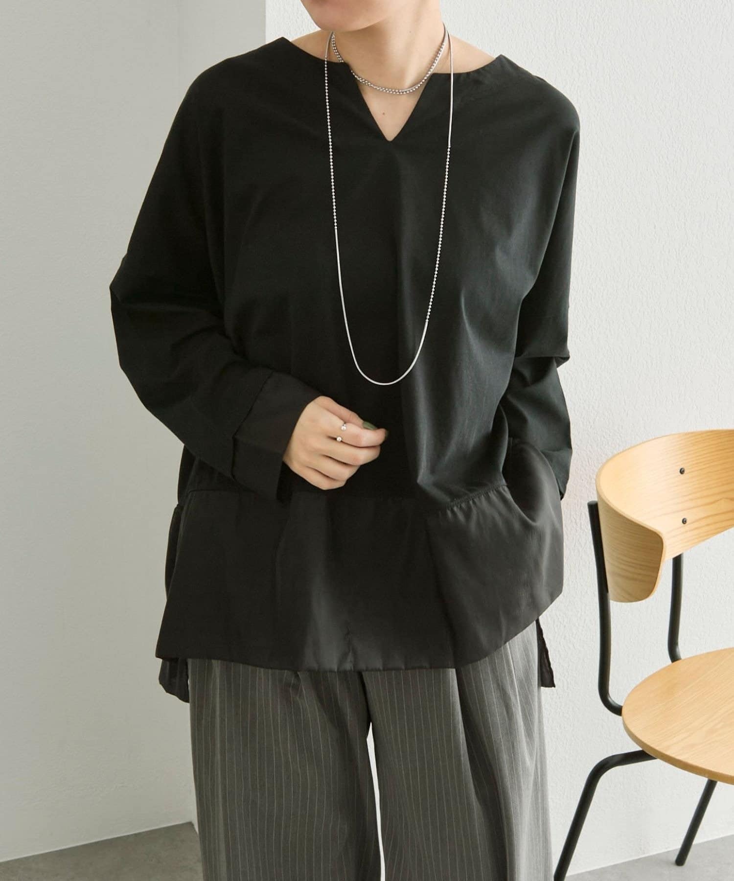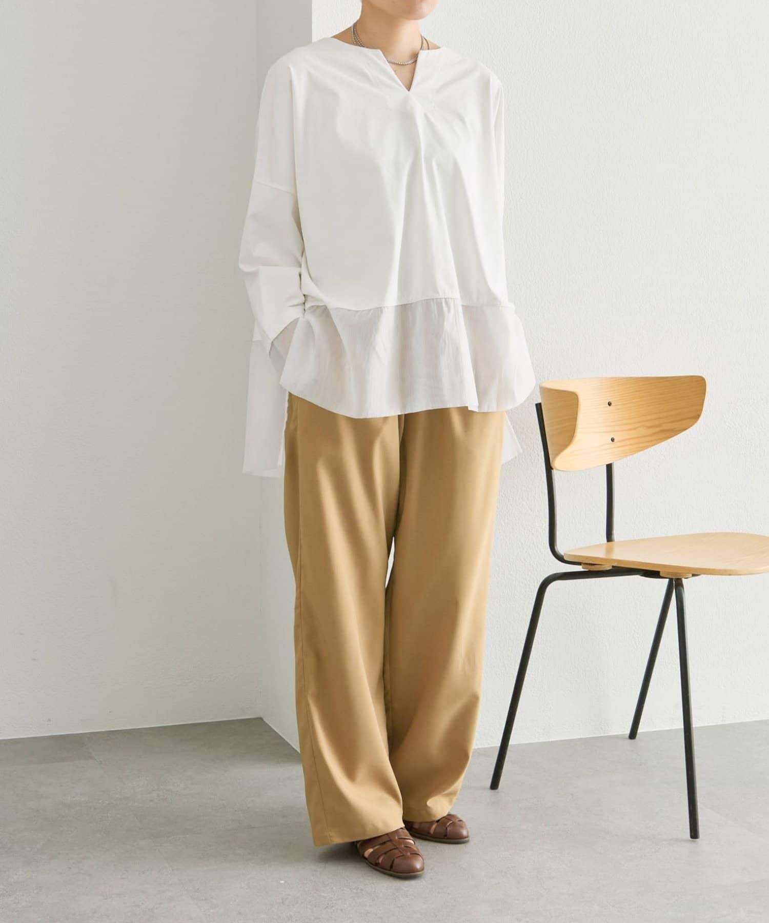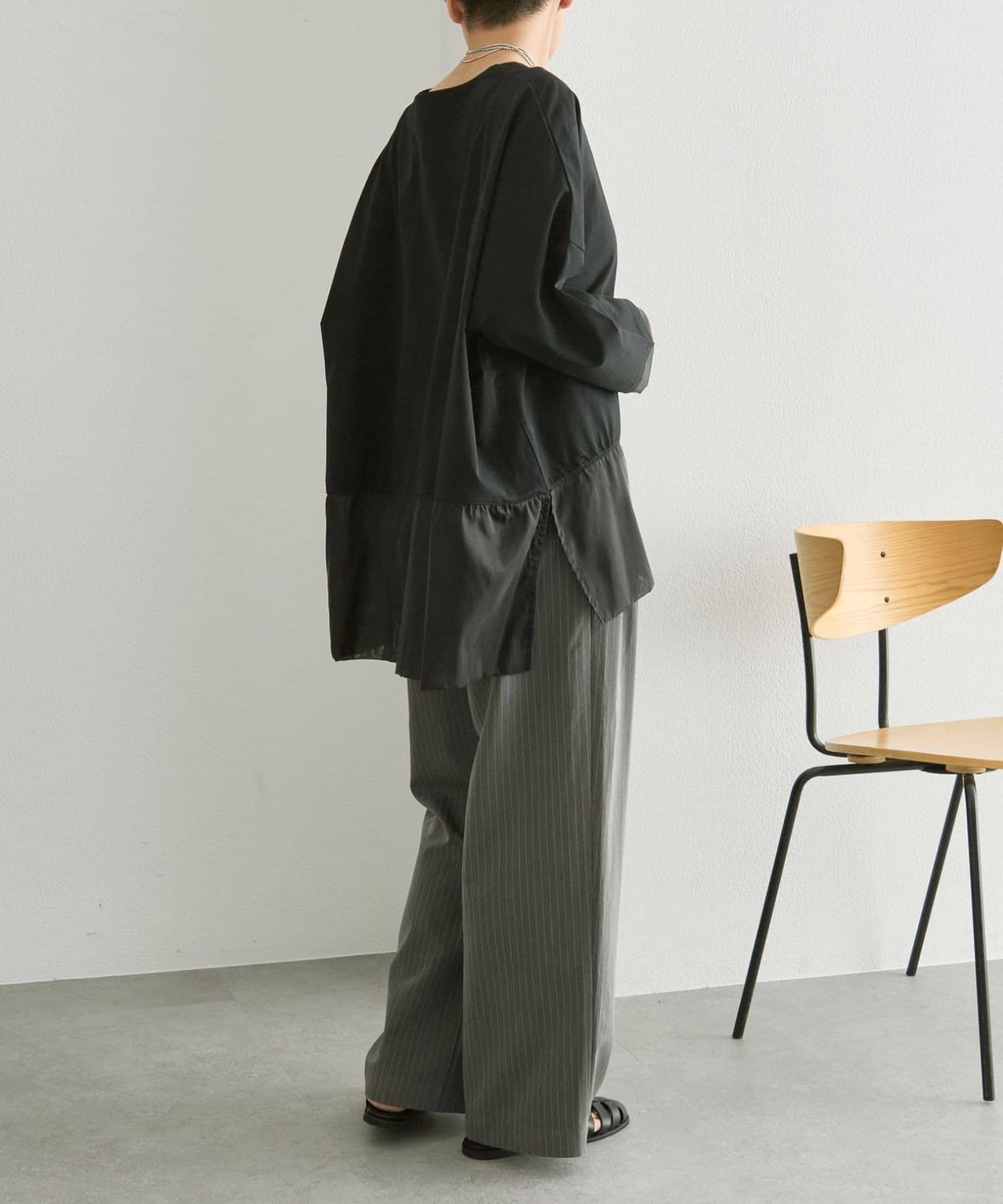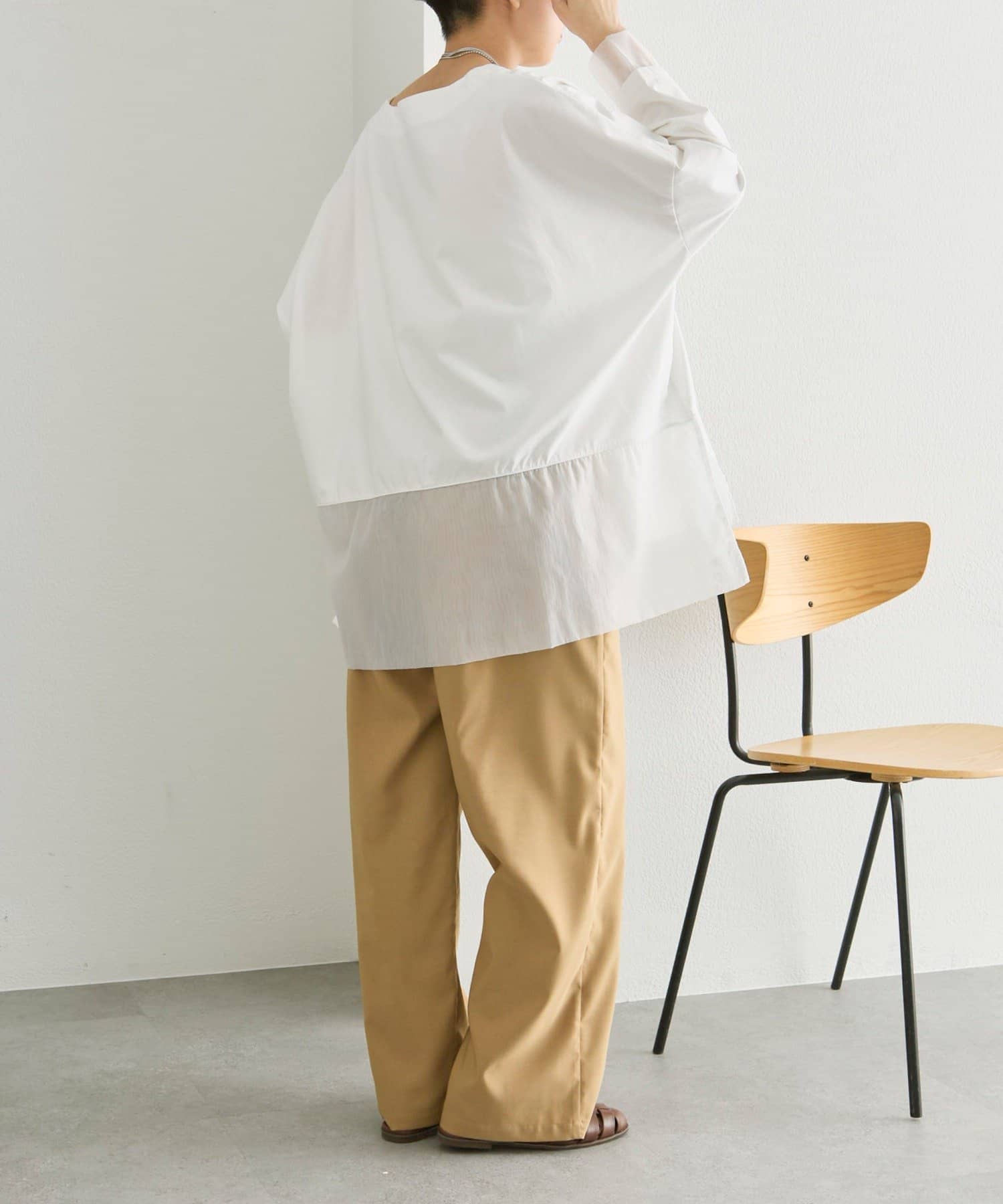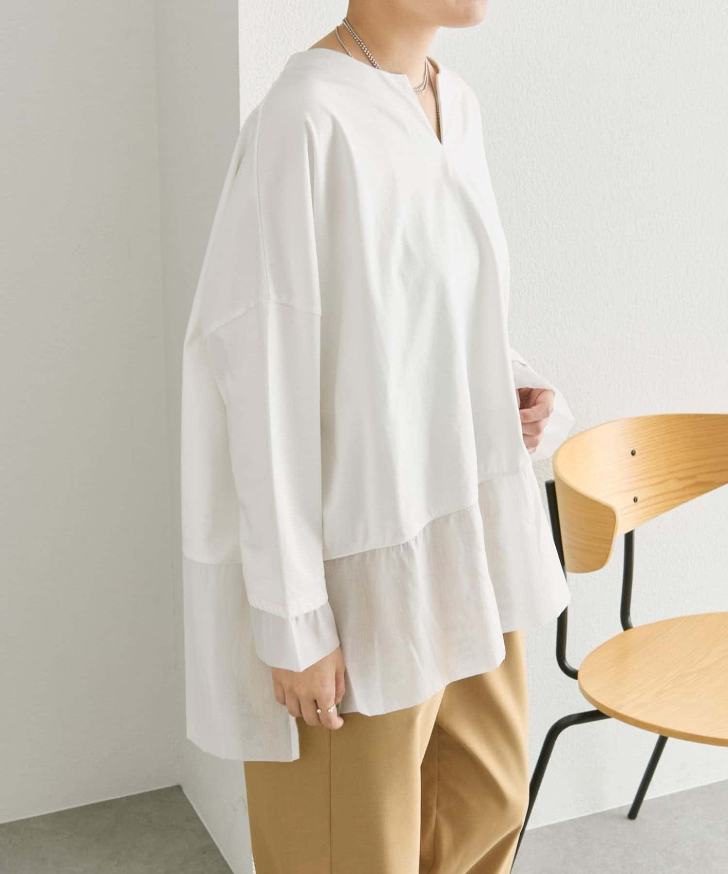 シアー素材を裾とサイドスリット入りで軽やかな印象で着ることができます。