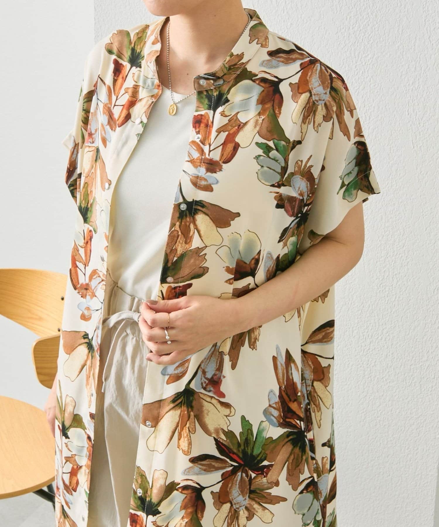 前開きで羽織として使うのもおすすめ。