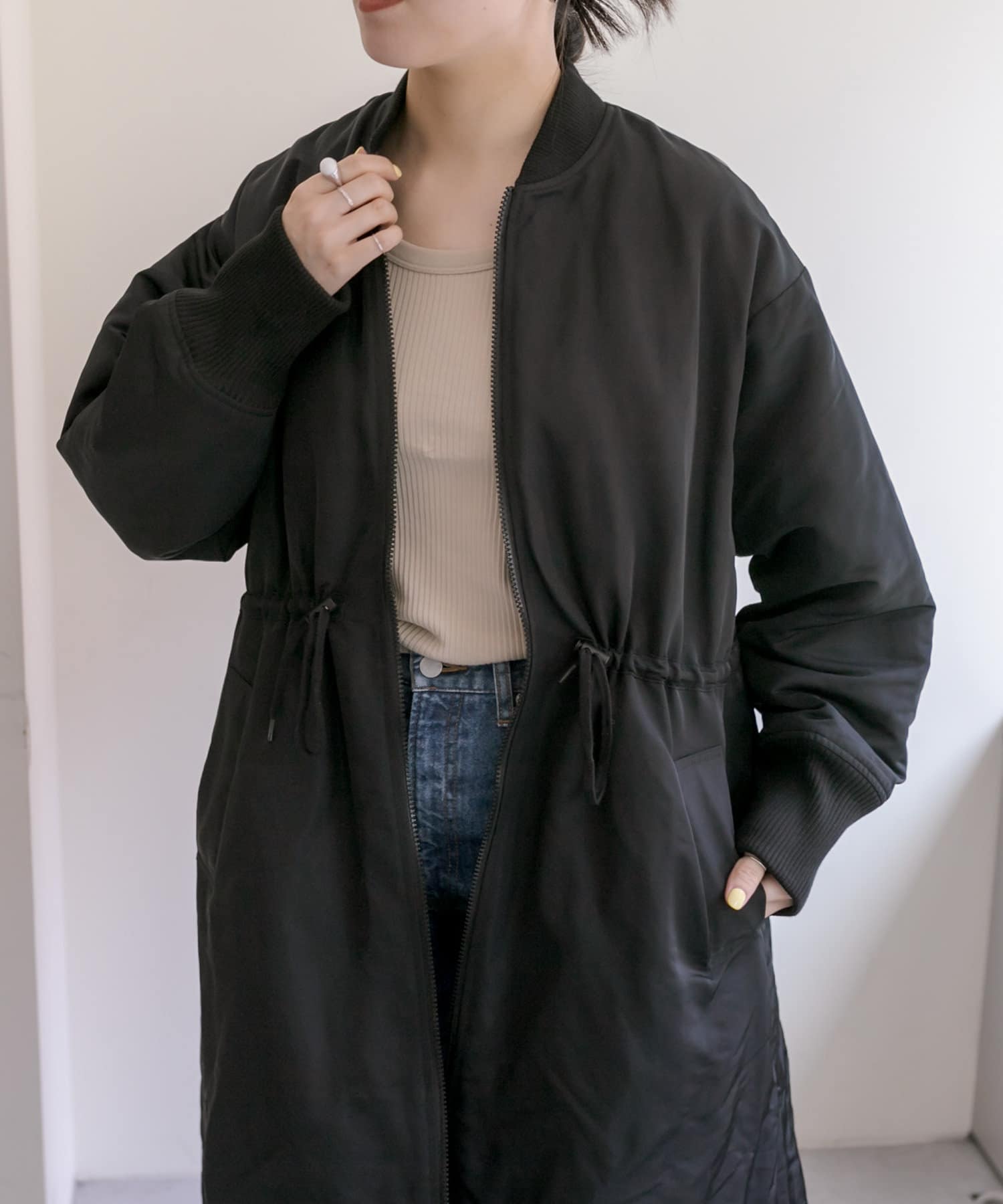ウエスト部分のドロスト紐を引いてくびれを作ることでエレガントさのあるレディライクな印象に仕上がります。