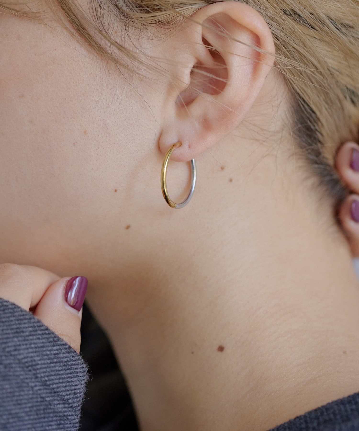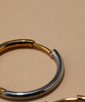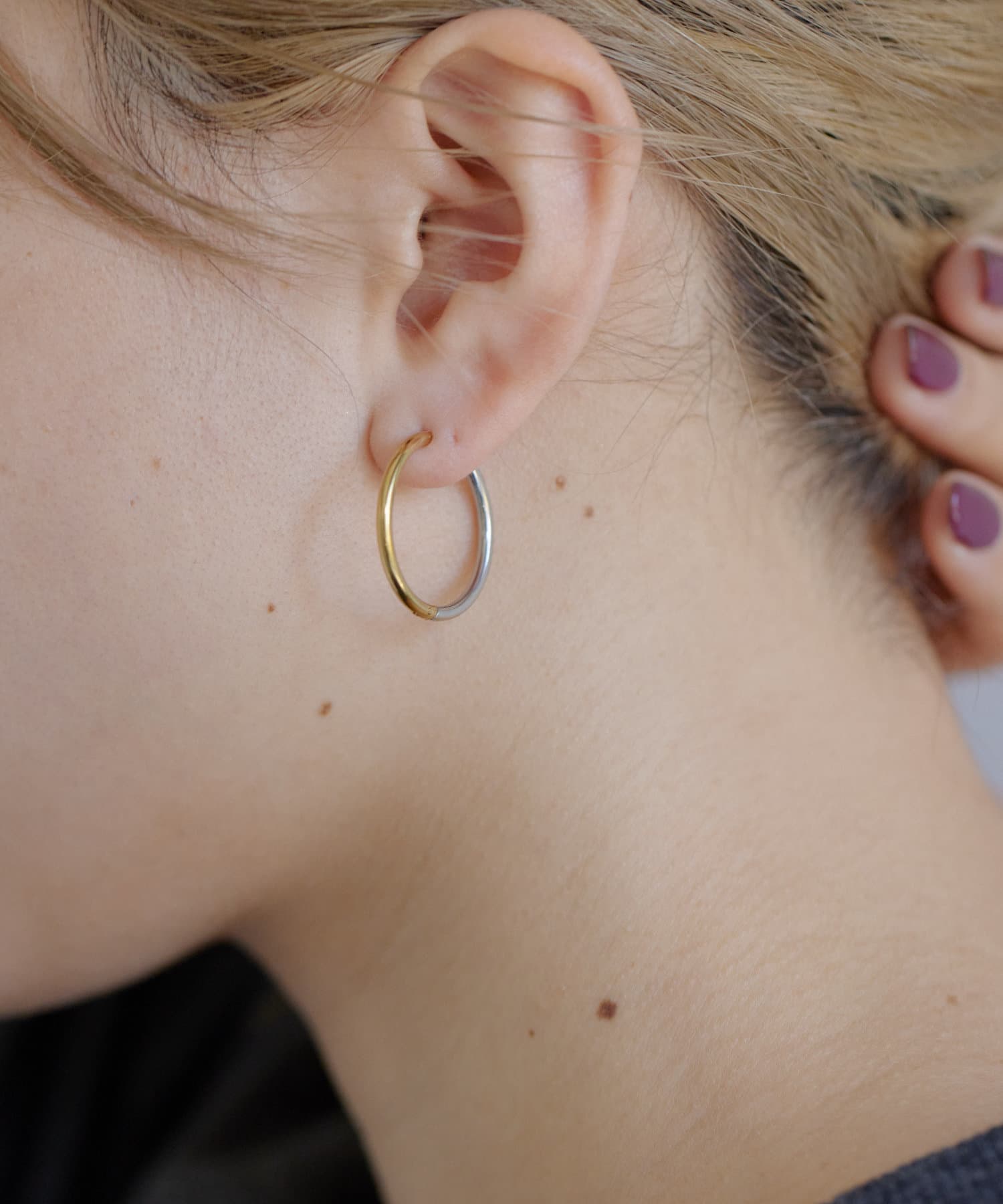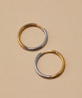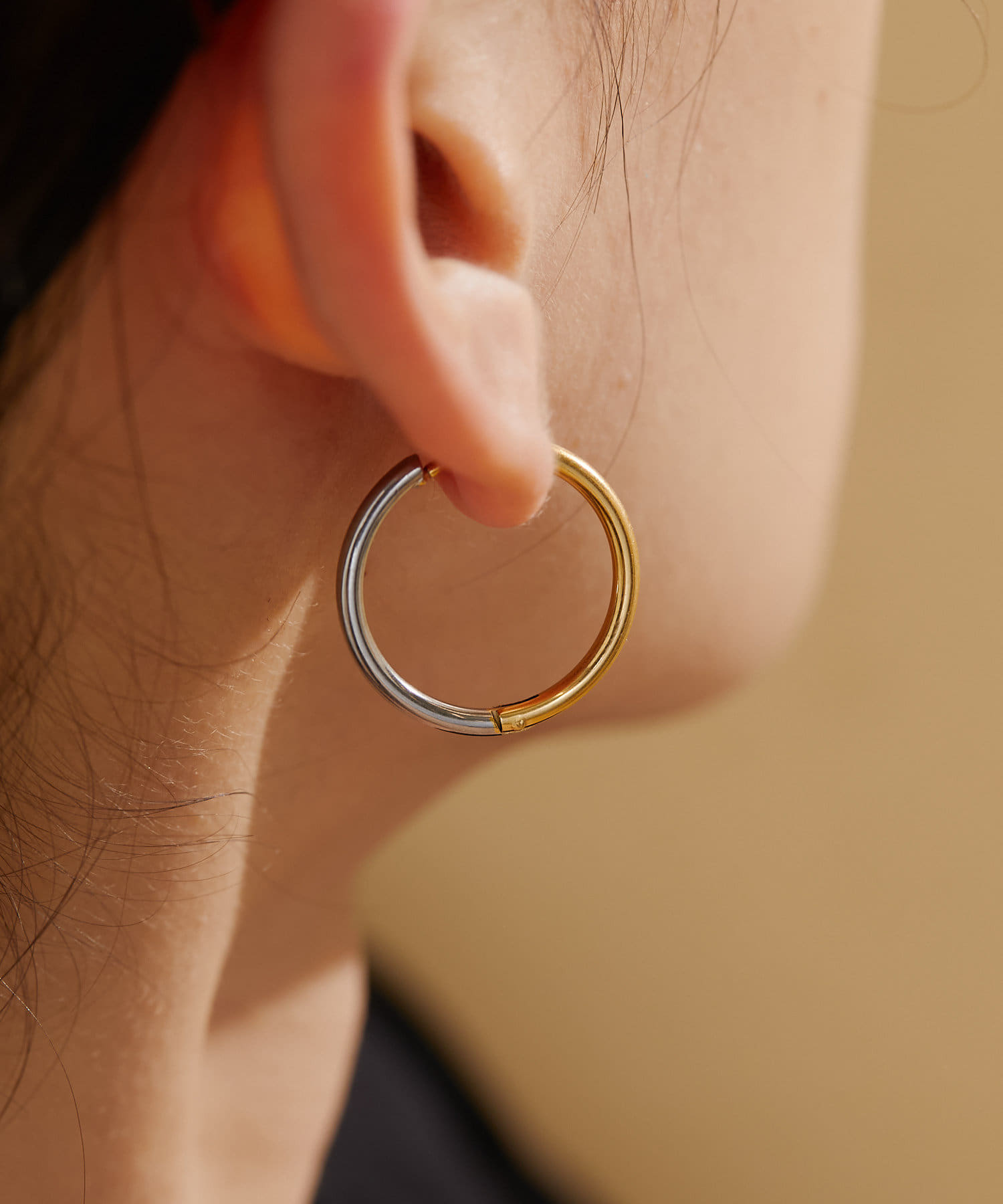 前後で色が異なるバイカラーのフープピアス。